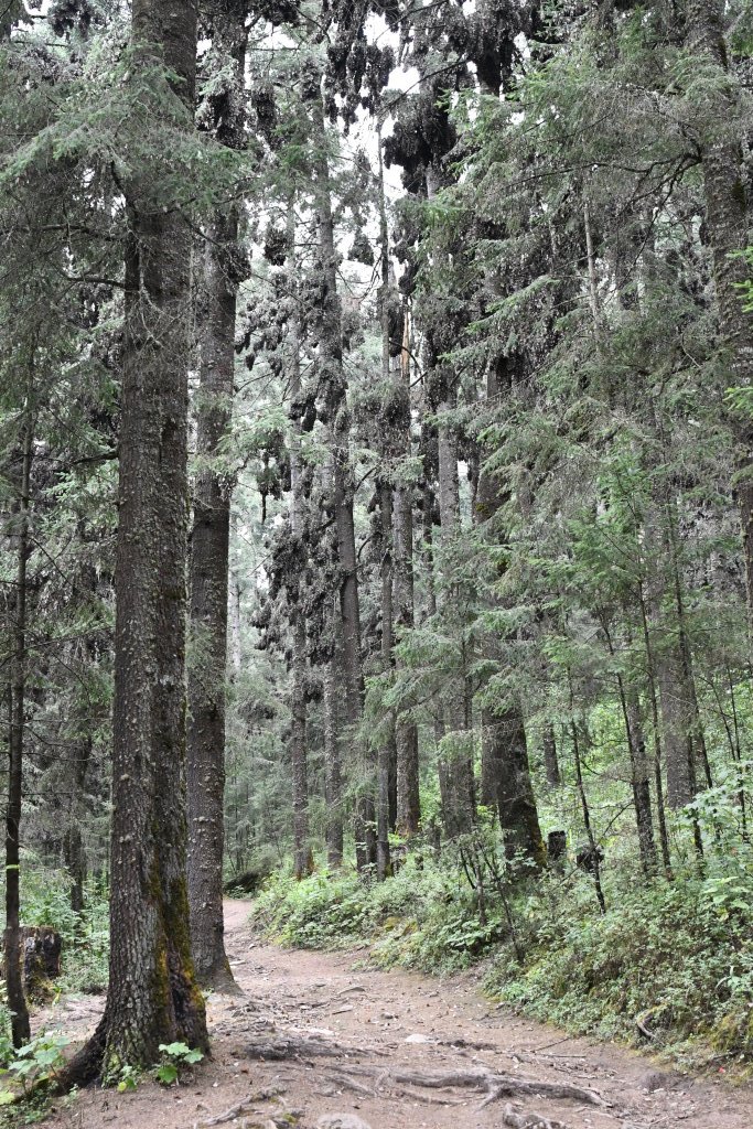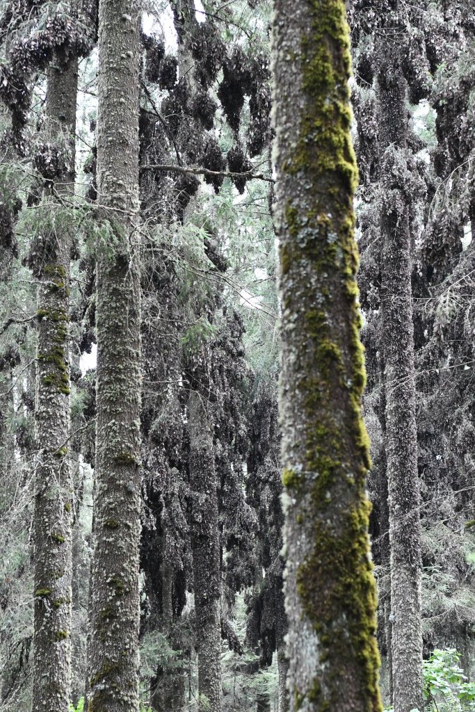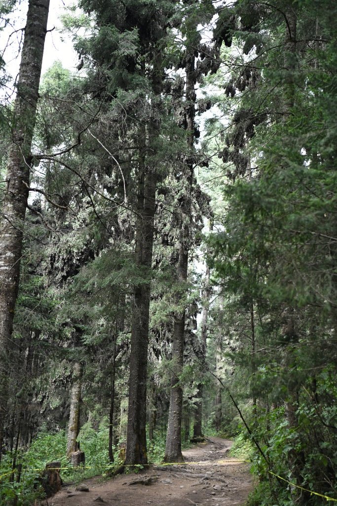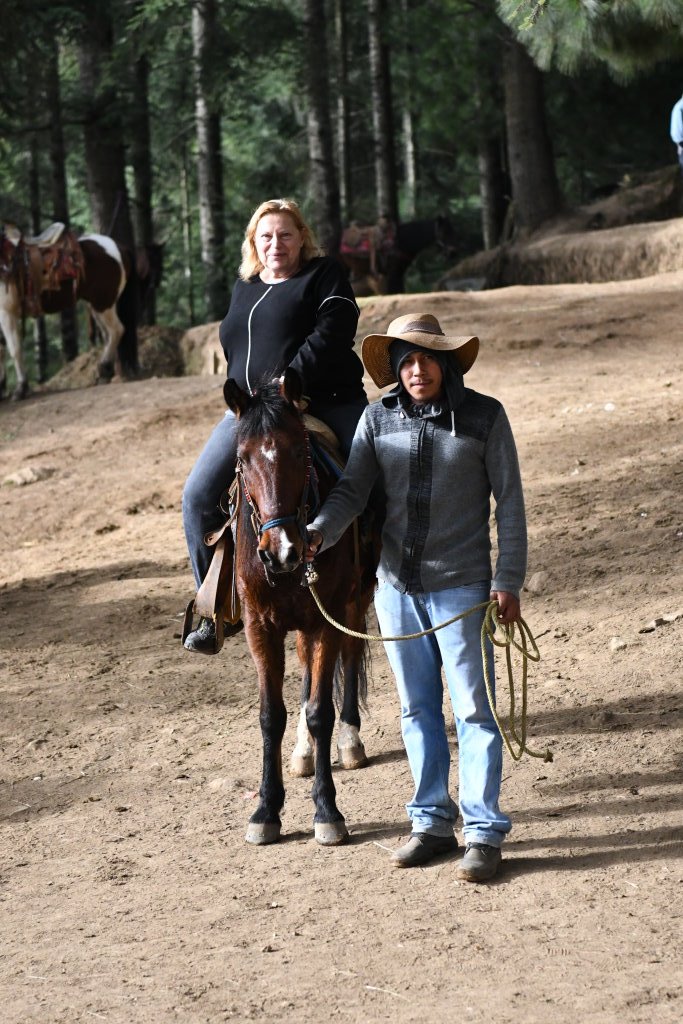 Das Angebot können oder wollen wir nicht ablehnen und eine knappe halbe Stunde später sind wir bei den Schlafbäumen der Monarch-Falter. Die Pferde haben wir auf einer Lichtung zurückgelassen und sind die restlichen 5-10 Minuten zu Fuß weitgehend ebenerdig durch den Wald gegangen.