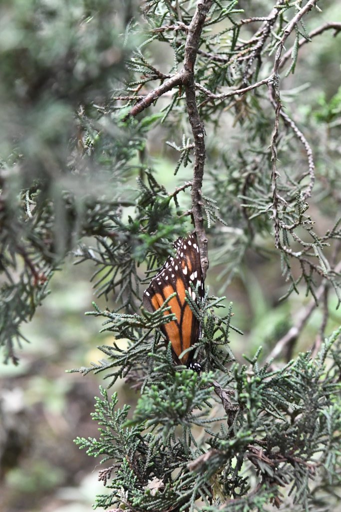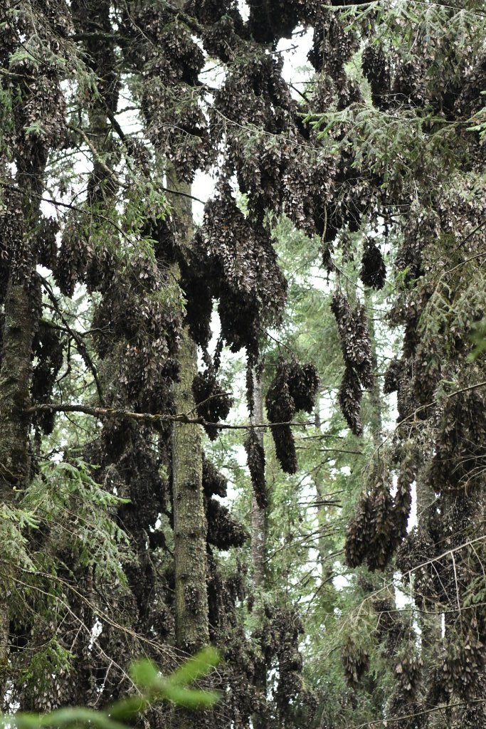 Und dann sieht man sie auch schon. Die Schmetterlinge hängen in dicken Trauben von den Ästen der mächtigen Tannen. Es ist kalt hier oben, nichts bewegt sich zwischen den Ästen. Nur wenn am späten Vormittag zwischen ca. 10 und 1 Uhr die Sonne die Tiere ein wenig aufheizt, kommt Bewegung in die aus Abertausenden wie erstarrt an den Ästen klebenden Flügelberge. Einige sind auf den Waldboden gefallen und krabbeln mühsam durchs Unterholz. Zum Fliegen fehlt ihnen bei den kühlen Temperaturen die Kraft.