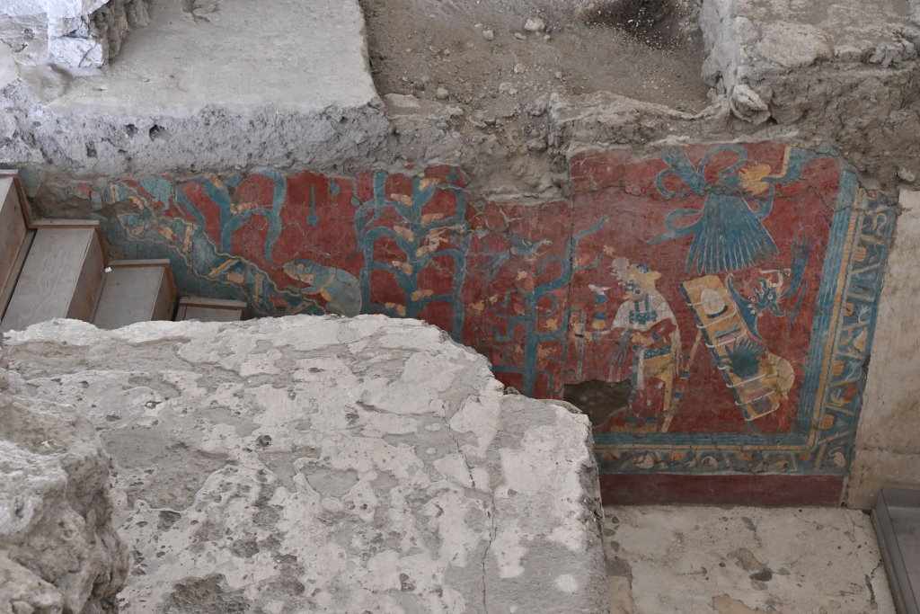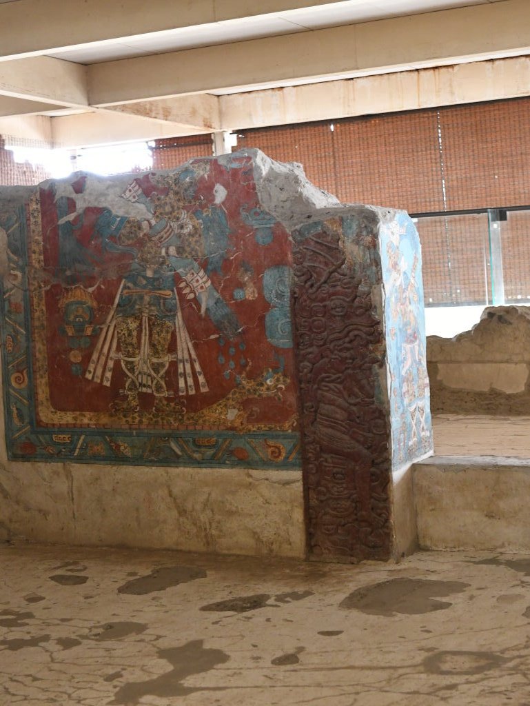Gemalt wurden die Bilder mit Naturfarben: Braun-Gelbe Pigmente wurden aus Erde, Schwarze aus Holzkohle, Grüne aus Kupferoxid, Weiße aus Kalkstein, und das leuchtende typische Maya Cyan Blau aus Ton gewonnen. Am eindrucksvollsten sind diese Farben in den beiden Fresken des „Gebäude A“ erhalten, die einen Jaguar- und einen Adler-Krieger zeigen.