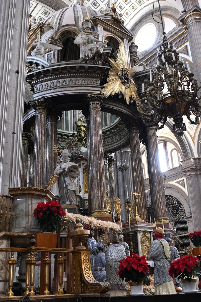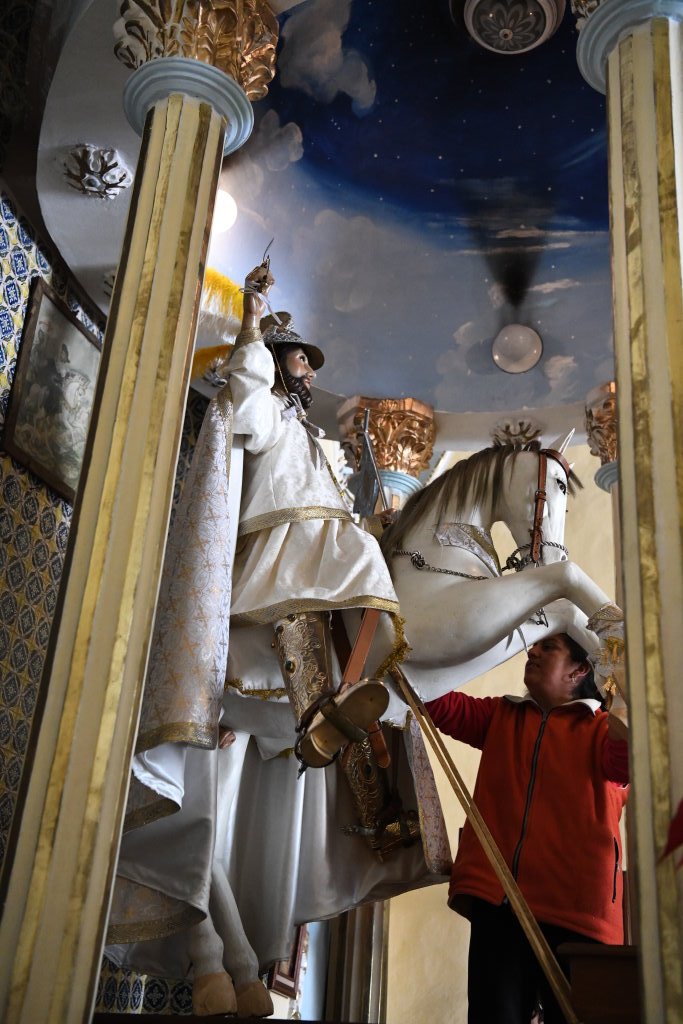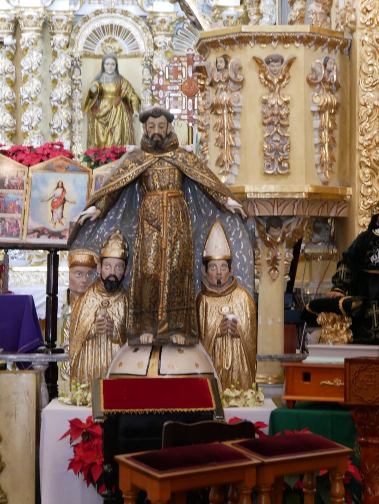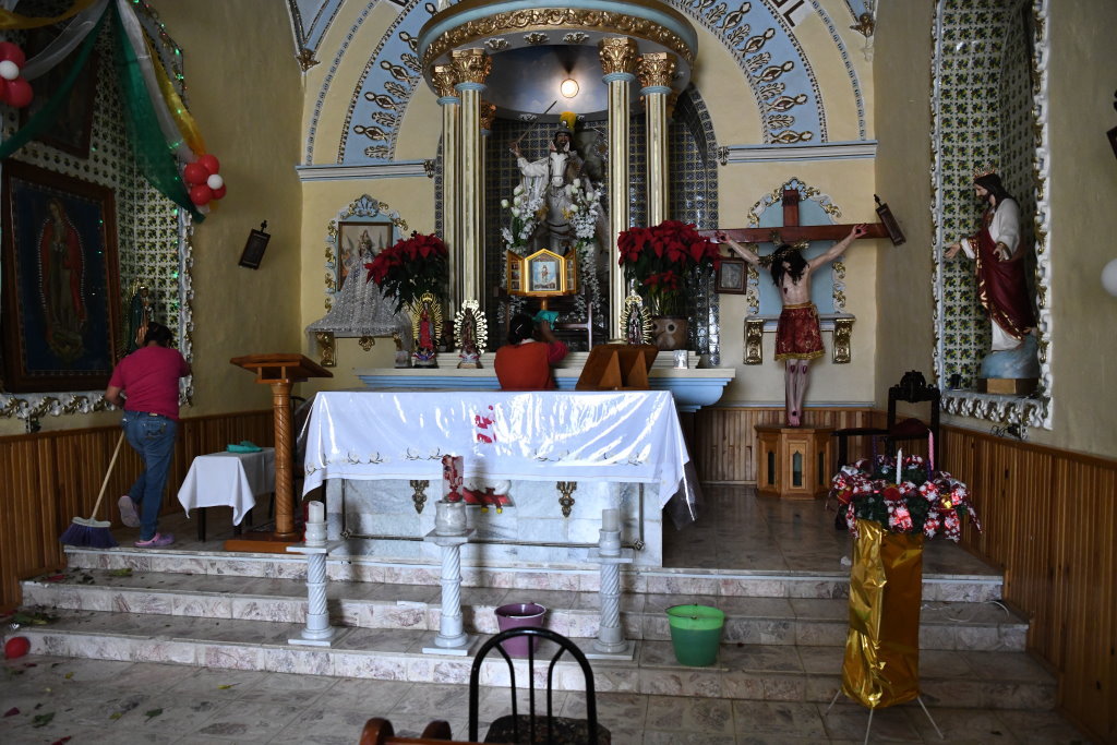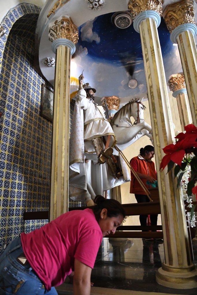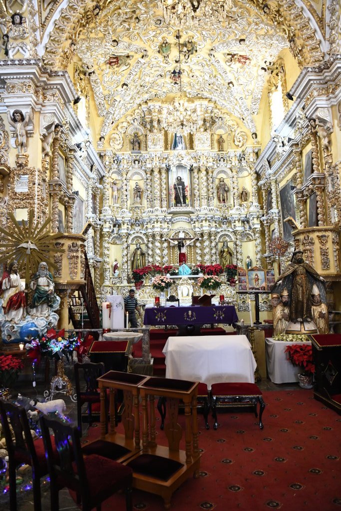 Sie ist für ihre farbenprächtige und detailreiche Fassade berühmt. Als wir auf der Schnellstraße durch Cholula fahren, glauben wir sie schon auf der linken Seite zu entdecken. Doch unser Navi führt uns auf die rechte Straßenseite in eine kleine Gasse. Nach wenigen Metern sollen wir am Ziel sein. Bei der deutlich schmuckloseren Kirche handelt es sich jedoch um die Iglesia Barrio Santiago, die sich ebenfalls – und da liegt der Fehler – im Stadtteil San Francisco Acatepec befindet. Dennoch lohnt ein Besuch. Der Jesus im Altarraum hängt nicht wie gewohnt an einem Kreuz, sondern reitet hoch zu Ross unter einem Baldachin gen Kirschenschiff. Gerade wird er für die Weihnachtsfeierlichkeiten gründlich gewaschen.