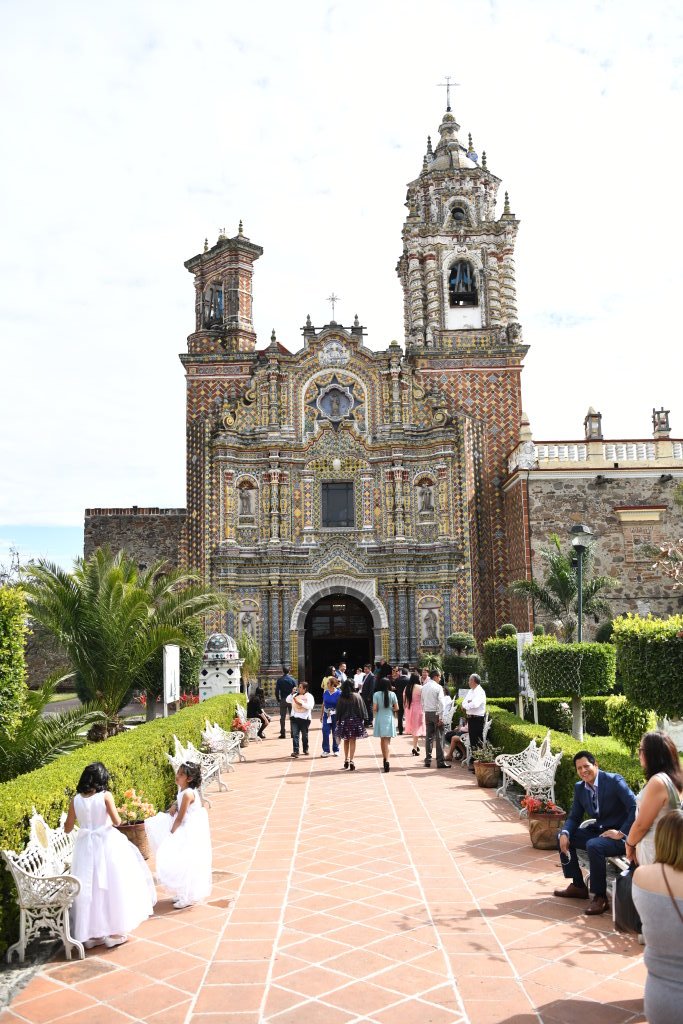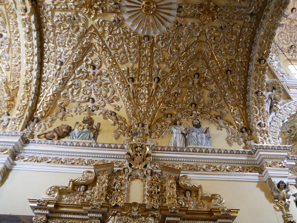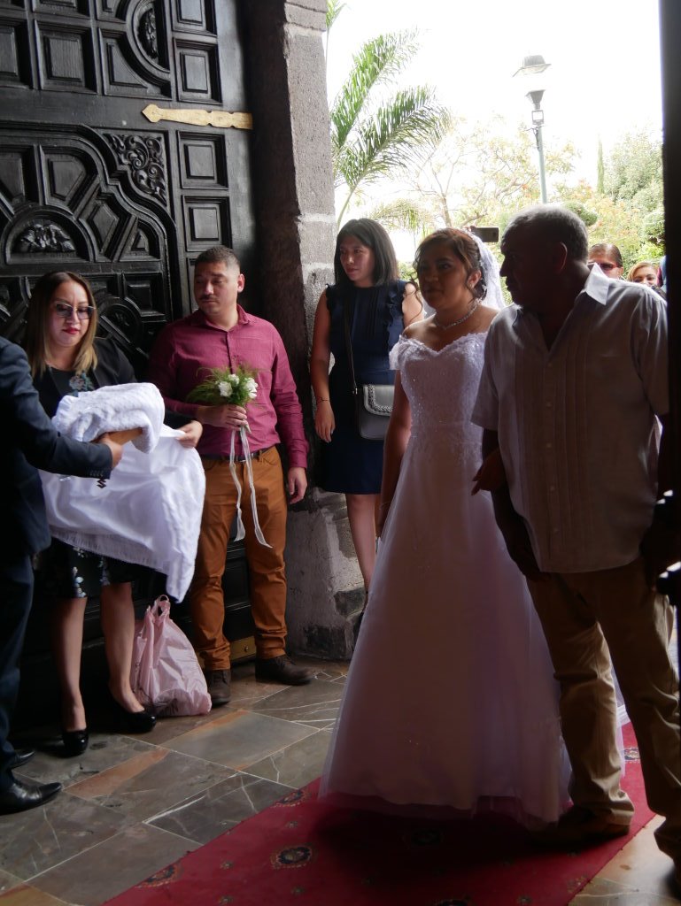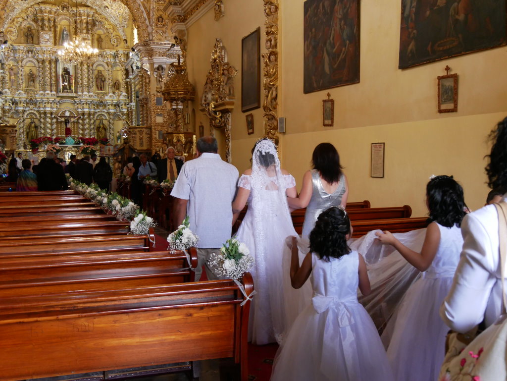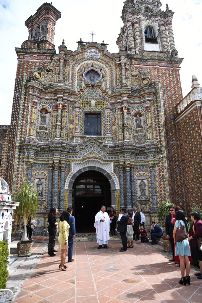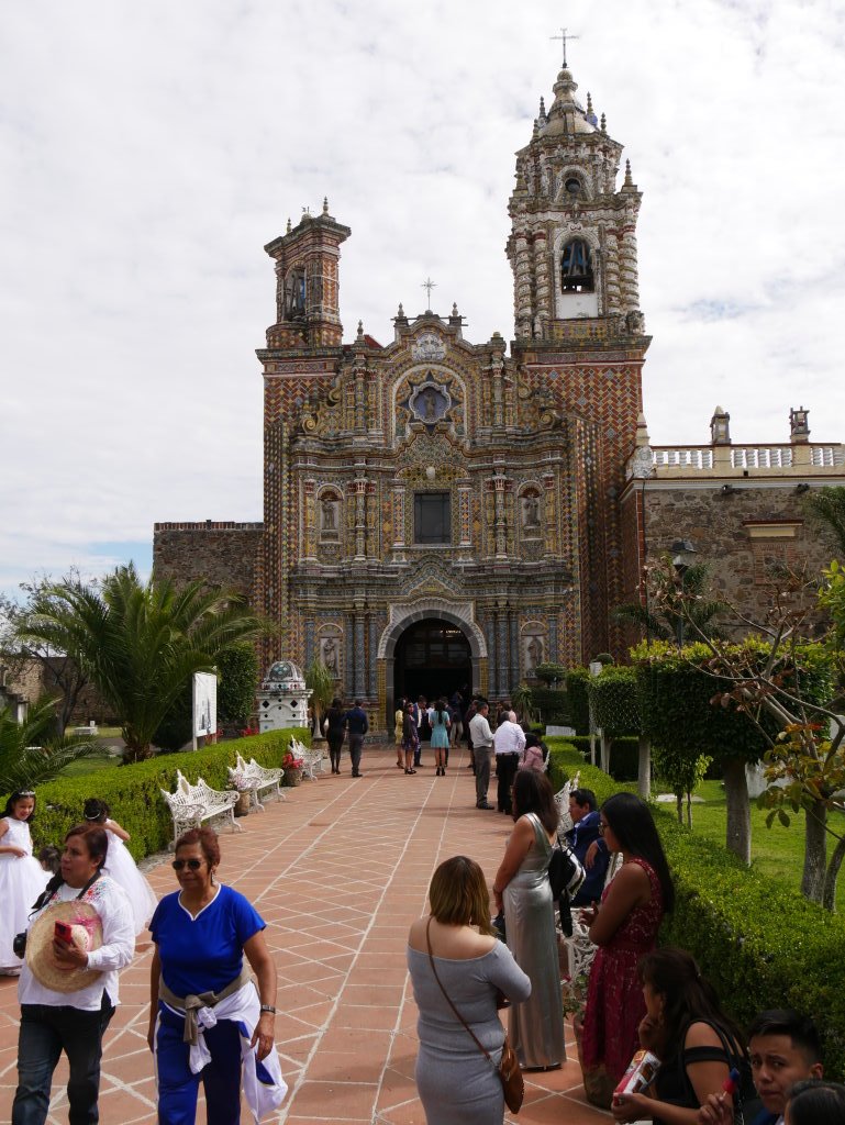 Schließlich haben wir den 400 Meter entfernten Templo de San Francisco Acatepec auf der anderen Straßenseite dann doch noch gefunden. Die Fassade des Hauptportals ist vollständig mit bunten Keramikfliesen (Azulejos) und roten Ziegeln verkleidet. Auch der üppig ausgeschmückte Innenraum muss sich nicht verstecken. Offensichtlich ist er ein beliebtes Ziel für Hochzeiten und Kindstaufen. Kaum ist eine beendet, steht schon ein weiteres Brautpaar für die nächste Zeremonie bereit.