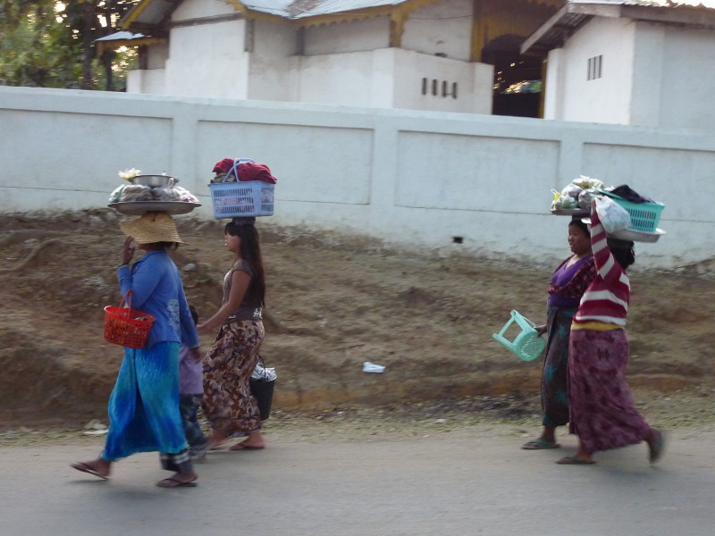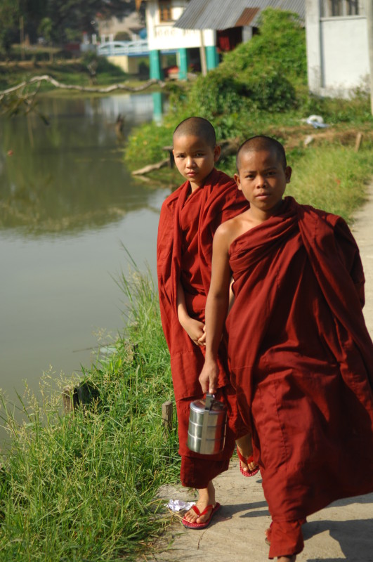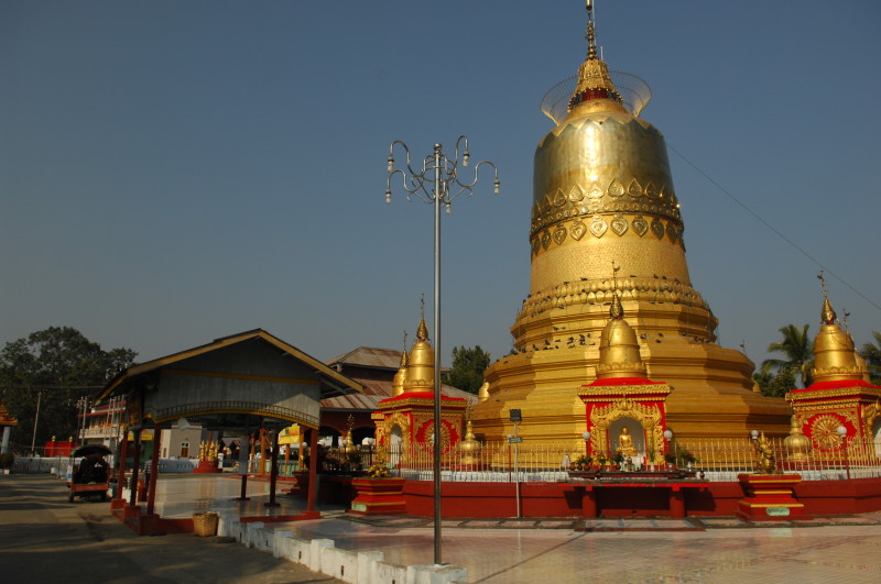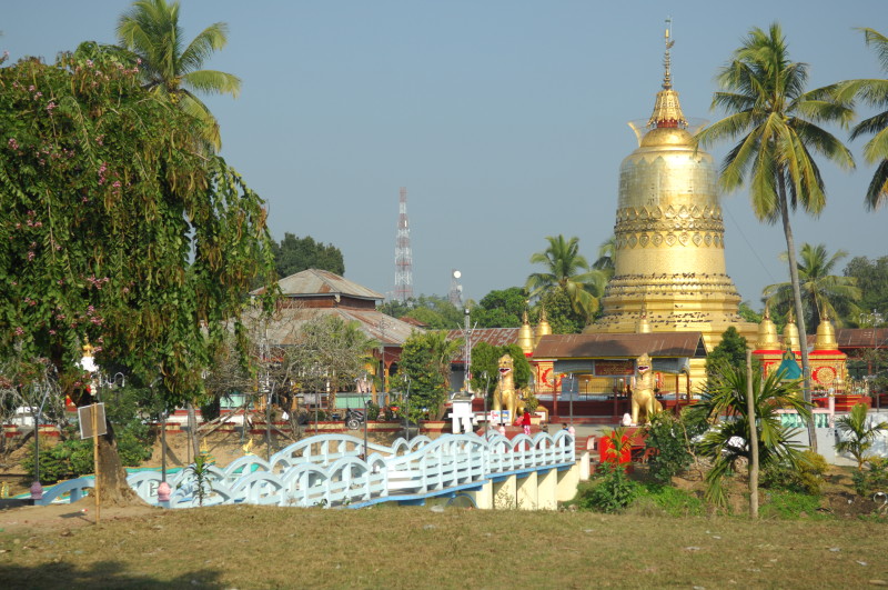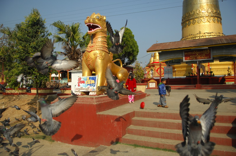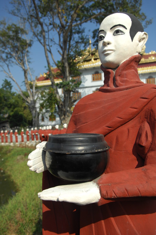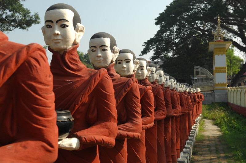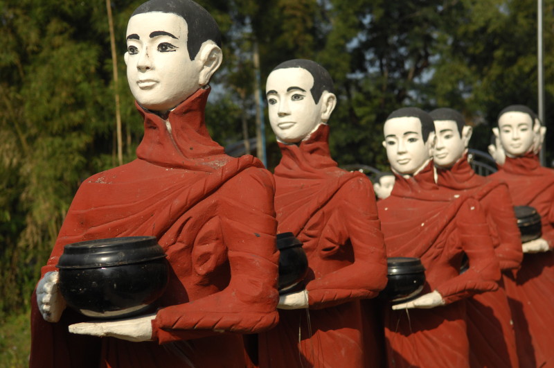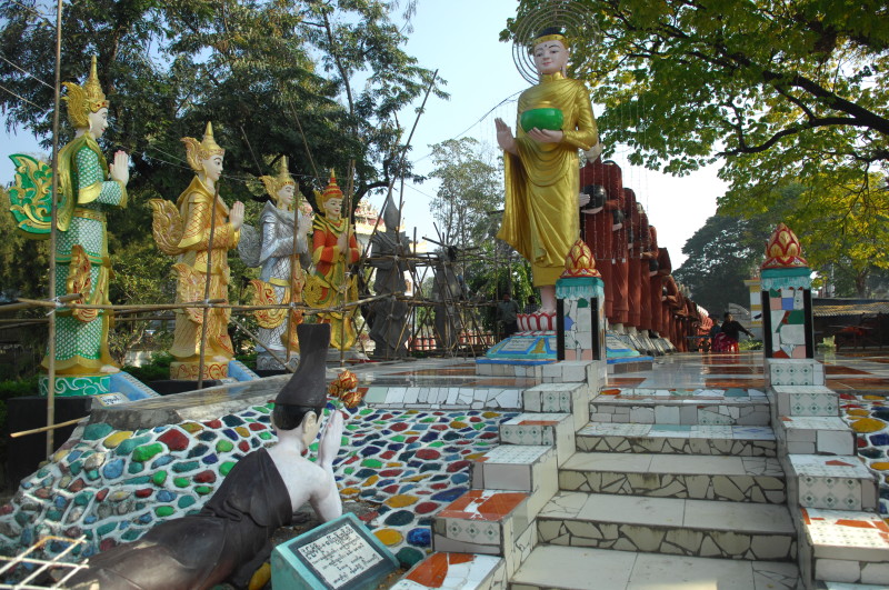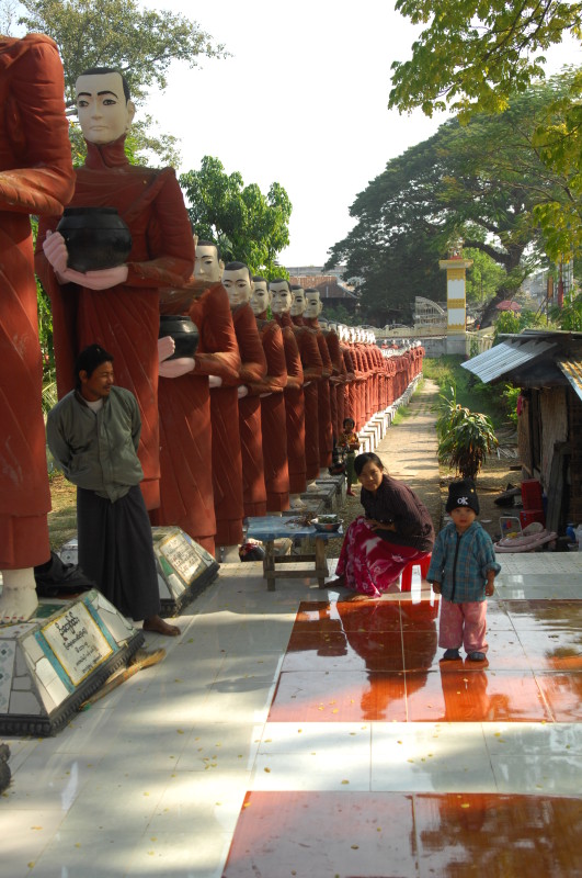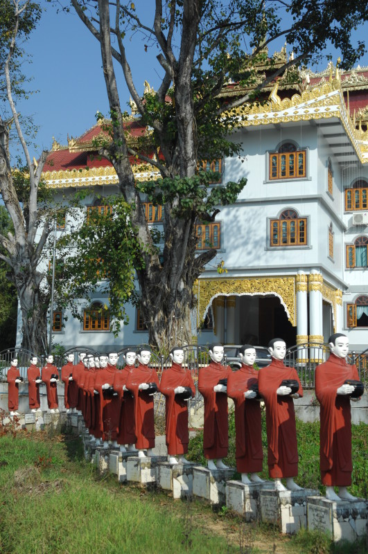 Das Frühstücksbuffet im Friendship Hotel gehört zu den üppigsten, die wir bislang in Burma hatten. Damit nicht genug: Für die Fahrt mit dem Boot nach Katha erhalten wir jeder eine große Tüte mit Verpflegung für einen ganzen Tag. Bevor wir gegen Mittag mit dem hoteleigenen Bus zum Anlegeplatz gebracht werden, ist noch Zeit für einen Besuch der nahegelegenen Theindawgyi Pagode. Eine Schlange steinerner Mönche geleitet den Besucher um einen kleinen See herum zum Heiligtum.