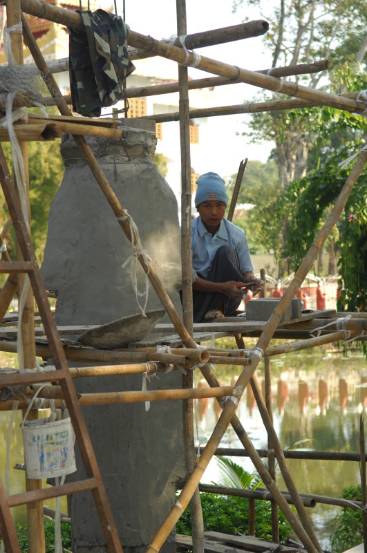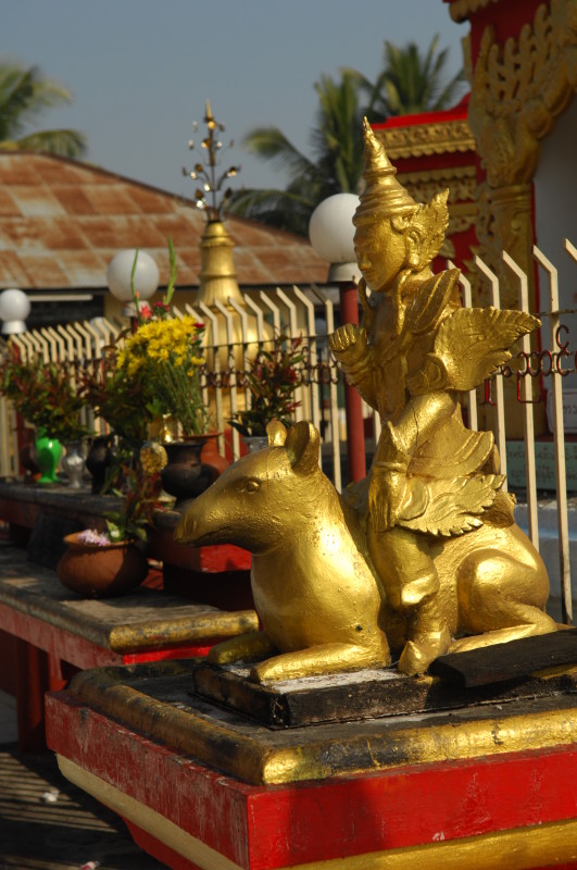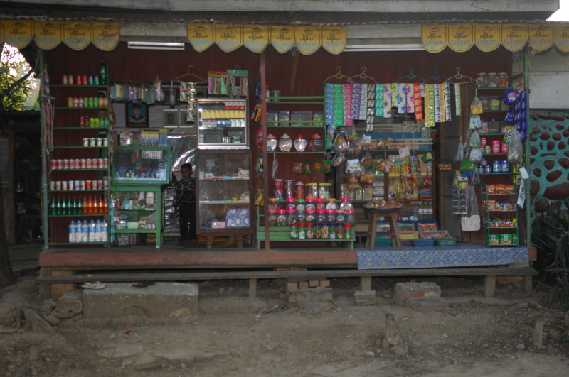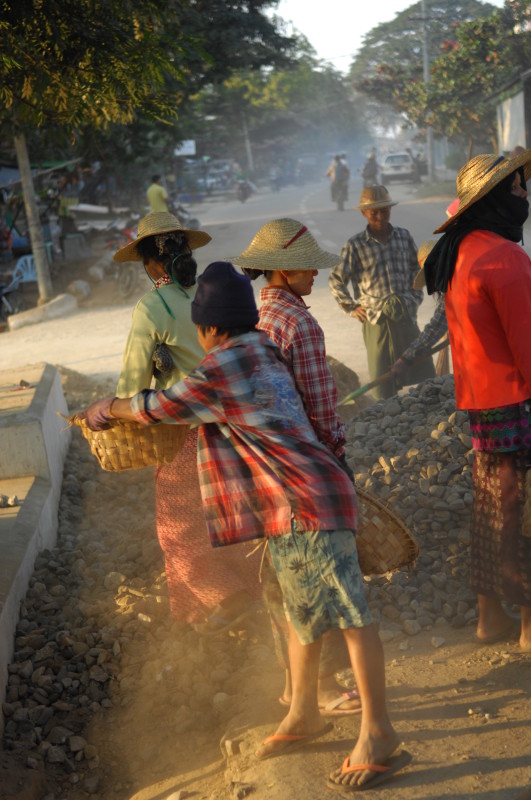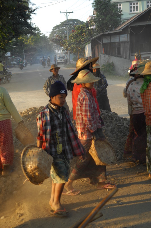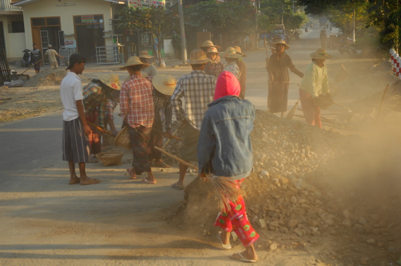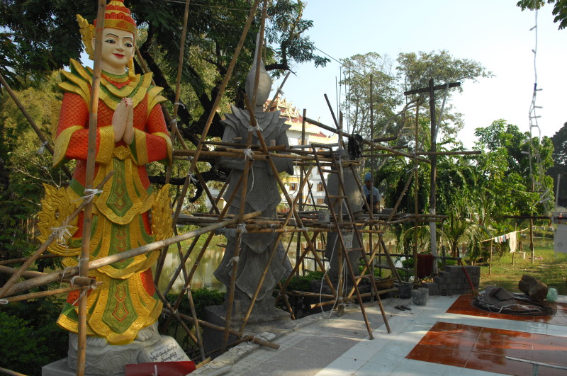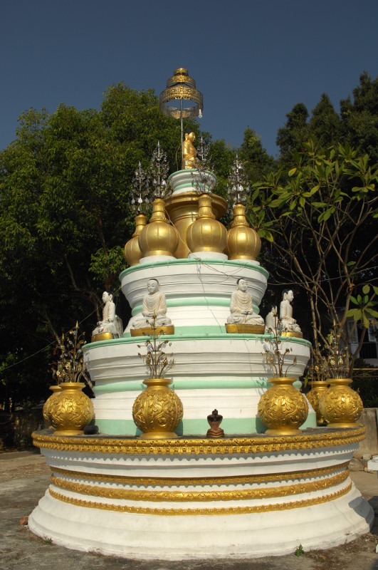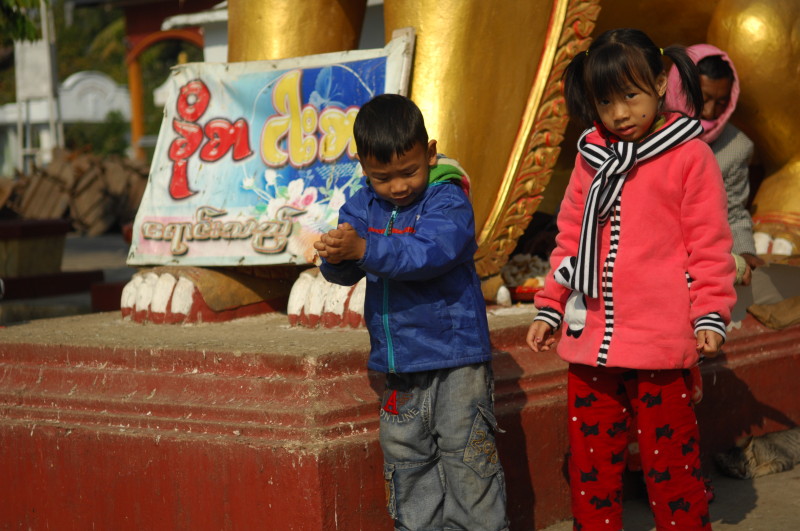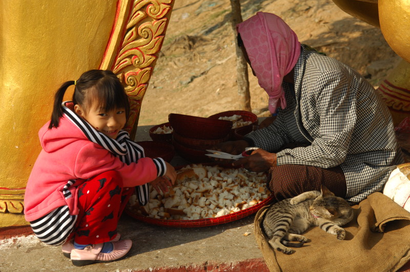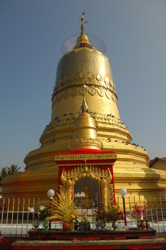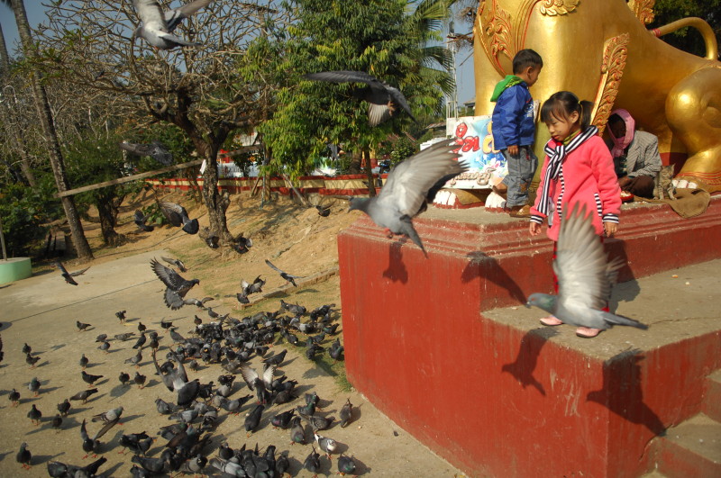 Das Frühstücksbuffet im Friendship Hotel gehört zu den üppigsten, die wir bislang in Burma hatten. Damit nicht genug: Für die Fahrt mit dem Boot nach Katha erhalten wir jeder eine große Tüte mit Verpflegung für einen ganzen Tag. Bevor wir gegen Mittag mit dem hoteleigenen Bus zum Anlegeplatz gebracht werden, ist noch Zeit für einen Besuch der nahegelegenen Theindawgyi Pagode. Eine Schlange steinerner Mönche geleitet den Besucher um einen kleinen See herum zum Heiligtum.