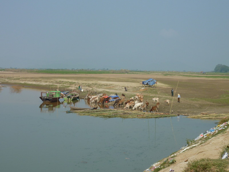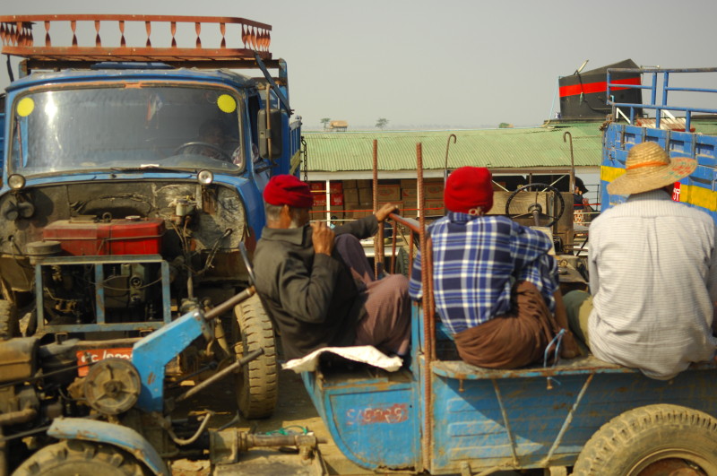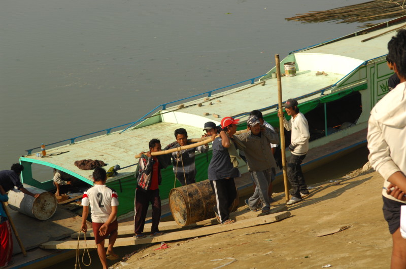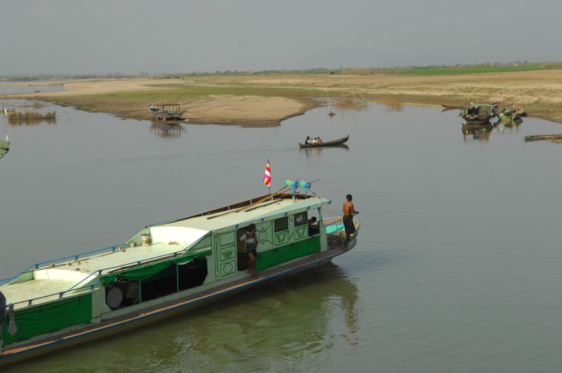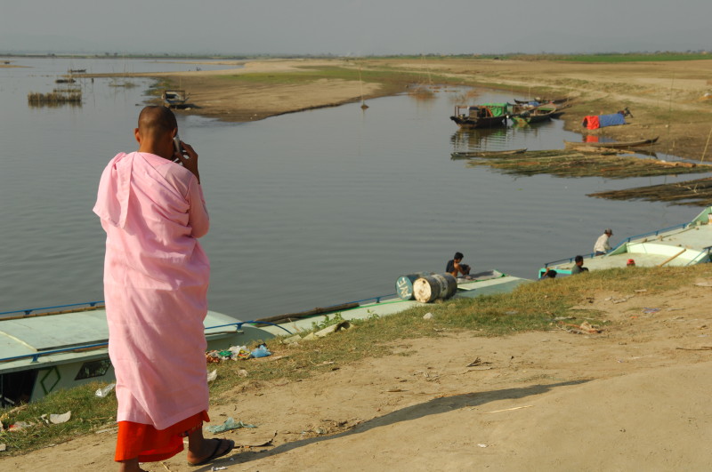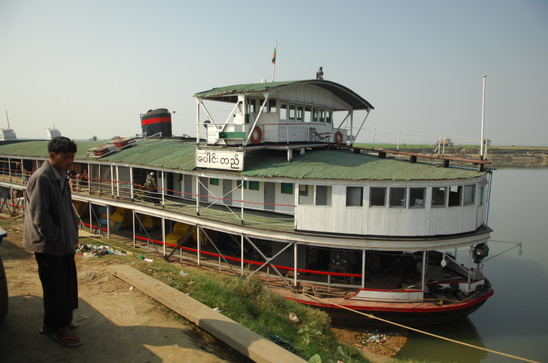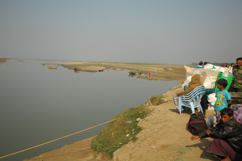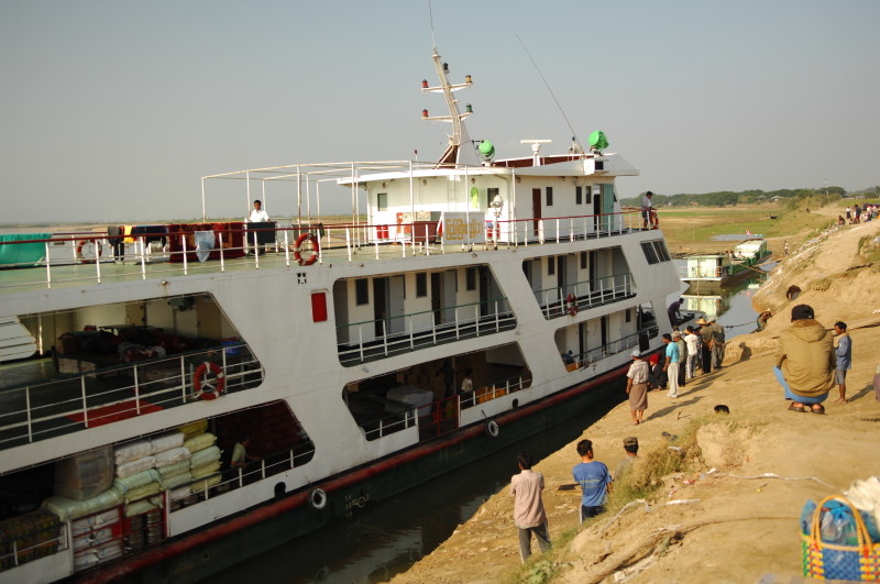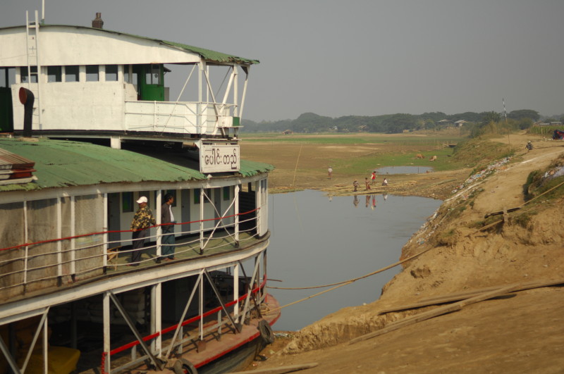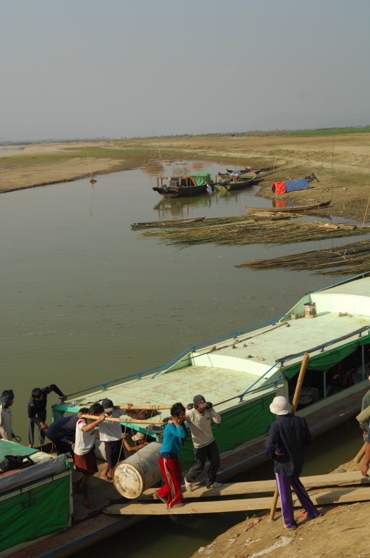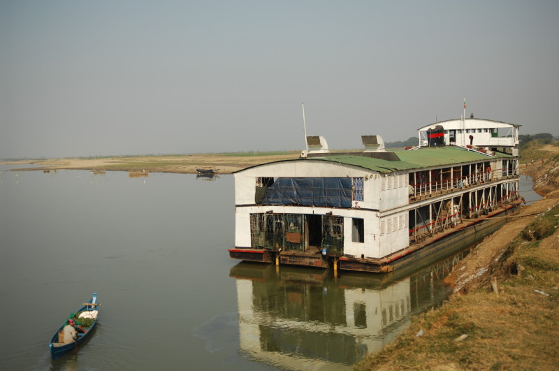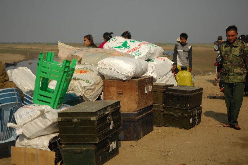 Der Hafen von Bhamo befindet sich außerhalb des Ortes an einem Nebenarm des Irrawaddy. Alles scheint wie geplant zu laufen, eine Fähre liegt bereits vor Anker, die Fracht wurde bereits an Bord gebracht. Noch dürfen wir aber nicht an Bord. Das Boot am Ufer ist ein Frachtschiff, das auf ein wenig mehr Wasser unter dem Kiel wartet, um die Fahrt flussabwärts zu wagen. Kurze Zeit später kommt ein Mann mit einem schnurlosen Tischtelefon. Am anderen Ende der Leitung ist jemand vom Hotel. Er erklärt uns, die geplante Fähre fahre heute nicht, aber ein kleineres Expressboot würde uns am Nachmittag bis nach Katha bringen. Also warten wir weiter.
