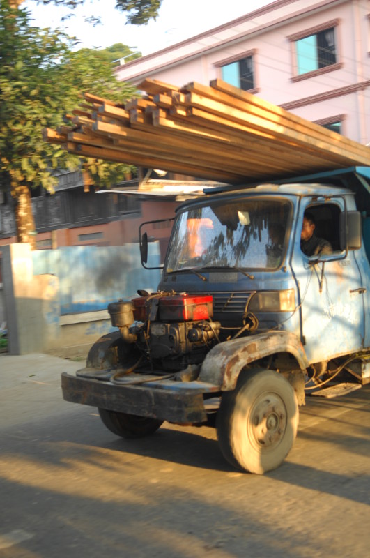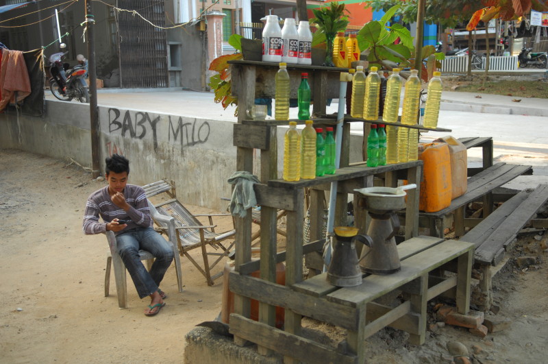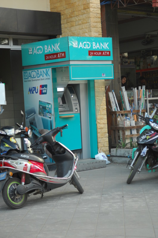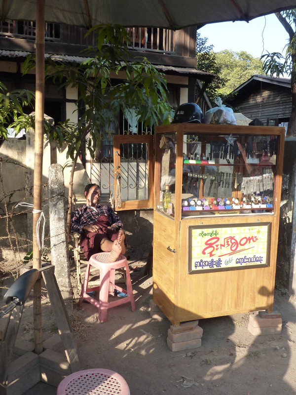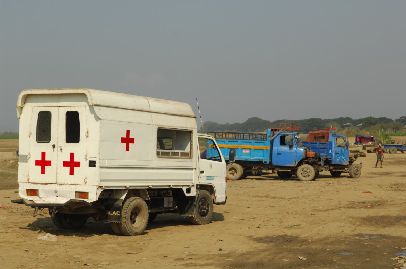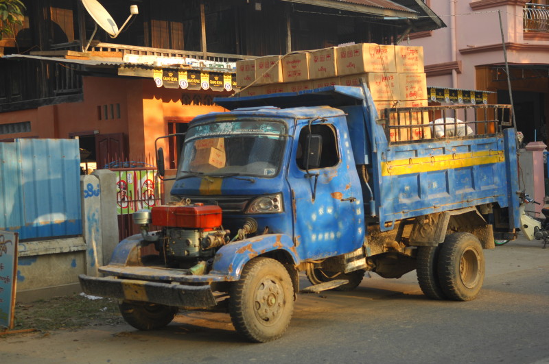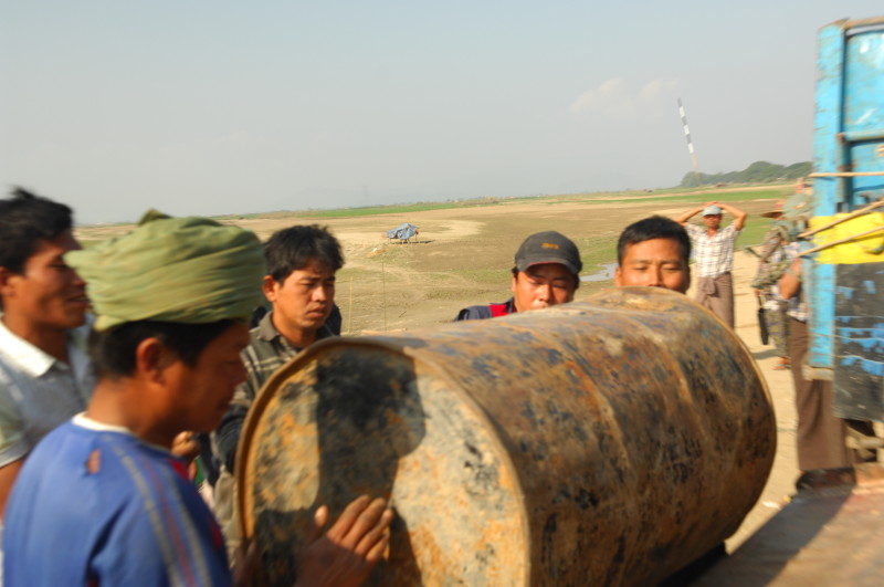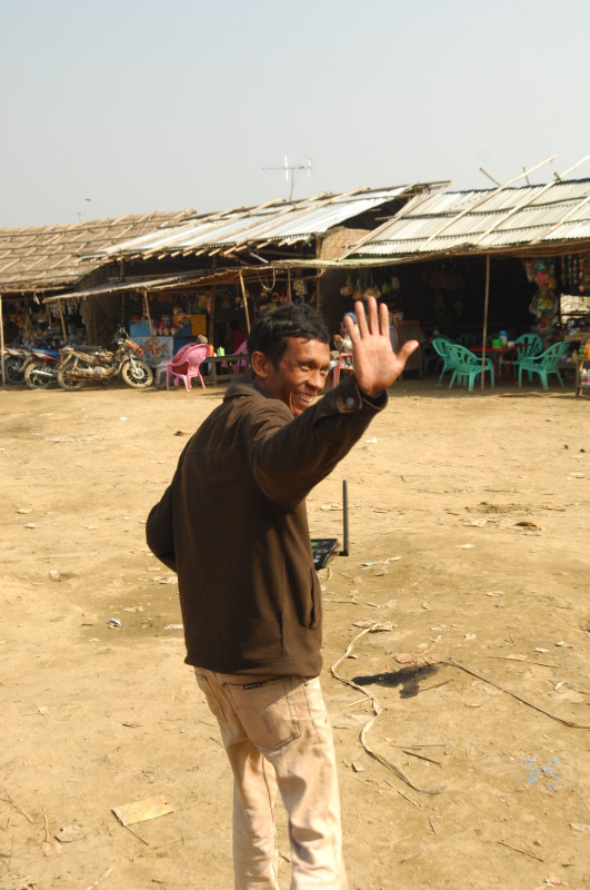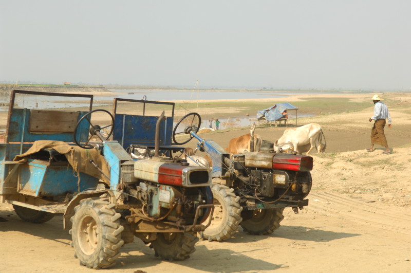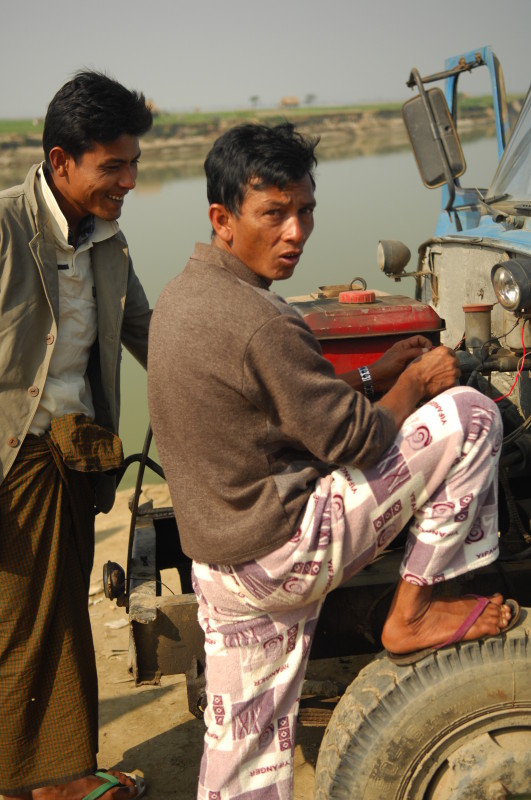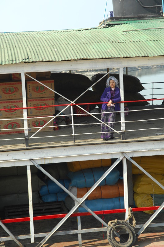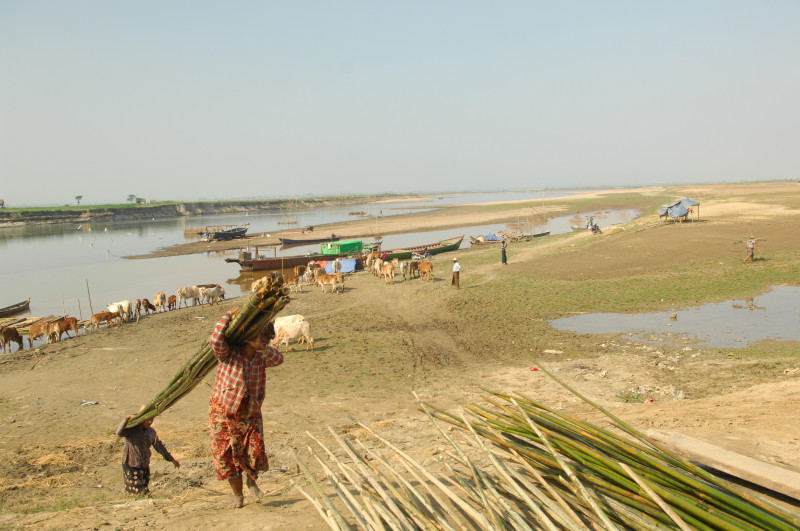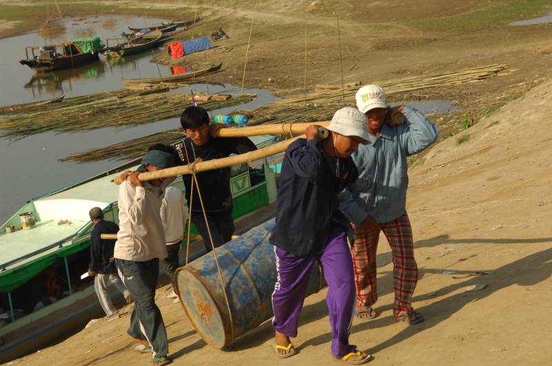 Der Hafen von Bhamo befindet sich außerhalb des Ortes an einem Nebenarm des Irrawaddy. Alles scheint wie geplant zu laufen, eine Fähre liegt bereits vor Anker, die Fracht wurde bereits an Bord gebracht. Noch dürfen wir aber nicht an Bord. Das Boot am Ufer ist ein Frachtschiff, das auf ein wenig mehr Wasser unter dem Kiel wartet, um die Fahrt flussabwärts zu wagen. Kurze Zeit später kommt ein Mann mit einem schnurlosen Tischtelefon. Am anderen Ende der Leitung ist jemand vom Hotel. Er erklärt uns, die geplante Fähre fahre heute nicht, aber ein kleineres Expressboot würde uns am Nachmittag bis nach Katha bringen. Also warten wir weiter.