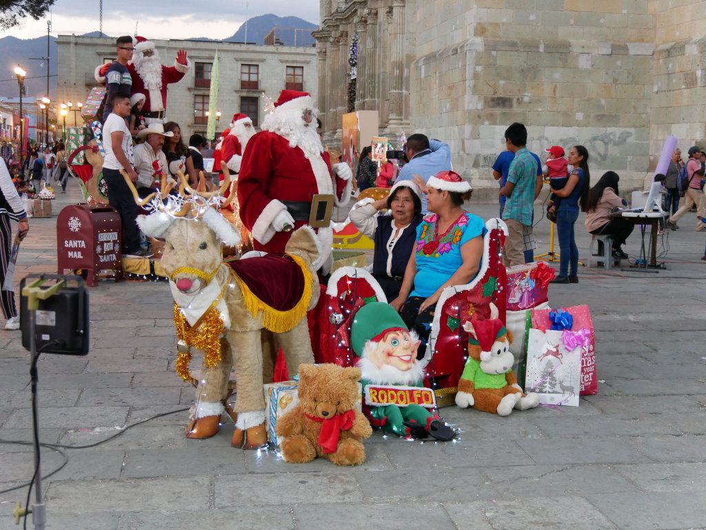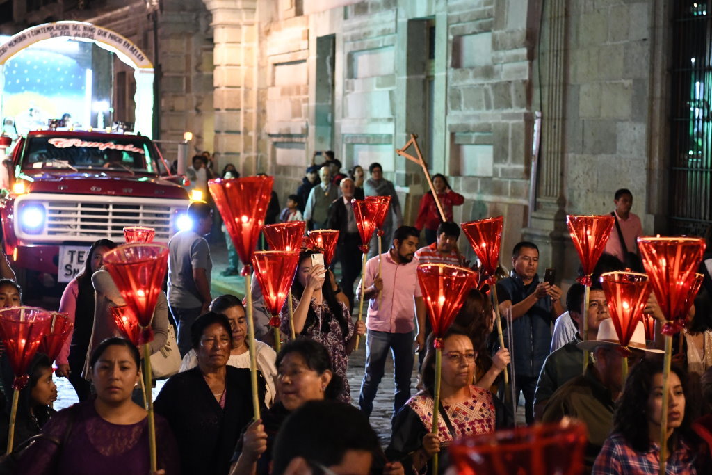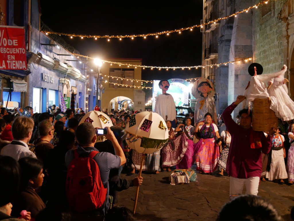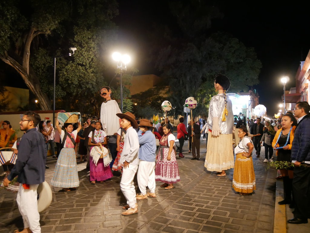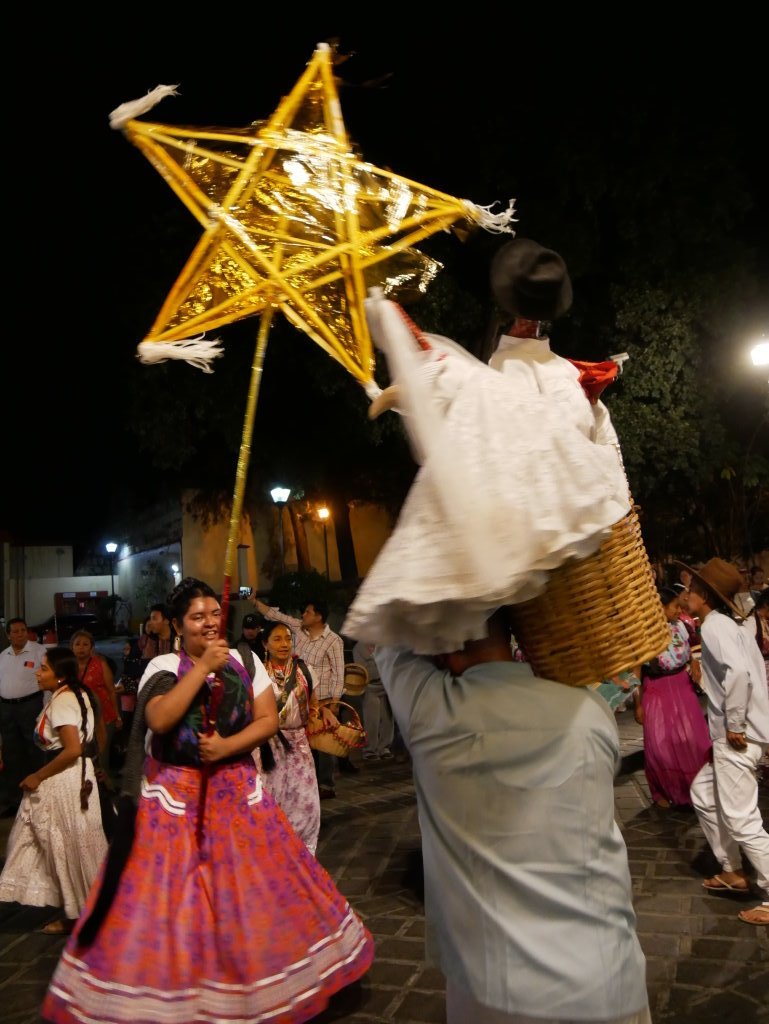 Am Heiligen Abend vermischen sich in Oaxaca die Traditionen. Die Posadas werden mit den Calendas aufgepeppt. Letztere sind farbenfrohe Umzüge mit den für Oaxaca typischen Riesenpuppen, wie sie auch beim Fest am Tag der Toten durch die Stadt ziehen.