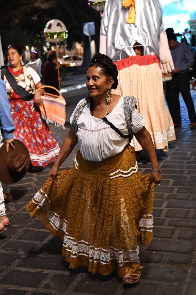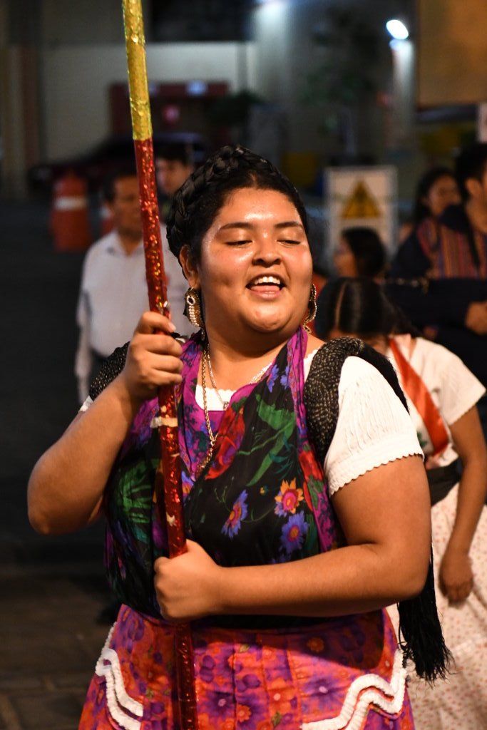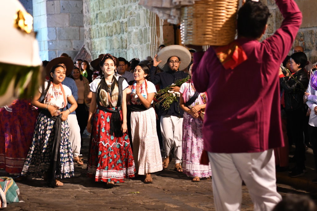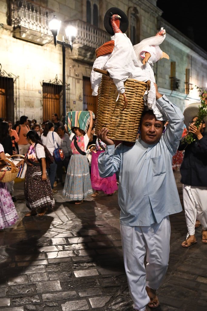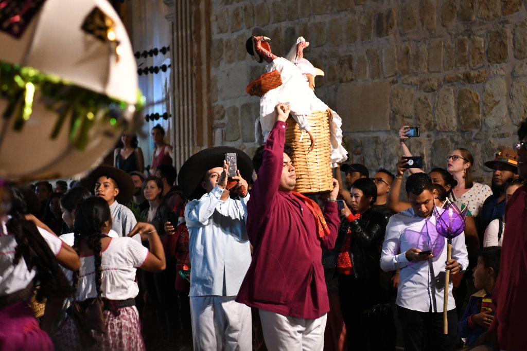 Mittendrin der Träger eines Pappmaché-Truthahnpärchen im Korb, sowie weitere Darsteller aus den traditionellen oaxinischen Calendas.