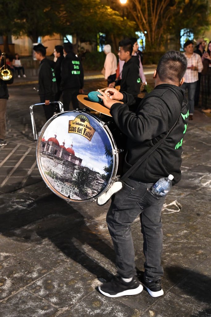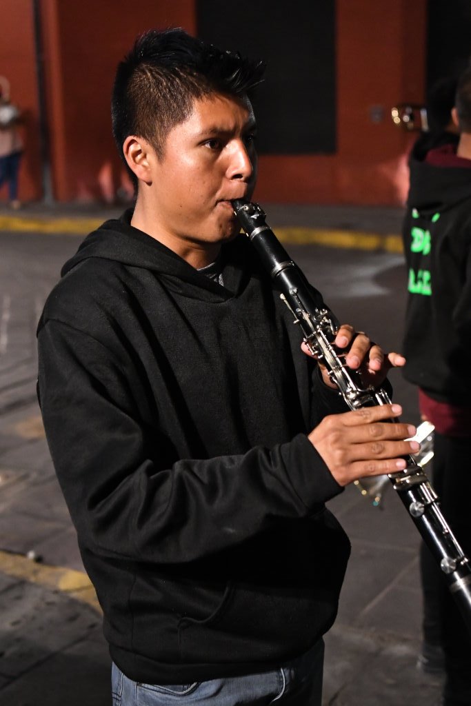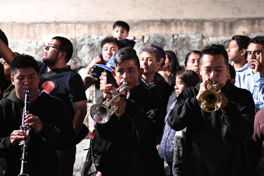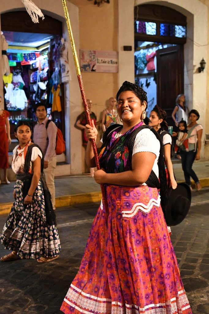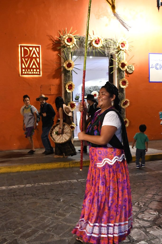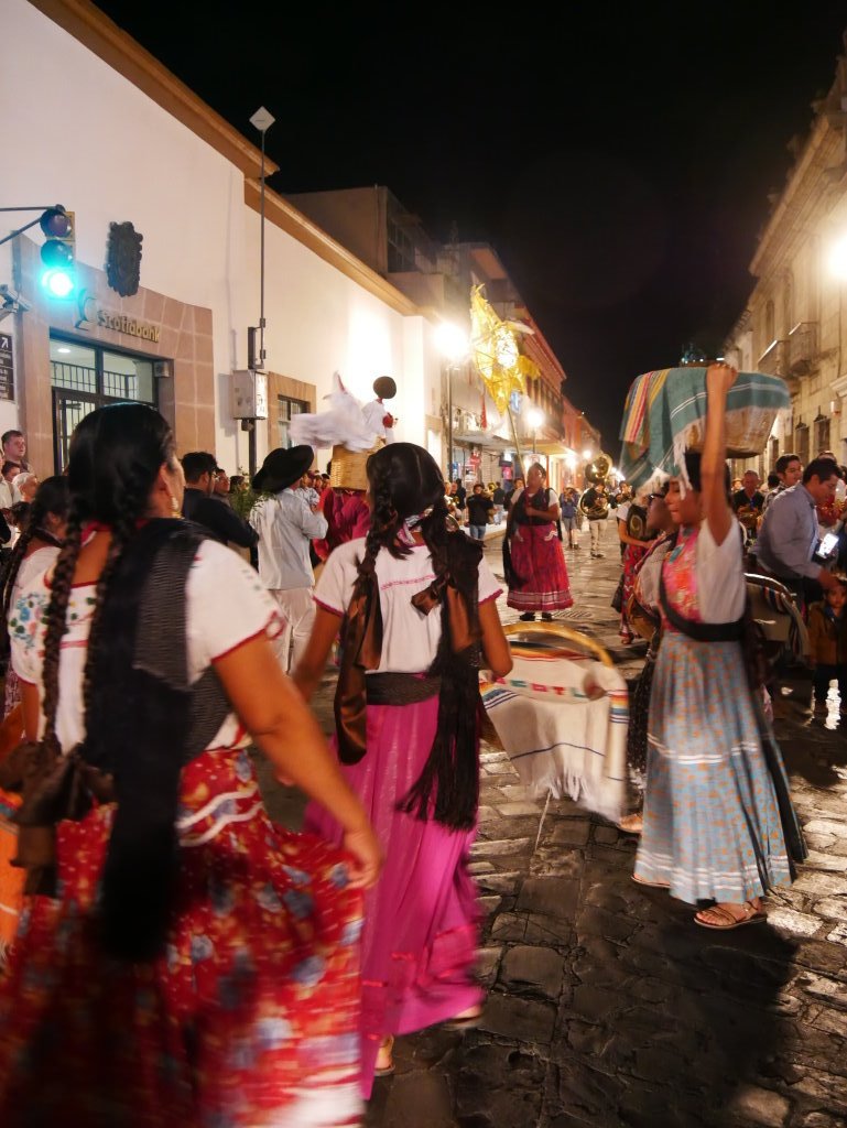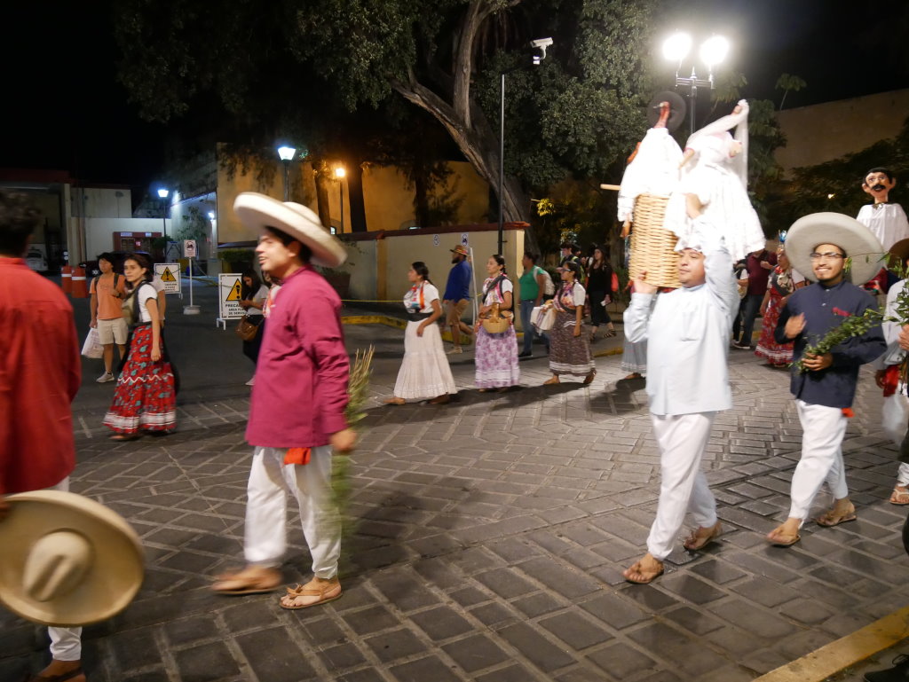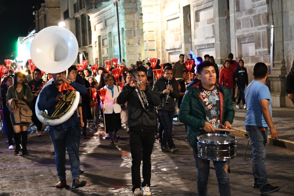 Am letzten Abend der traditionellen Posadas geht es in Oaxaca noch einmal so richtig rund. Nach Einbruch der Dunkelheit folgen wir der ersten Gruppe der Gemeinde „La Merced“ vom Zócalo aus einige Blocks durch die Altstadt. Die Prozession wird angeführt von einer vergnügten Blaskapelle, die gerade ziemlich schräg die gute alte „Rosamunde“ zum Besten gibt.
