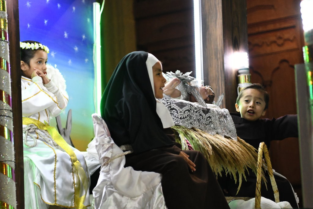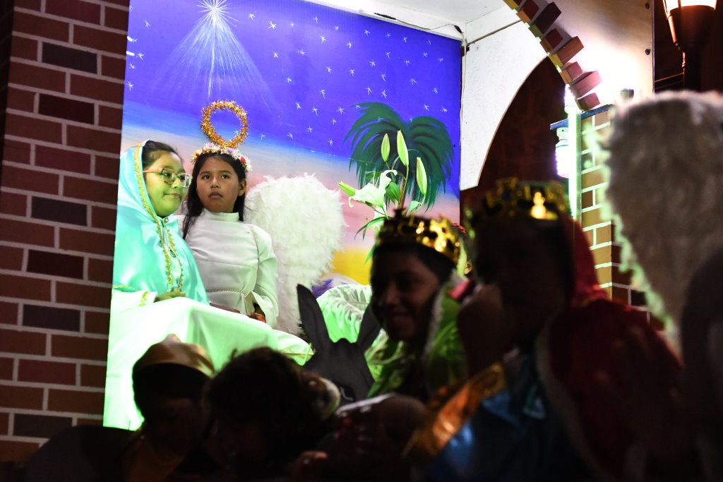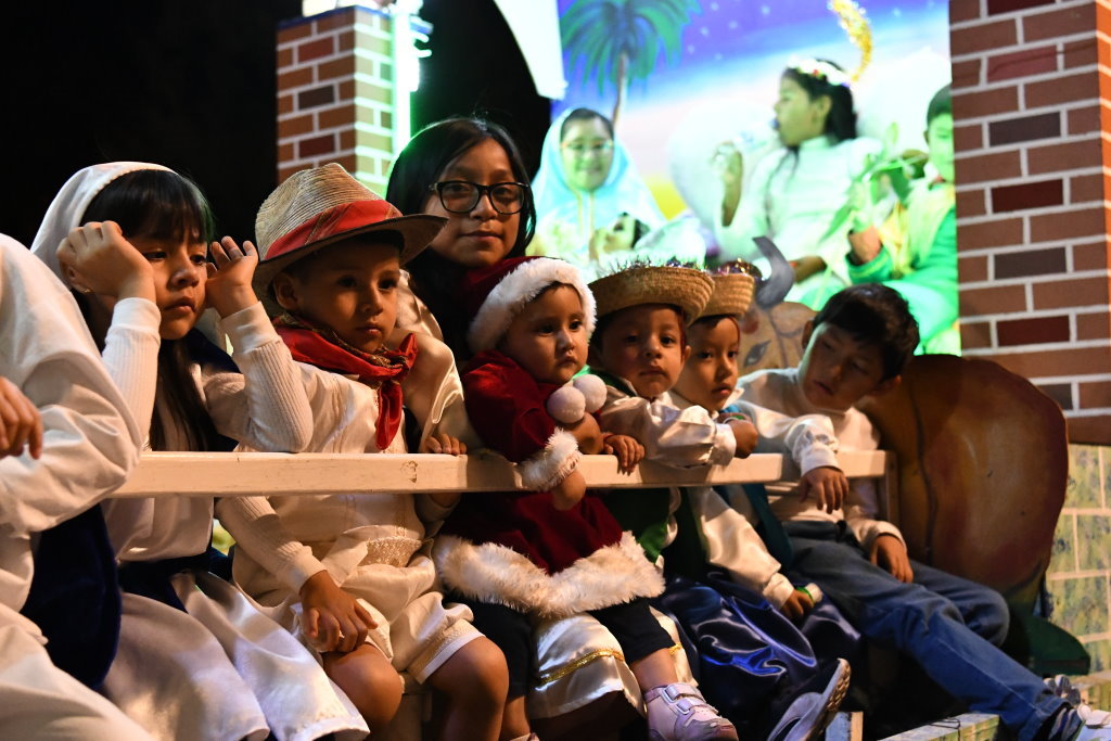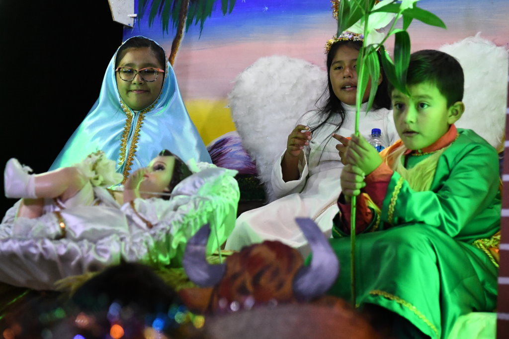 Auf seiner Ladefläche begleiten die Kinder der Gemeinde das Krippenspiel. Hinten bewacht ein pummeliger Engel Josef und Maria auf ihrer Herbergssuche. Dass vor dem Trio bereits das Jesuskind in einer Krippe liegt, darf man bei dieser fröhlichen Interpretation der Posada nicht so eng sehen.