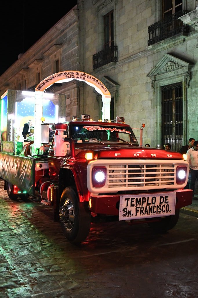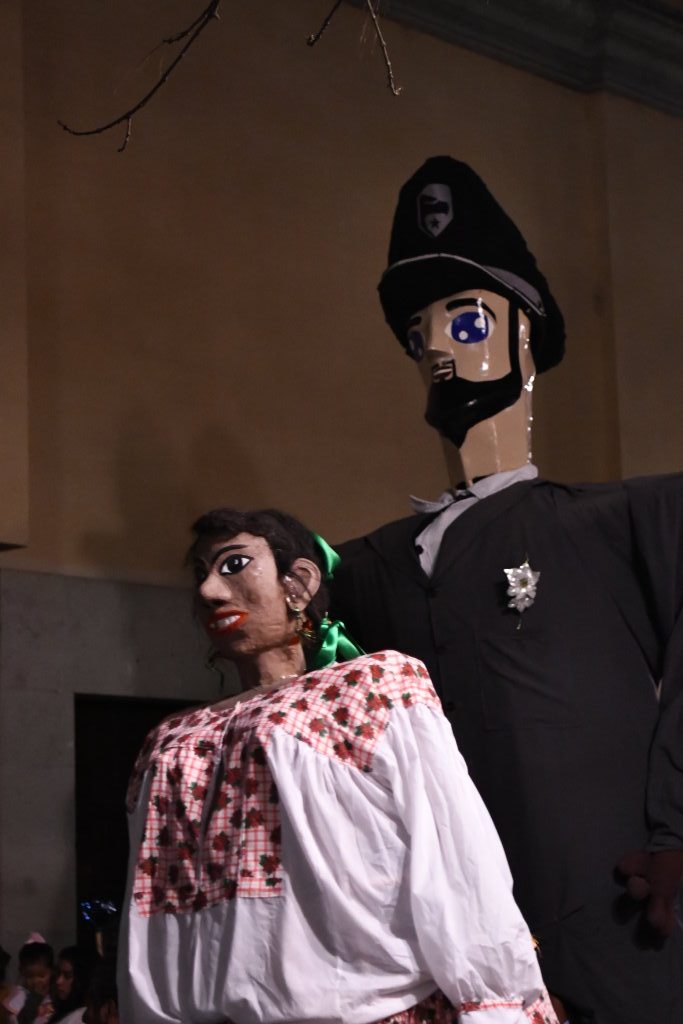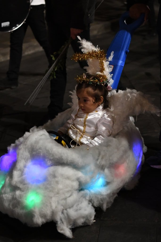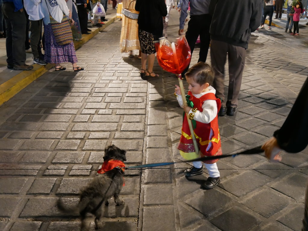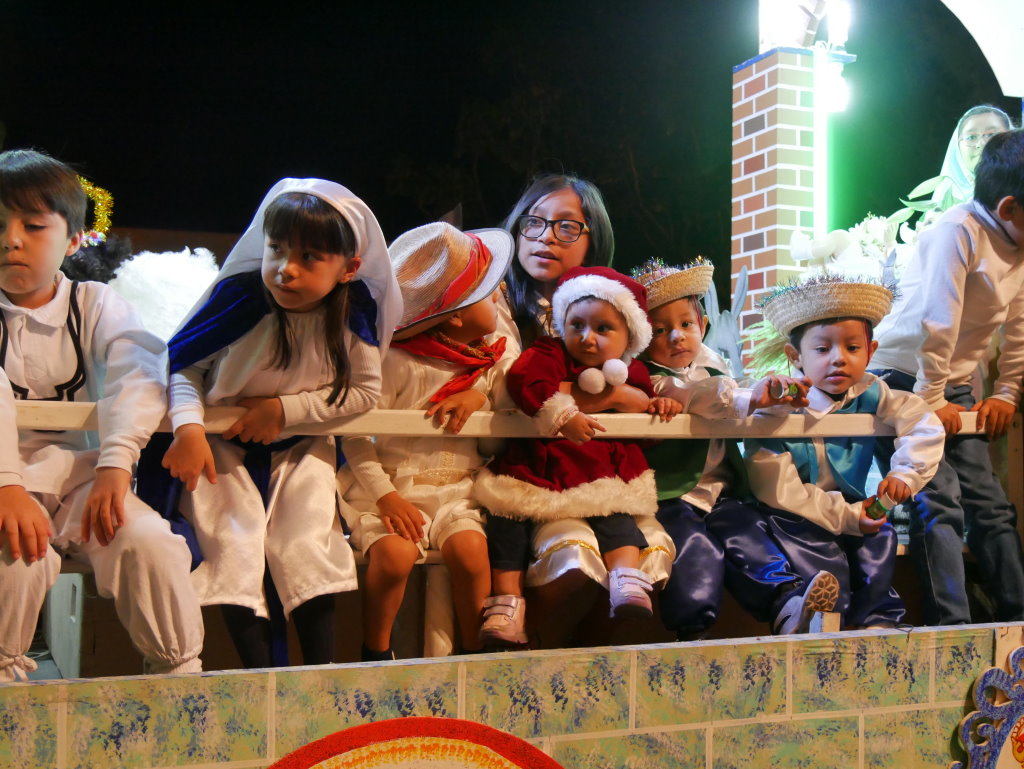 Ein paar Querstraßen weiter kreuzen wir den Weg der nächsten Prozession. Hier hat sich die Gemeinde des „Templo de San Francisco“ auf den Weg gemacht. Eine rosa Riesenpuppe führt die Prozession an, die allerdings deutlich spaßbefreiter unterwegs ist. Bildete zuvor eine Tanzgruppe die Abordnung der Gemeinde, so folgt diese hier mit roten Fackeln geordnet in Reih und Glied. Schlusslicht auch hier ein Pickup mit dem Krippenszenario.