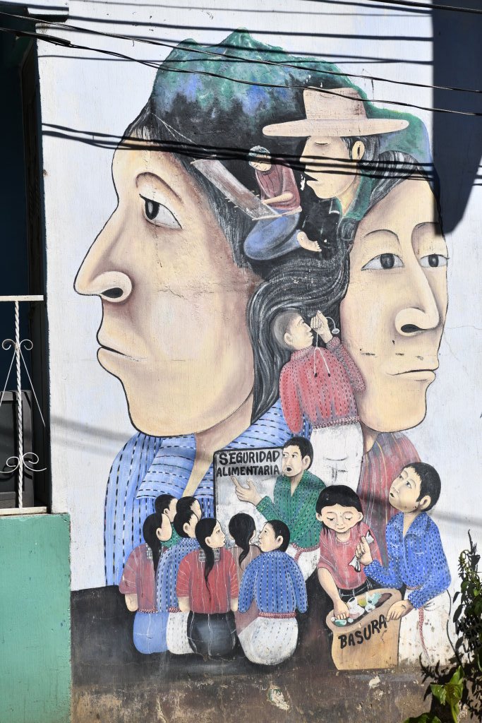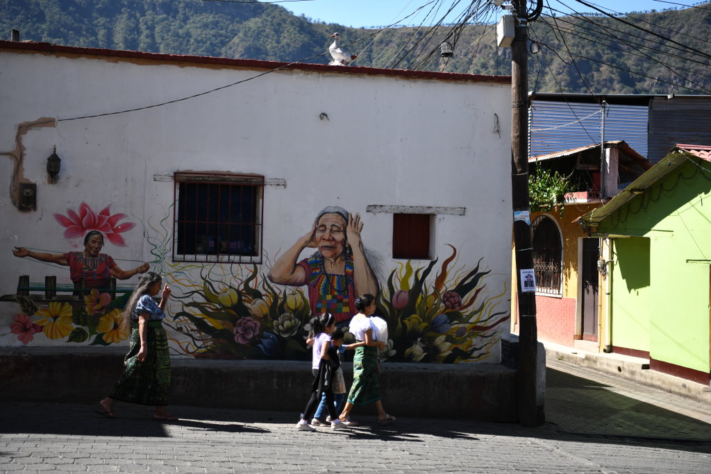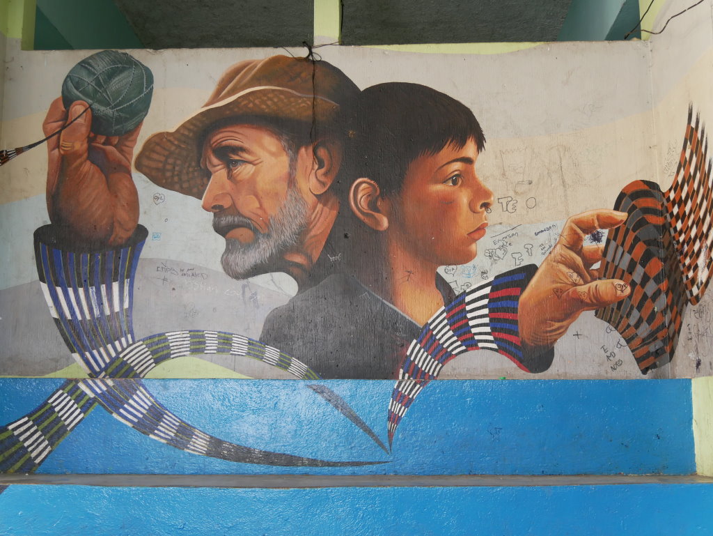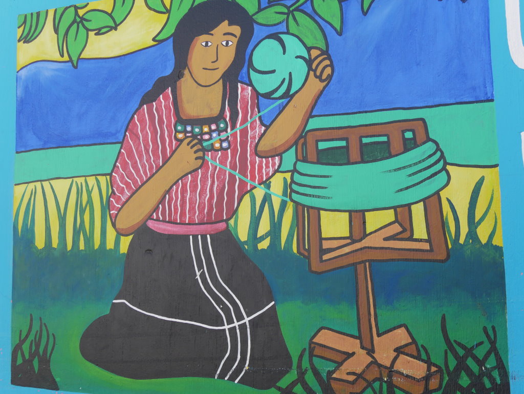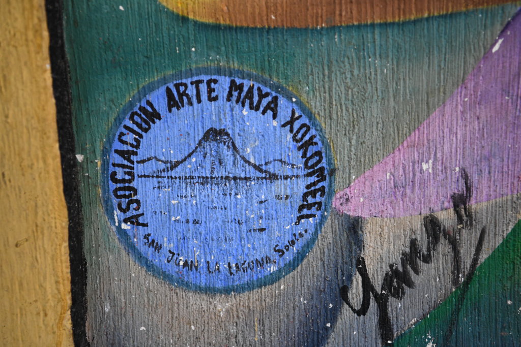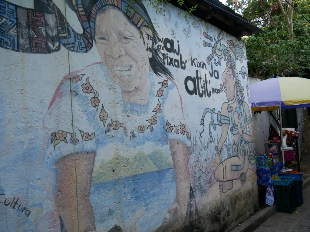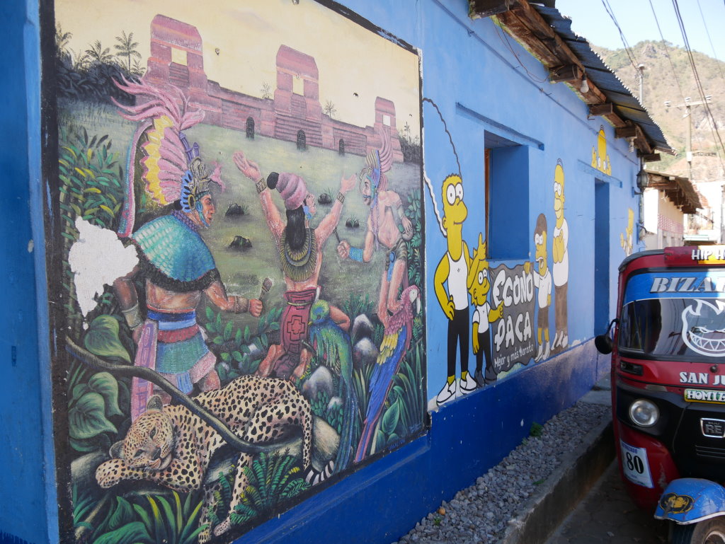 Wir machen weiter, wo wir gestern aufgehört haben, tuckern mit dem Boot nach San Pedro und nehmen von dort ein TukTuk nach San Juan de Laguna. Zwei Dinge interessieren uns hier: die Webereien und die Wandmalereien. Unweit der katholischen Kirche entdecken wir den kleinen Laden einer Kooperative von Müttern von Kindern mit Down-Syndrom (Artesanias Hermanos Down). Sie finanzieren die Arzt- und Behandlungskosten mit dem Verkauf der Webarbeiten und bestickten Huipil. Letzteres ist eine Art Bluse, wie sie von den meisten indigenen Frauen Mittelamerikas getragen wird.