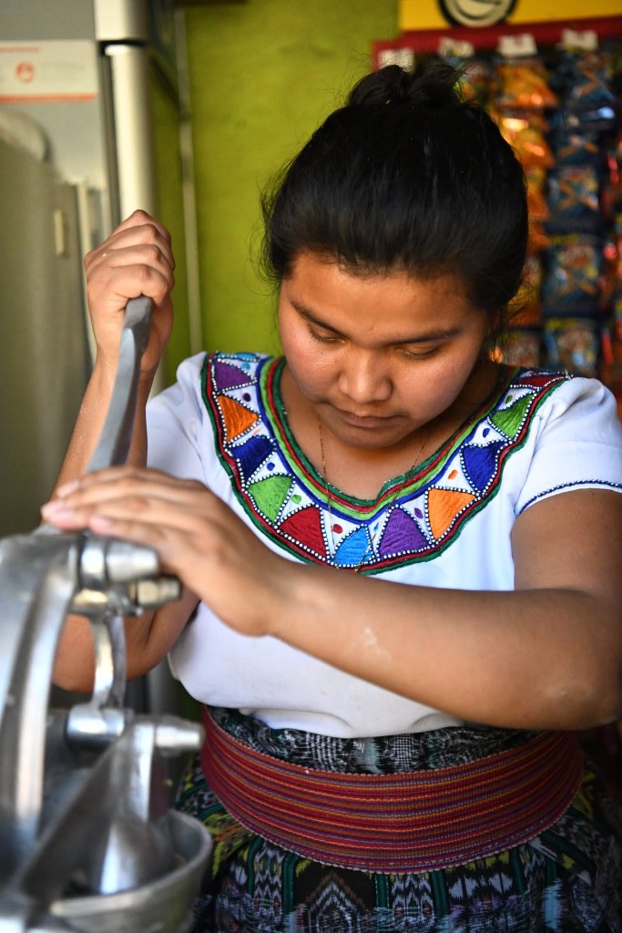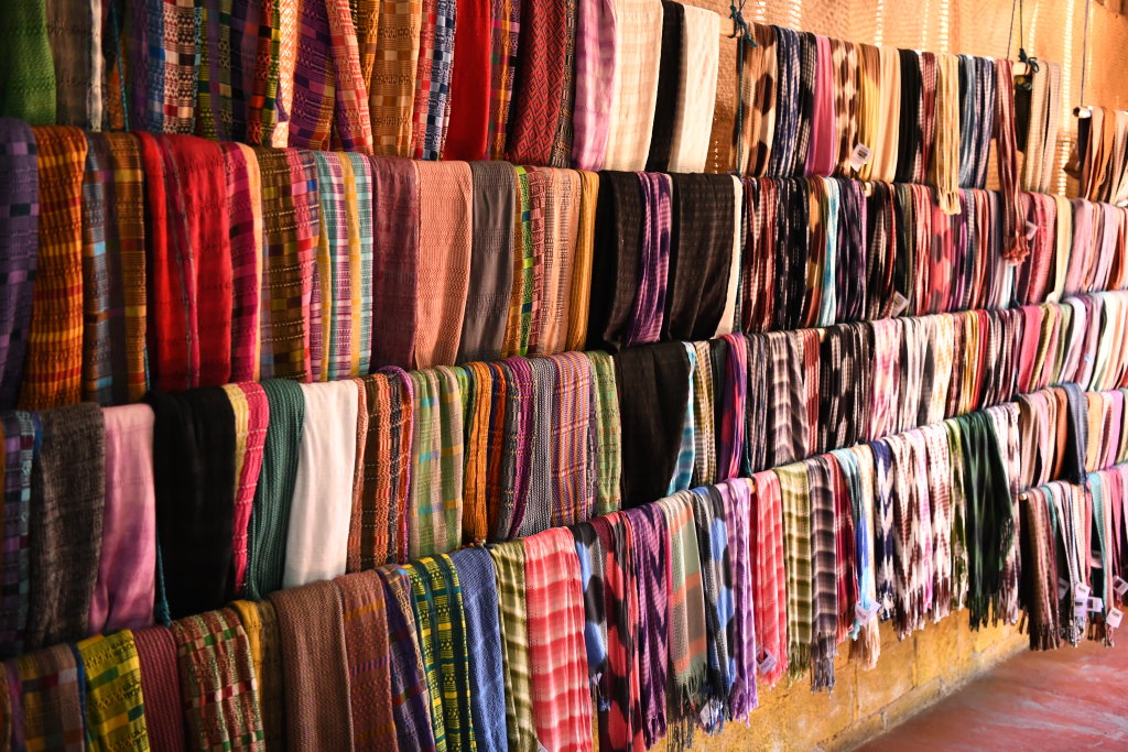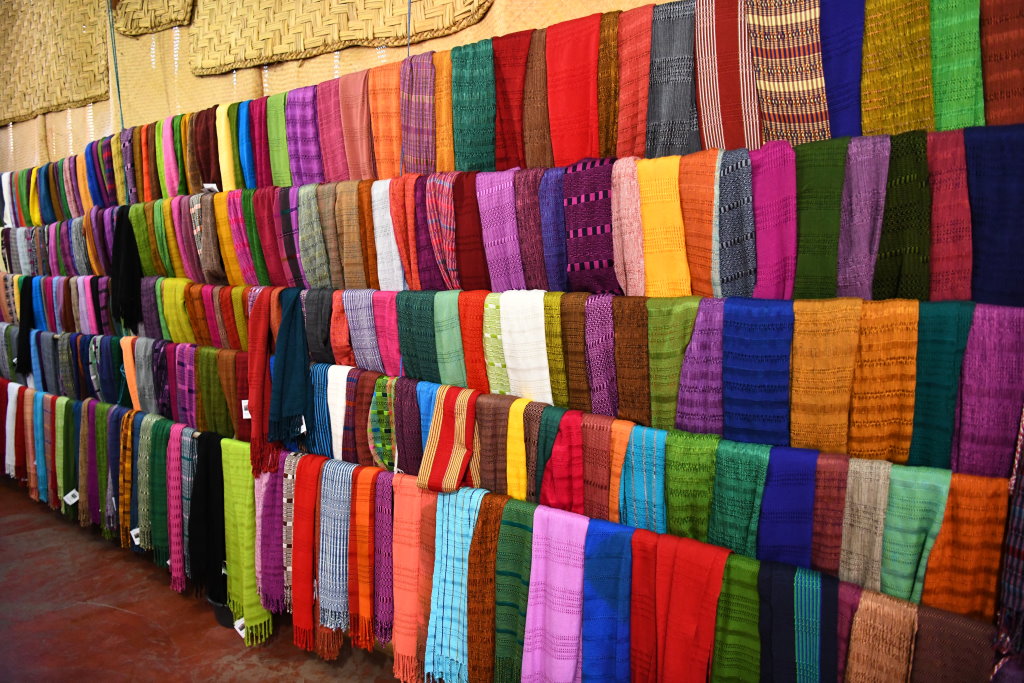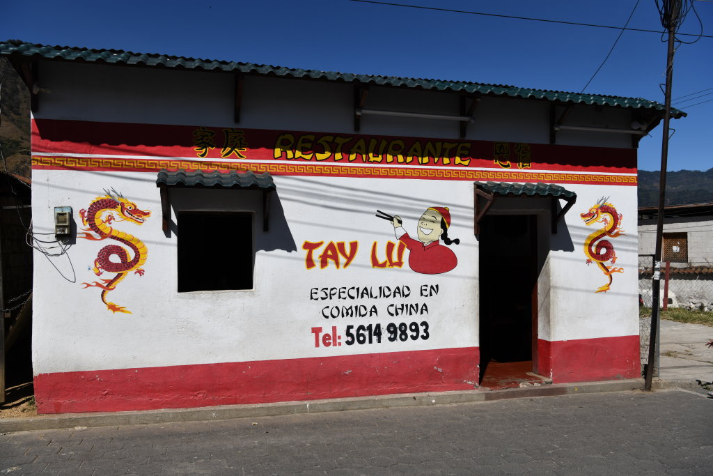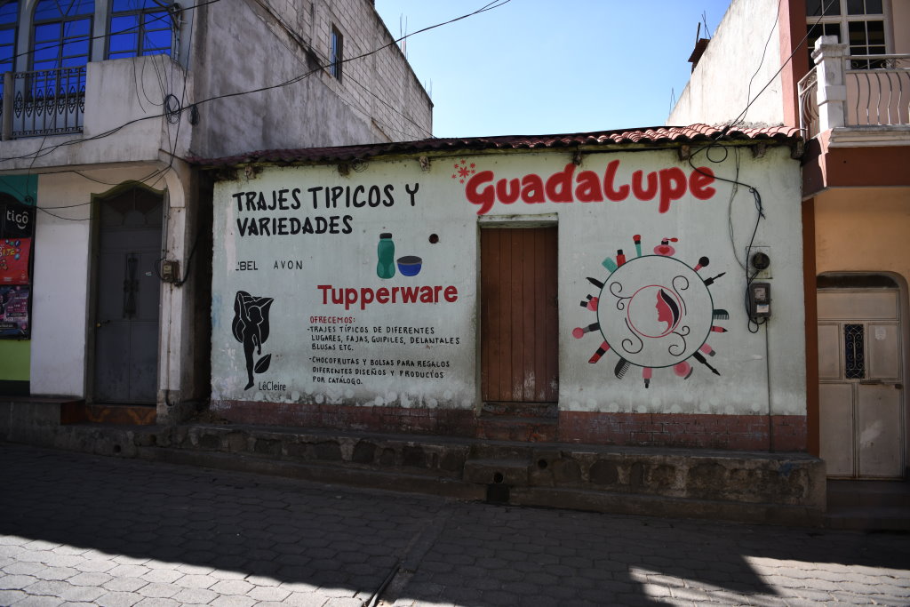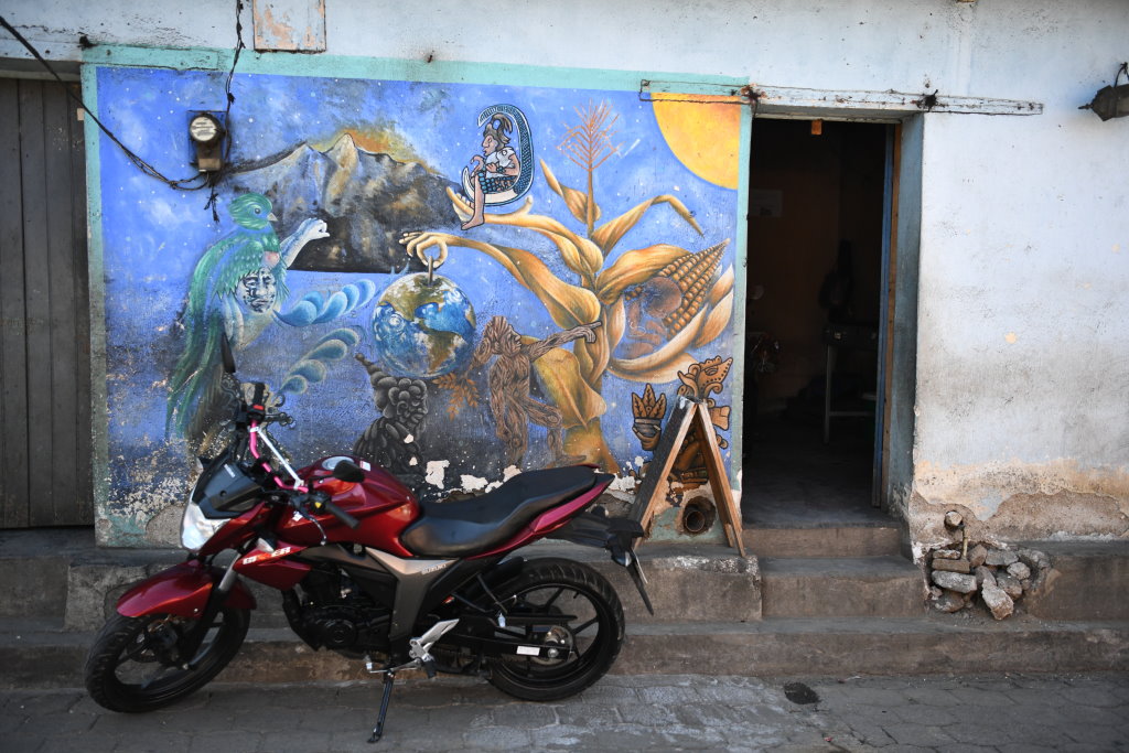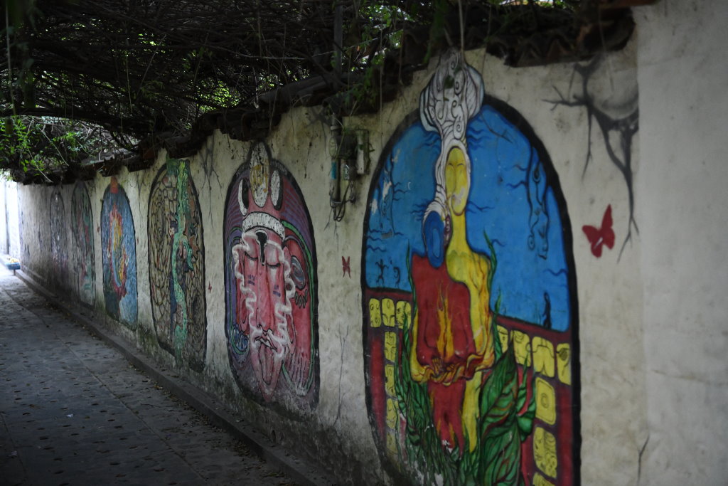 Wir machen weiter, wo wir gestern aufgehört haben, tuckern mit dem Boot nach San Pedro und nehmen von dort ein TukTuk nach San Juan de Laguna. Zwei Dinge interessieren uns hier: die Webereien und die Wandmalereien. Unweit der katholischen Kirche entdecken wir den kleinen Laden einer Kooperative von Müttern von Kindern mit Down-Syndrom (Artesanias Hermanos Down). Sie finanzieren die Arzt- und Behandlungskosten mit dem Verkauf der Webarbeiten und bestickten Huipil. Letzteres ist eine Art Bluse, wie sie von den meisten indigenen Frauen Mittelamerikas getragen wird.