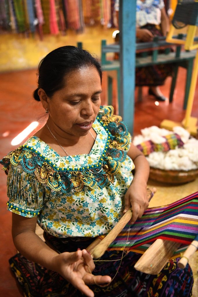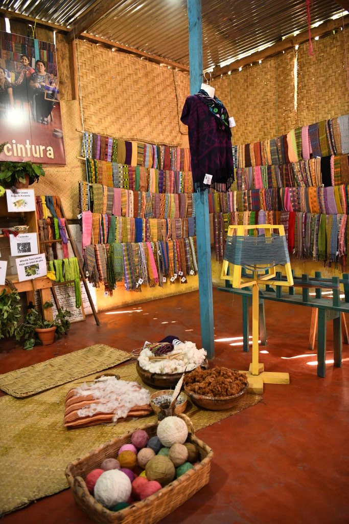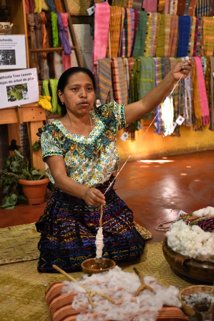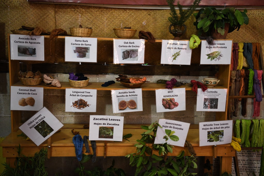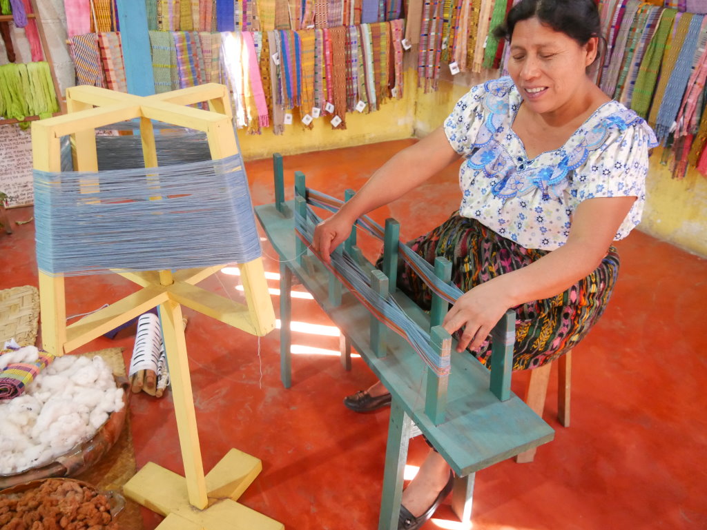 Ein Stück die Straße hinunter besuchen wir eine weitere Kooperative. Die Ixoq Ajkeem wurde vor 25 Jahren gegründet und besteht heute aus 40 Frauen. Zwei von ihnen zeigen uns ausführlich die Besonderheiten ihrer Produktionen. Alles ist nicht nur Handarbeit, sondern auch reine Naturproduktion. Die Baumwolle wird von Hand gesponnen, mit Naturfarben aus verschiedenen Pflanzen, Kräutern, Baumrinden und sogar Insekten eingefärbt und dann mit einem einfachen Rückenband- oder Hüftwebstuhl zu kurzen Stoffbahnen verwoben.