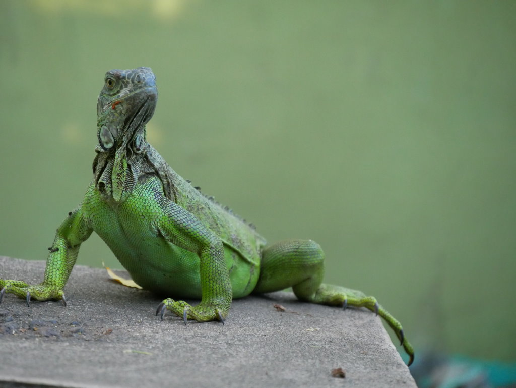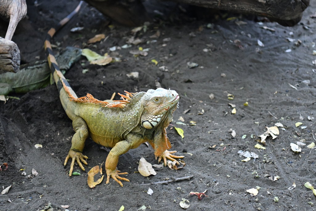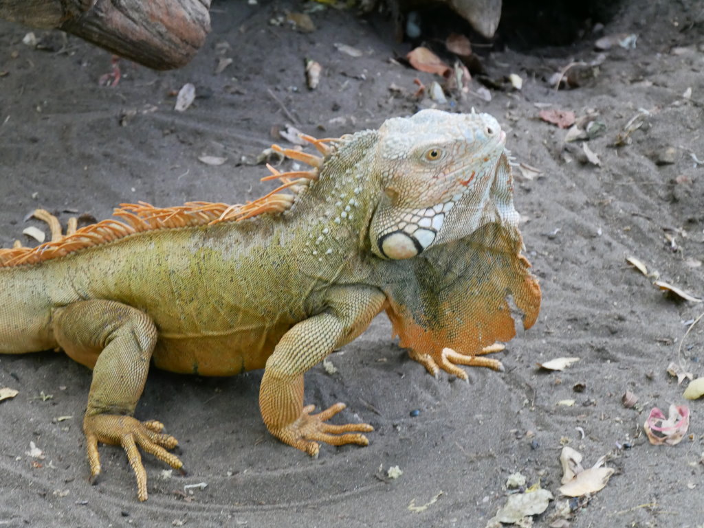 Nicht gefährdet und eher als willkommene weitere Gäste der Anlage werden einige Leguane (Iguana) verköstigt. Die in Orangetönen leuchtenden Männchen bzw. grün schillernden Weibchen und Jungtiere haben wir schon bei unserer Reise im letzten Winter in Guatemala und Belize in den Bäumen an den Flussufern beobachten können.