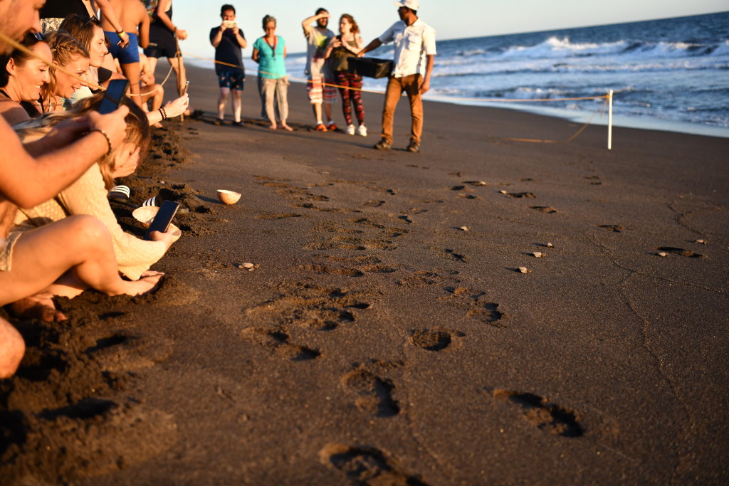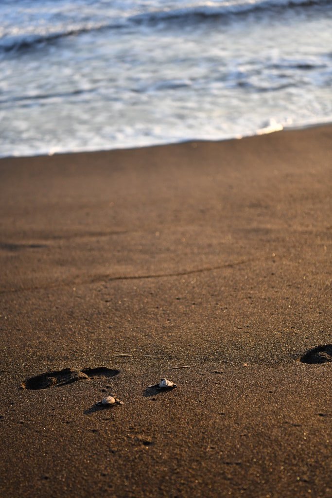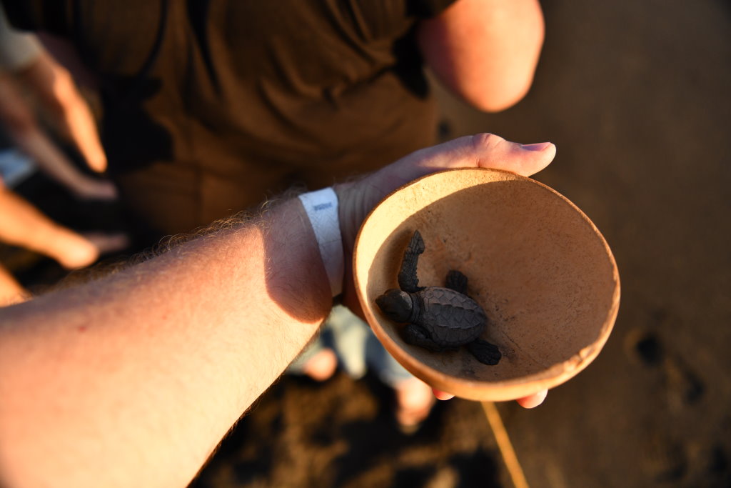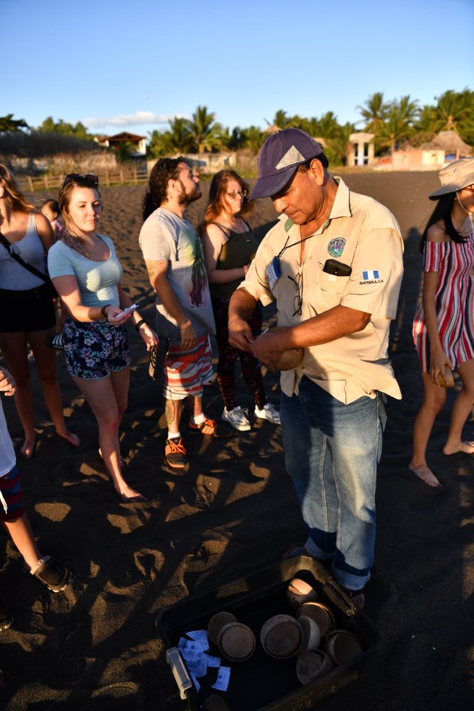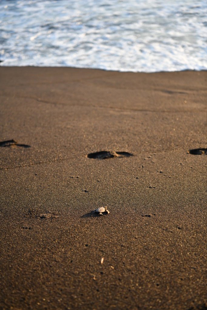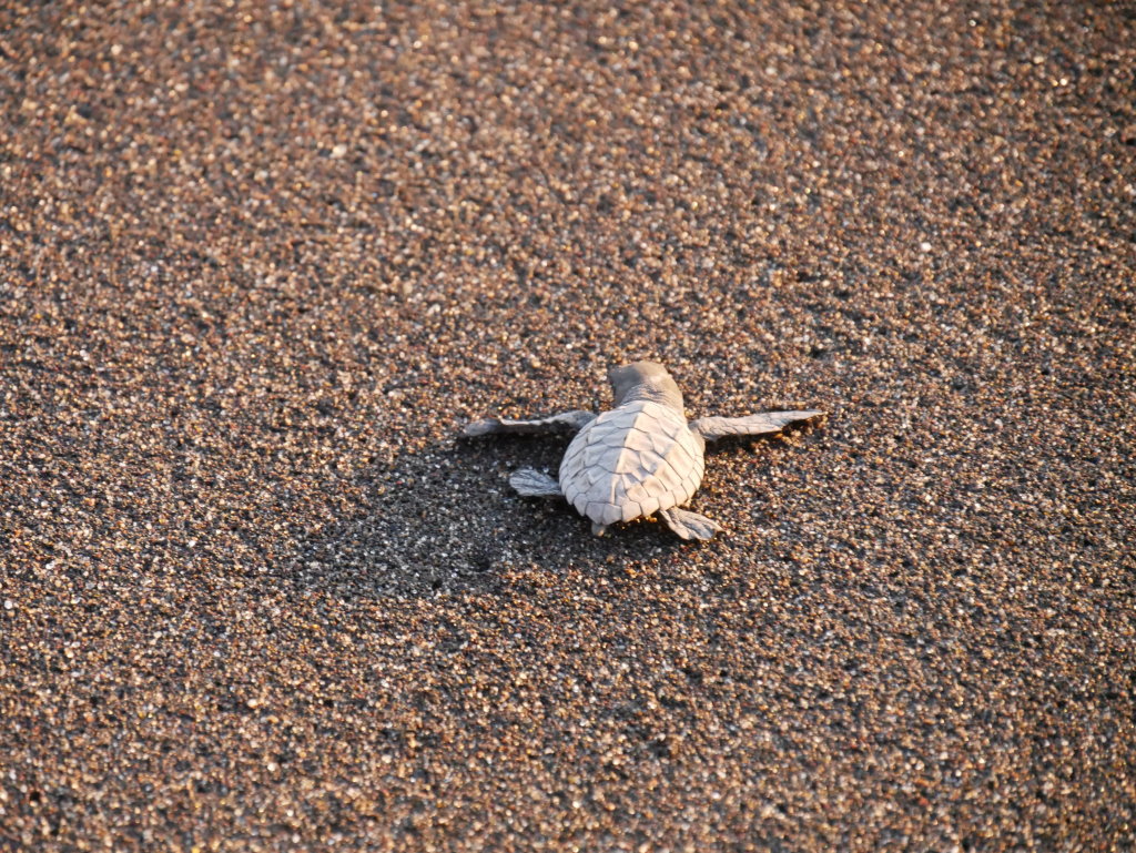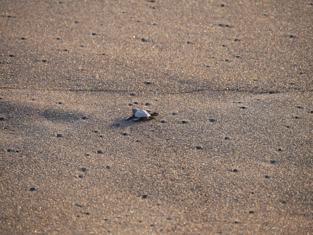 Vor Sonnenuntergang, gegen viertel nach Fünf, ist es dann soweit. Gegen eine Spende von je 10 guatemaltekischen Quetzal (etwa 1 Euro) bekommen wir ein gerade geschlüpftes Jungtier in die zuvor verteilte Kokosschale gelegt. Der Ranger zählt bis Drei und alle entlassen ihre Schützlinge in Richtung Meer. Manche der kleinen nicht ganz fingerlangen Schildkrötenbabys krabbeln erst ein paar Zentimeter, um dann vorsichtig die Lage zu sondieren. Cosy hat ihrem kleinen Schützling vor der Entlassung einen Namen und ein paar motivierende Worte mit auf den Weg gegeben. Das zeigt Wirkung. Während ihre Kollegen noch zögern, sprintet der kleine Racker munter als erste in die Wellen, die sich am schwarzen Sandstrand von Monterrico brechen…