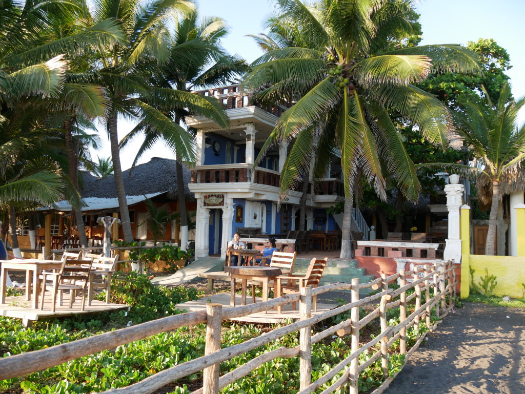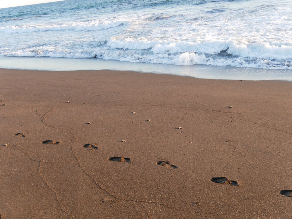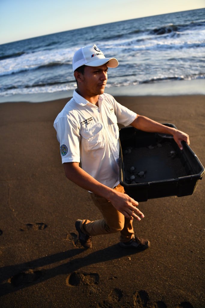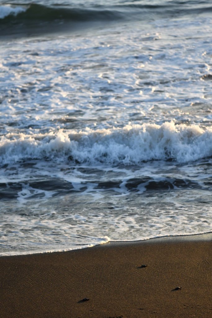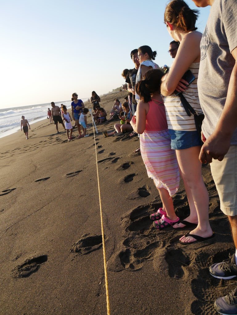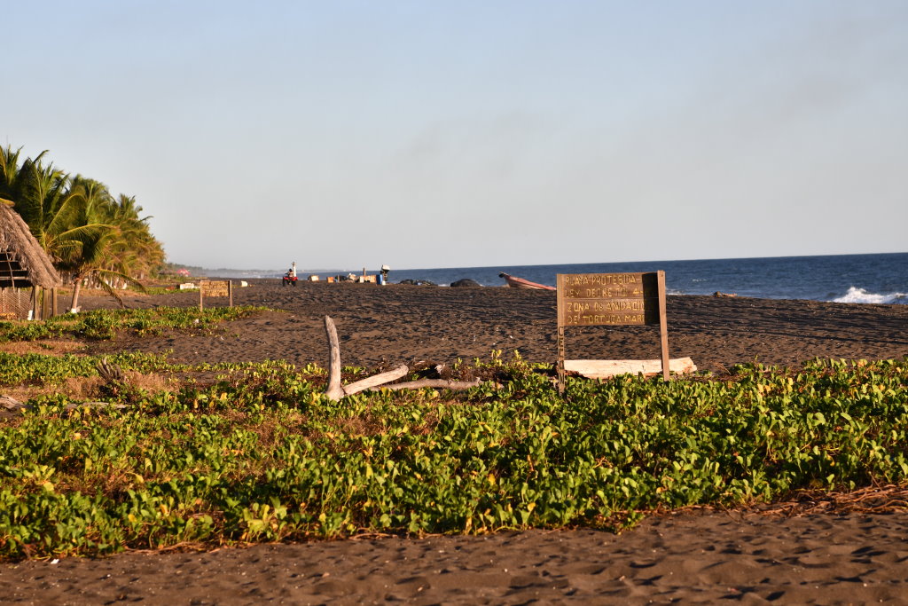Vor Sonnenuntergang, gegen viertel nach Fünf, ist es dann soweit. Gegen eine Spende von je 10 guatemaltekischen Quetzal (etwa 1 Euro) bekommen wir ein gerade geschlüpftes Jungtier in die zuvor verteilte Kokosschale gelegt. Der Ranger zählt bis Drei und alle entlassen ihre Schützlinge in Richtung Meer. Manche der kleinen nicht ganz fingerlangen Schildkrötenbabys krabbeln erst ein paar Zentimeter, um dann vorsichtig die Lage zu sondieren. Cosy hat ihrem kleinen Schützling vor der Entlassung einen Namen und ein paar motivierende Worte mit auf den Weg gegeben. Das zeigt Wirkung. Während ihre Kollegen noch zögern, sprintet der kleine Racker munter als erste in die Wellen, die sich am schwarzen Sandstrand von Monterrico brechen…