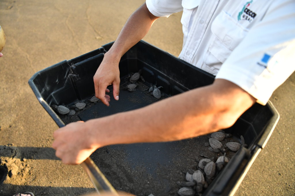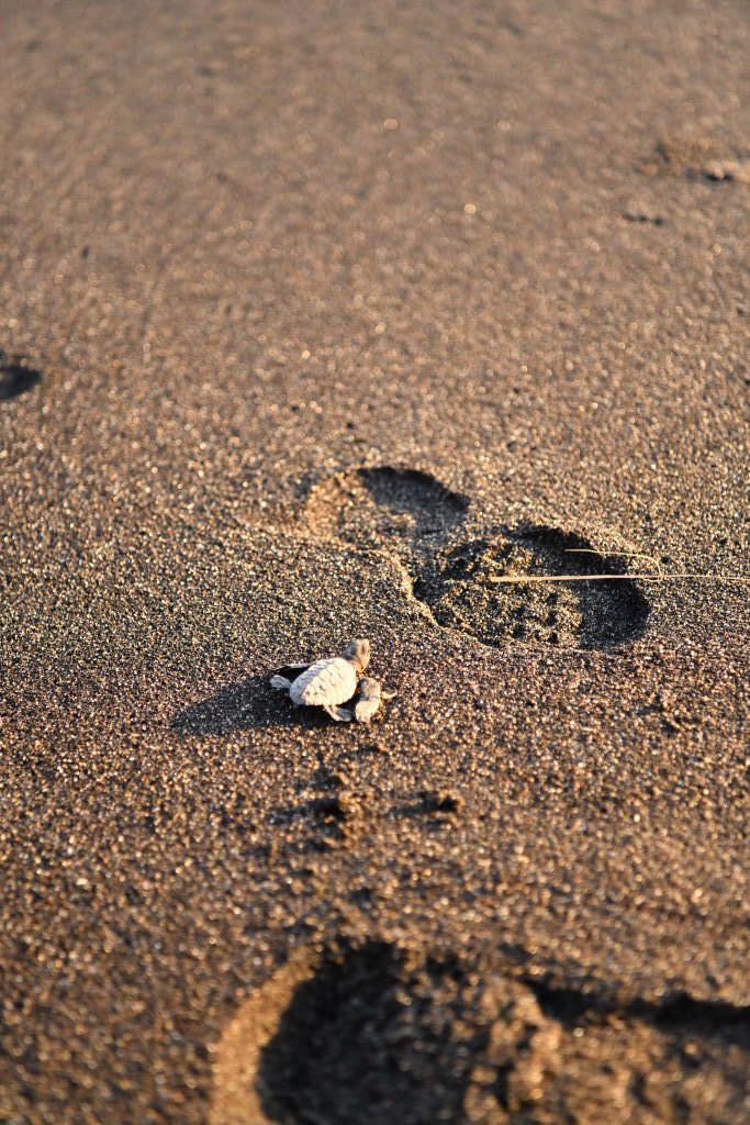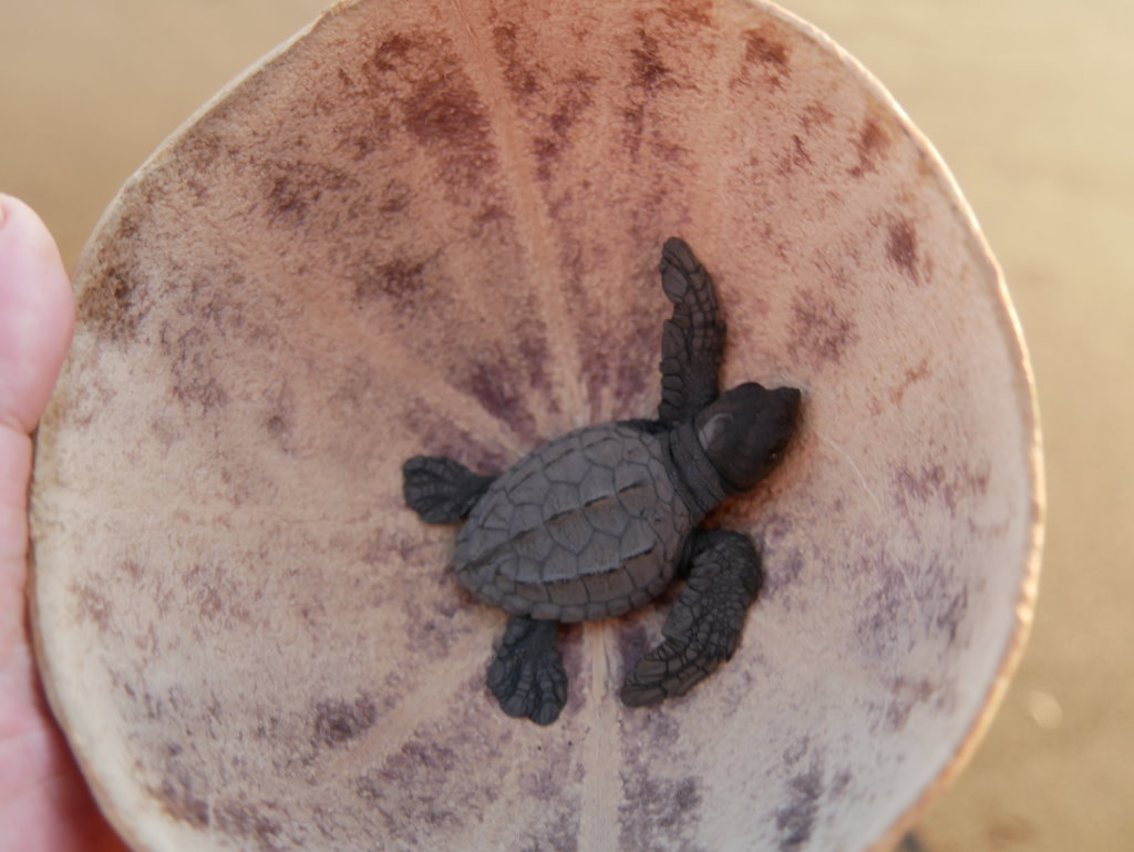 In Strandnähe befindet sich das große Brutareal für die Schildkröten. Vor allem die Temperatur der einzelnen Gelege mit bis zu 80 Eiern muss überwacht werden. Ist der Sand zu heiß (29,7 – 32 Grad), schlüpfen fast nur Weibchen, ist er zu kühl (27 – 28,7 Grad) erblicken vor allem männliche Tiere nach etwa 60 Tagen das Licht. Jetzt im Januar sind es Lederschildkröten, die aufgezogen werden.
