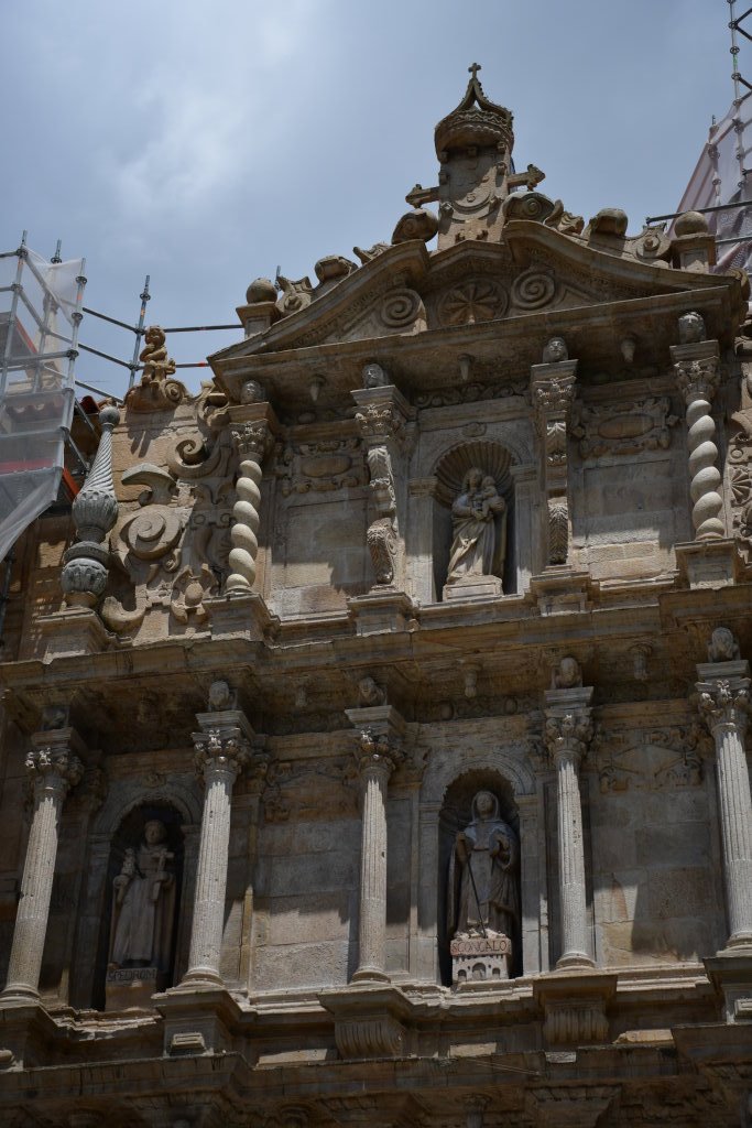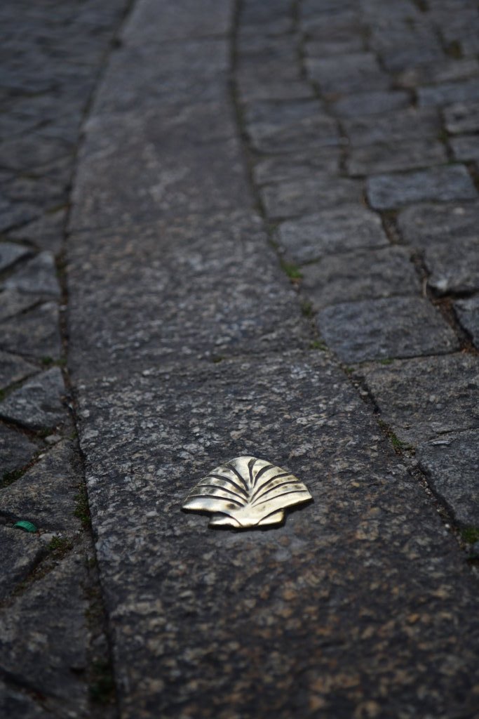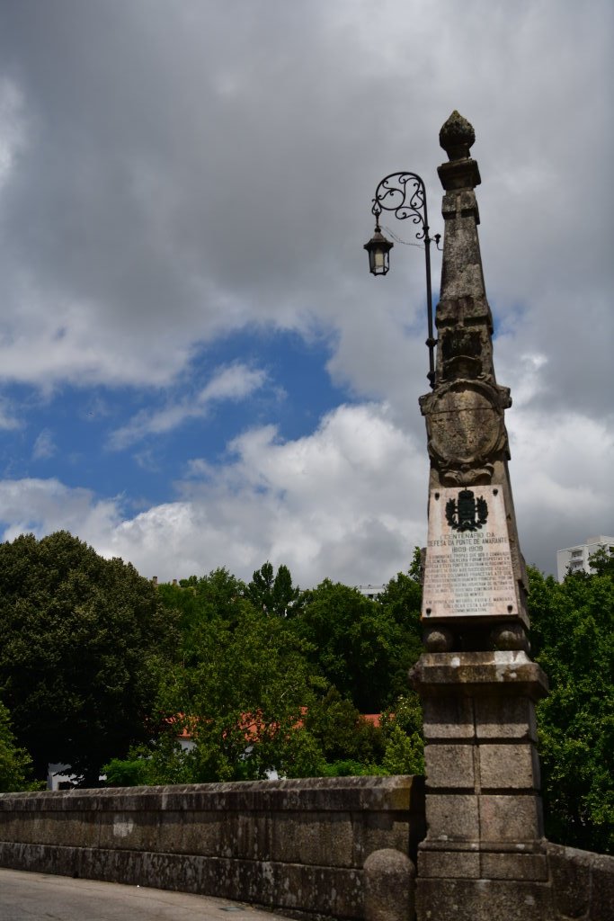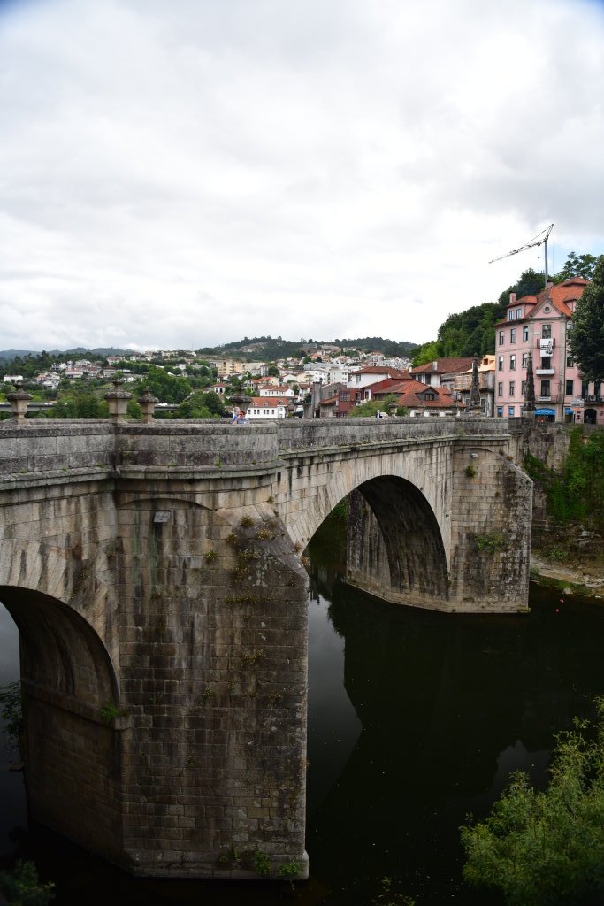 Frisch gestärkt erkunden wir noch ein wenig die historische Altstadt. Hier verläuft offensichtlich der portugiesische Jakobsweg, erkennbar an den in das Pflaster vor der Steinbrücke eingelassenen Jakobsmuscheln. Die „Stolpersteine“ aus Messing weisen den Weg zum Kloster São Gonçalo auf der anderen Seite der Brücke. Es wird derzeit gerade renoviert.