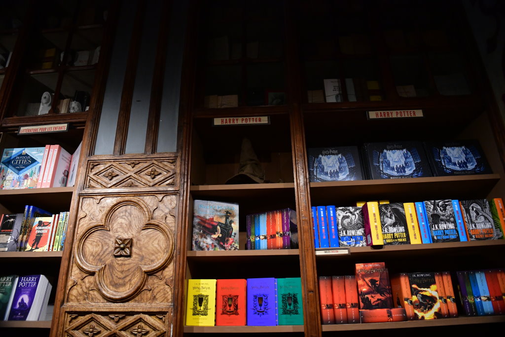Zwei Regale mit diversen Ausgaben von Büchern des sympathischen Zauberers zählen neben der Treppe zu den gesuchten Locations für die Selfies der meist jugendlichen Besucher.