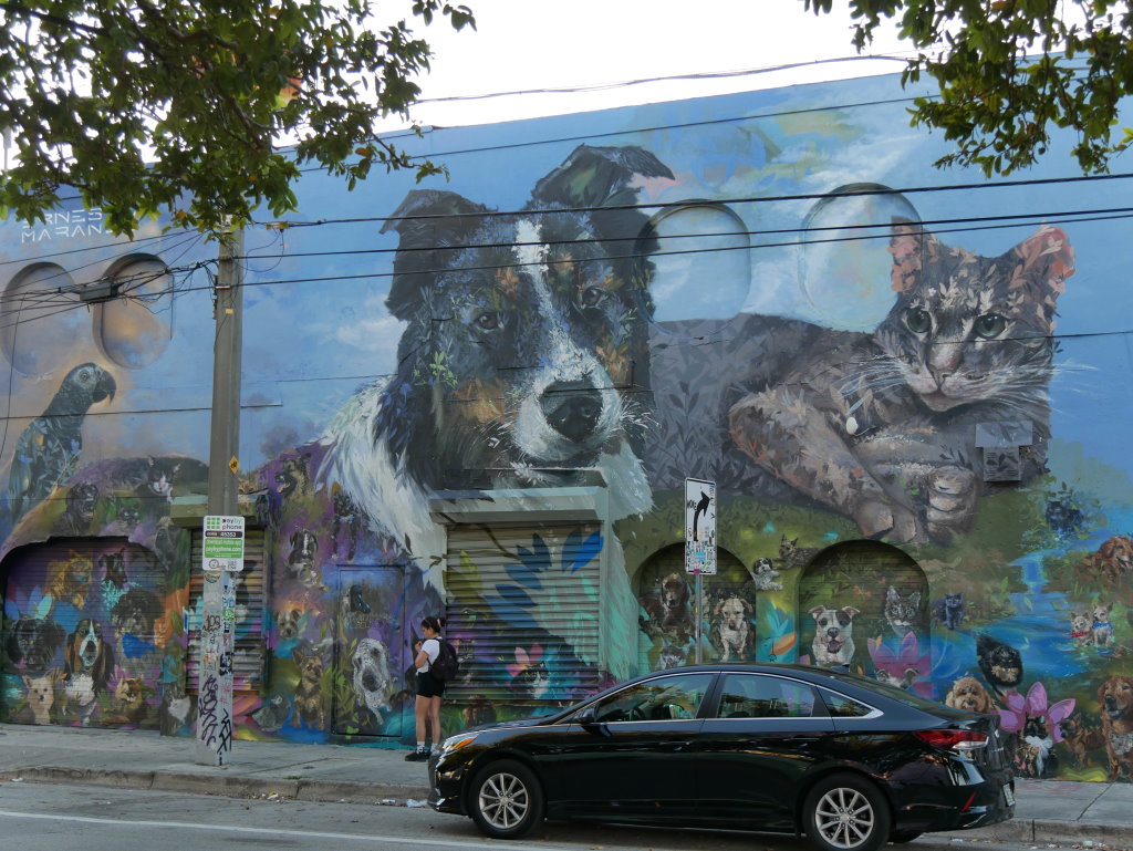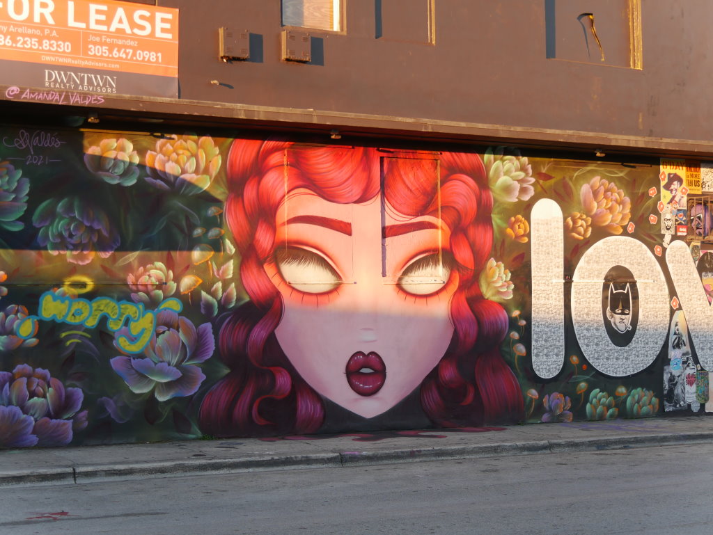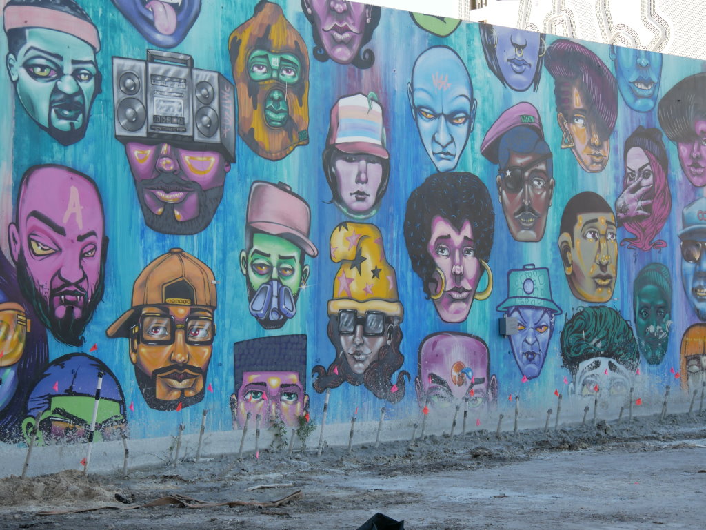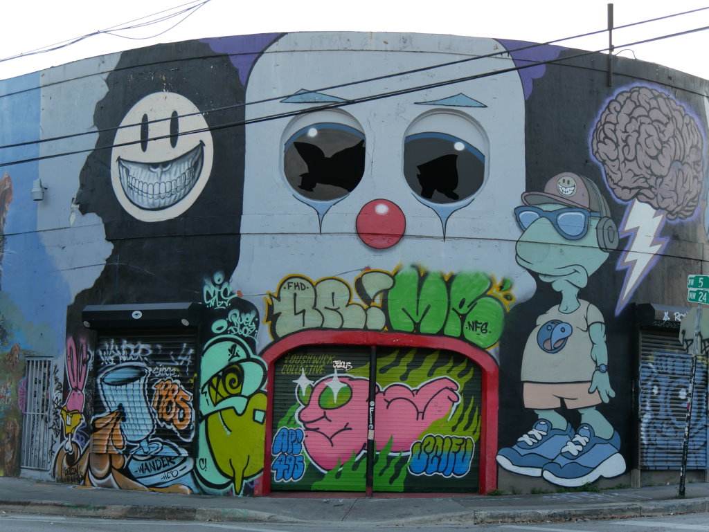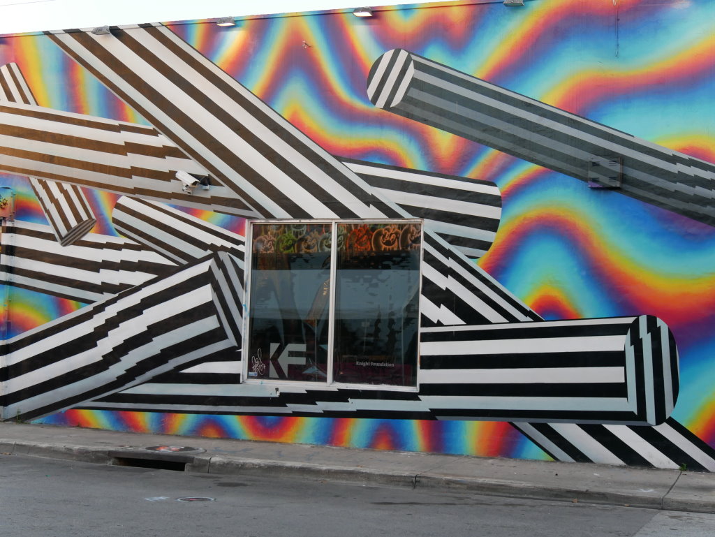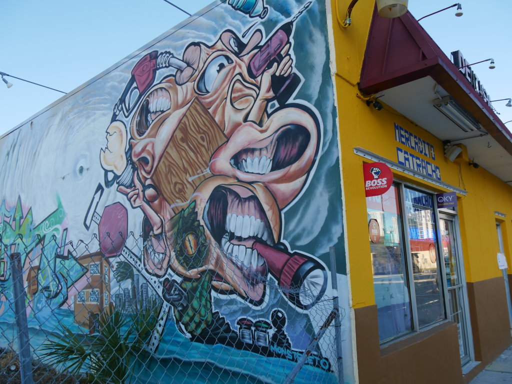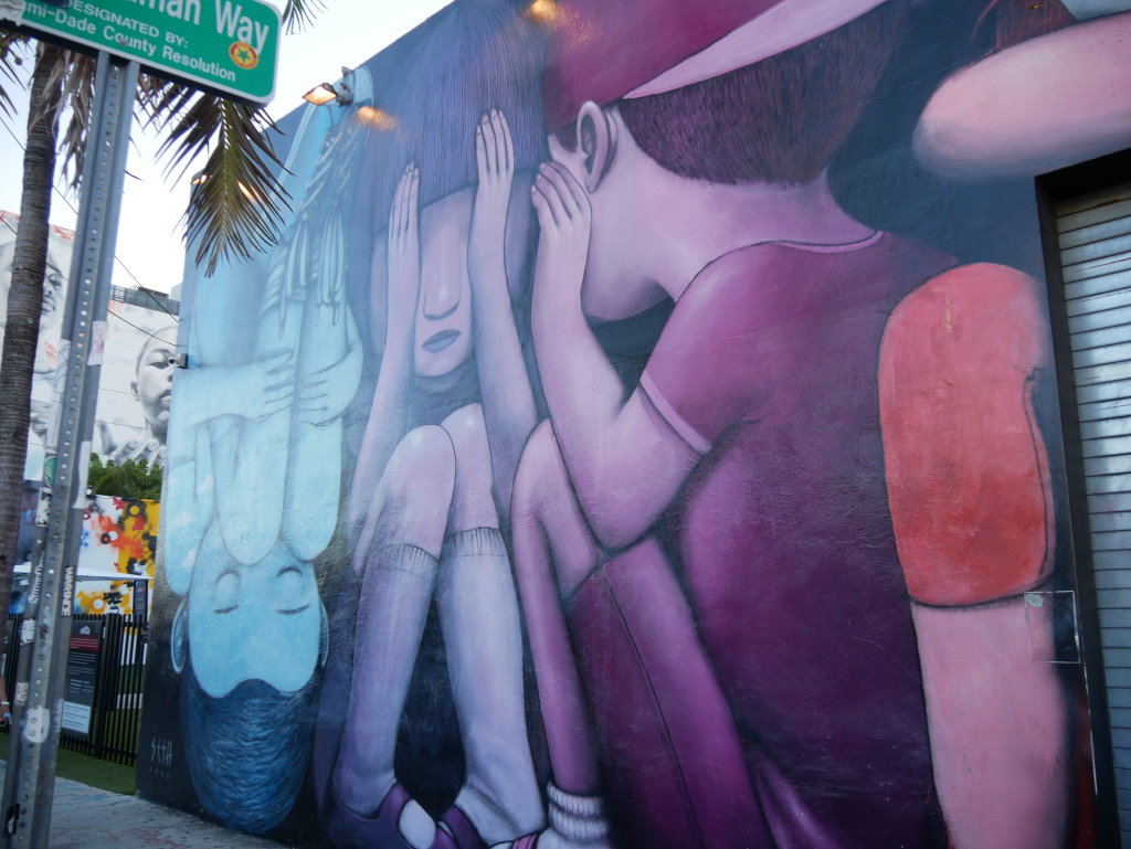 In bonbonfarbene Pastellfarben getauchte Architektur und Jan Hammers Titelmelodie von Miami Vice, mit diesem Bild von Miami bin ich in den 1980er-Jahren aufgewachsen.. Das passte auch 2006 noch, als ich zum ersten Mal hier war und meine fernsehgeprägten Erinnerungen voll bestätigt fand. Heute hat sich das geändert. Die schiere Flut der Street Art Werke im Stadtteil Wynwood sprengt alles, was ich mit Cosy auf unseren letzten Reisen bislang in diesem Zusammenhang gesehen habe.