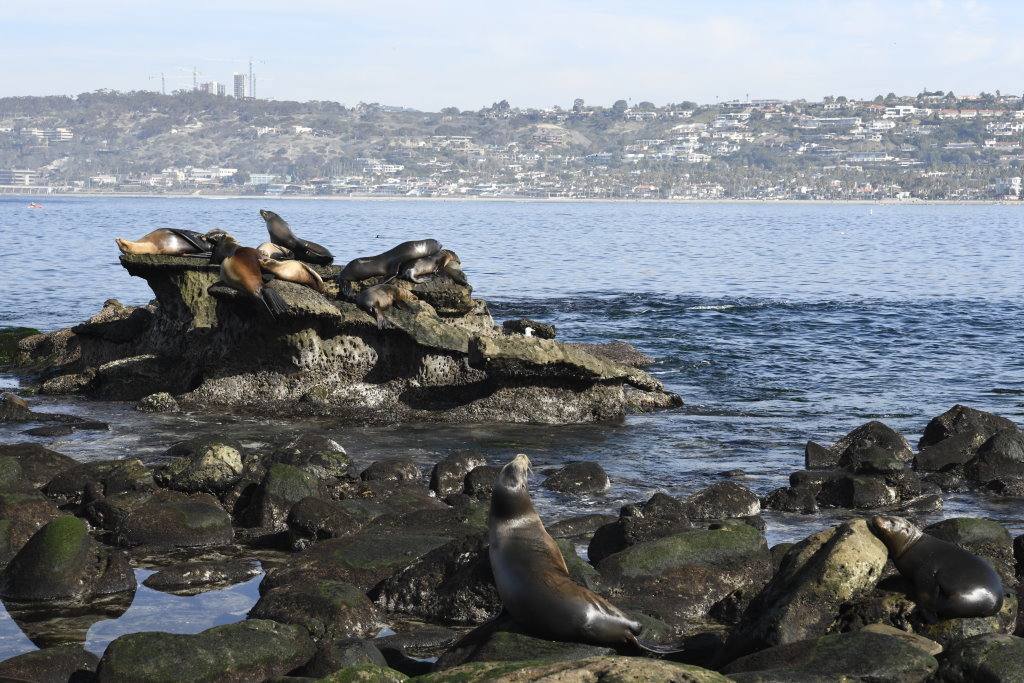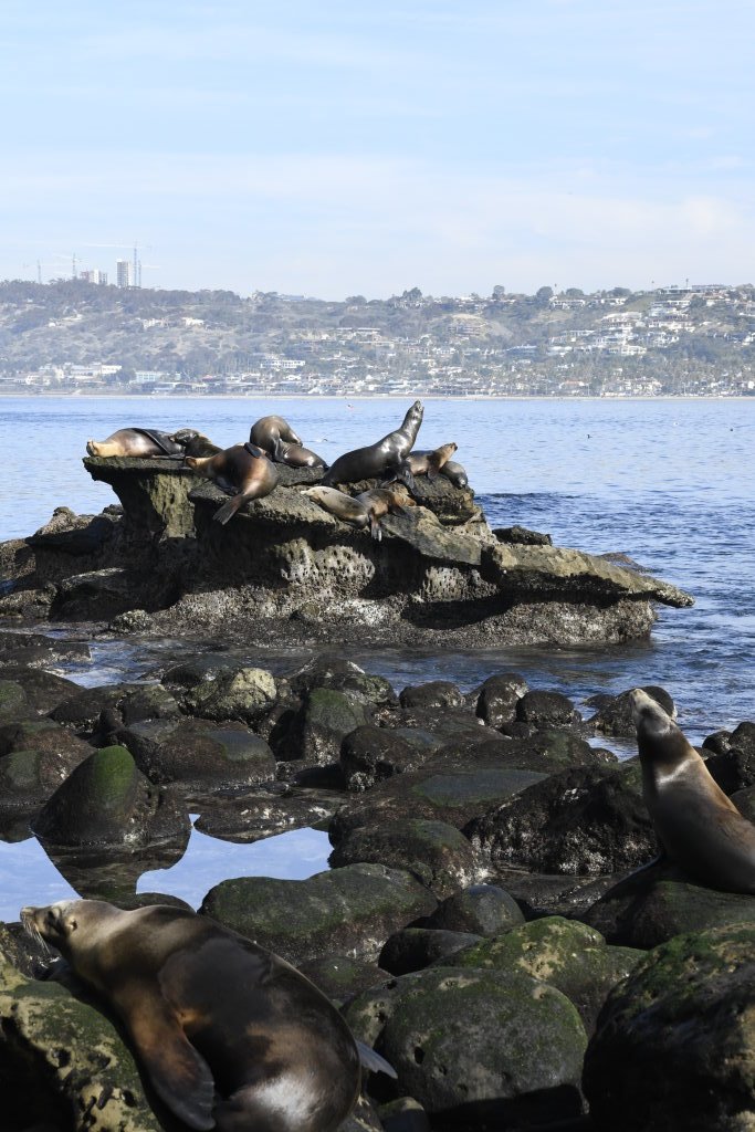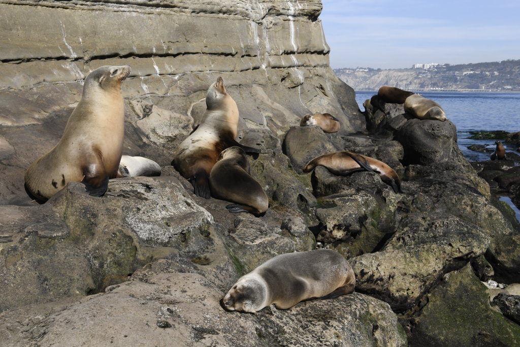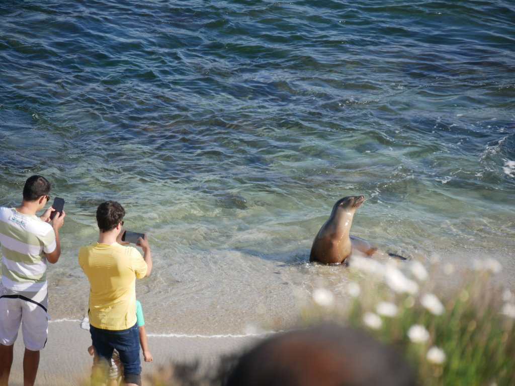 Wir haben Glück und finden schnell einen Parkplatz am Coast Boulevard unweit der La Jolla Cove. Wir hätten auch nicht lange nach den Seelöwen und Seehunden suchen müssen, die sich hier auf den Felsen in der Brandung sonnen. Die Tiere riechen recht heftig. Also einfach immer der Nase nach. Man kann sie von der Aussichtsplattform aus beobachten, aber auch den steinigen Strandabschnitt hinunterklettern. Aber selbst , wenn man sehr nah an sie herankommt, sollte ein gewisser Abstand zu den Raubtieren gewahrt werden…