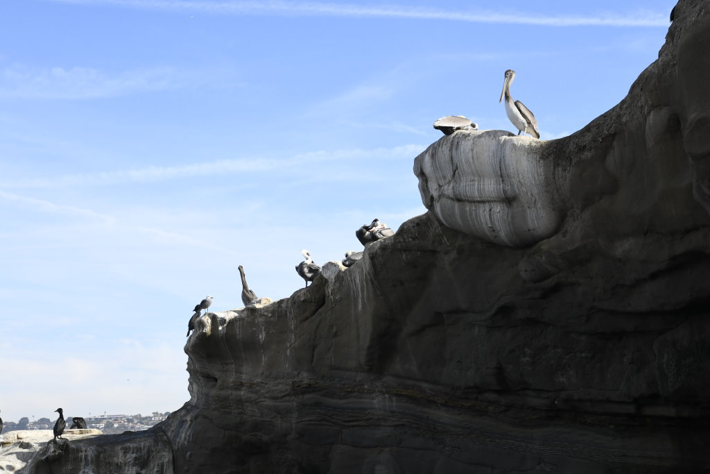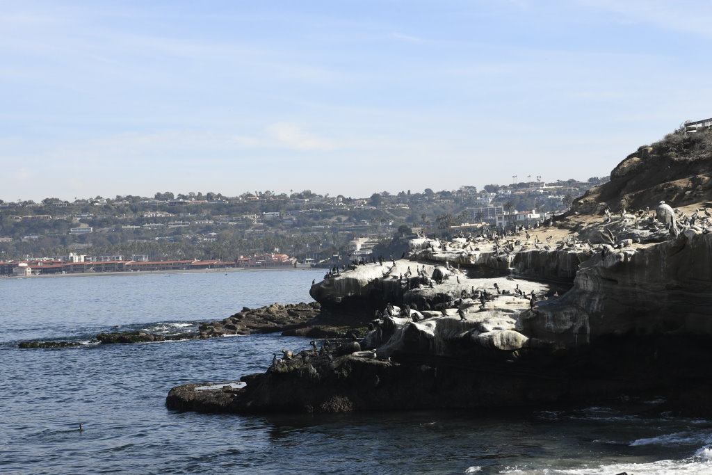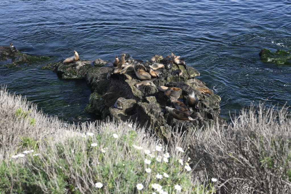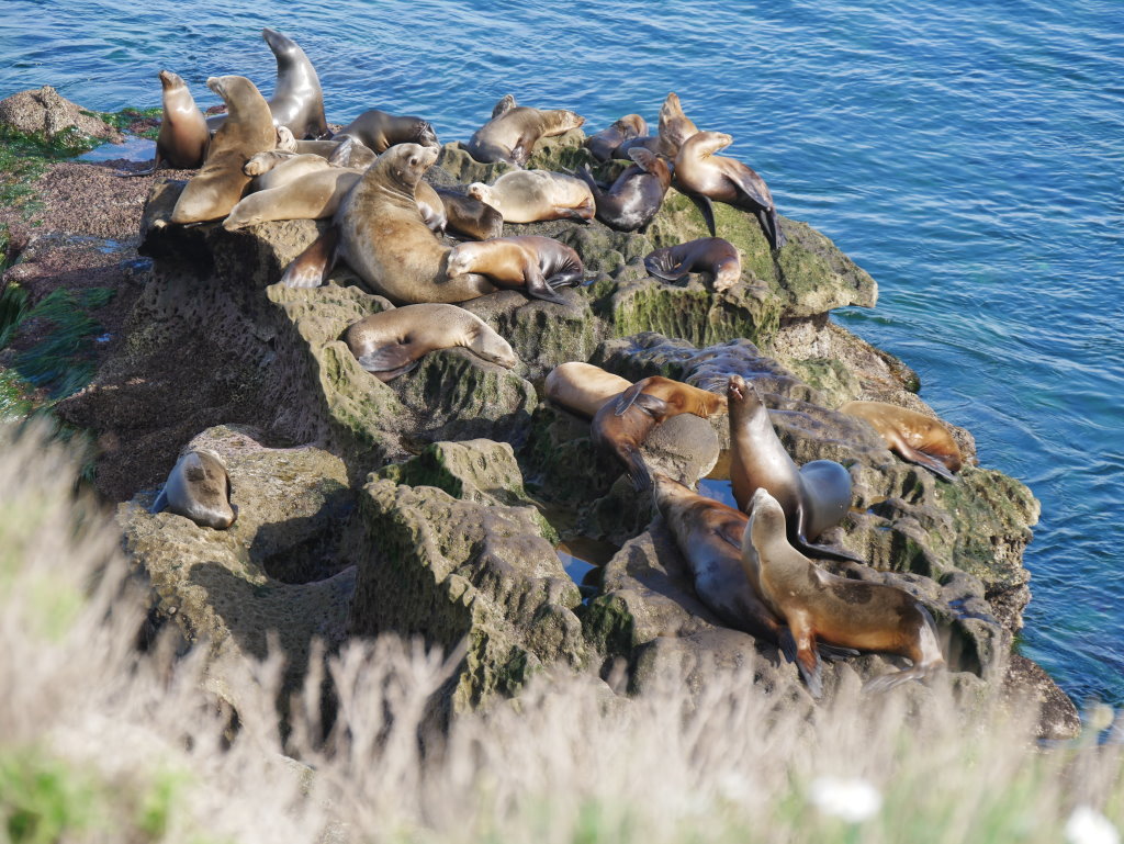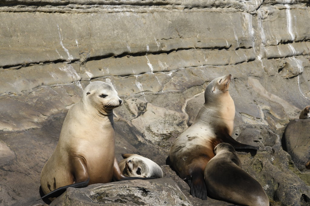 Wir haben Glück und finden schnell einen Parkplatz am Coast Boulevard unweit der La Jolla Cove. Wir hätten auch nicht lange nach den Seelöwen und Seehunden suchen müssen, die sich hier auf den Felsen in der Brandung sonnen. Die Tiere riechen recht heftig. Also einfach immer der Nase nach. Man kann sie von der Aussichtsplattform aus beobachten, aber auch den steinigen Strandabschnitt hinunterklettern. Aber selbst , wenn man sehr nah an sie herankommt, sollte ein gewisser Abstand zu den Raubtieren gewahrt werden…