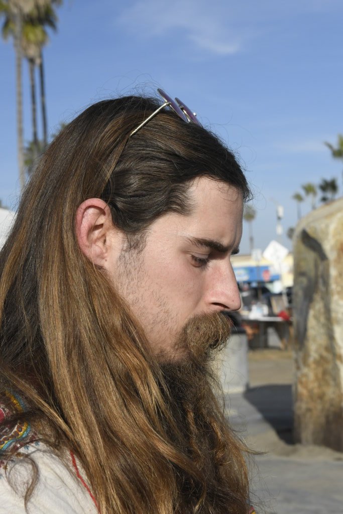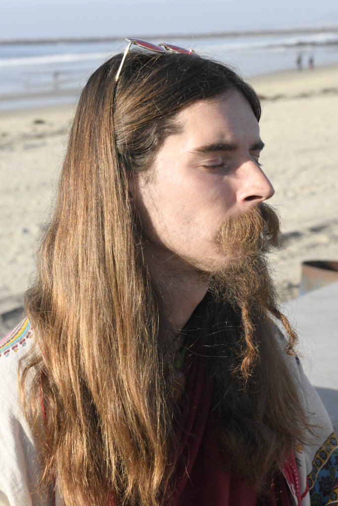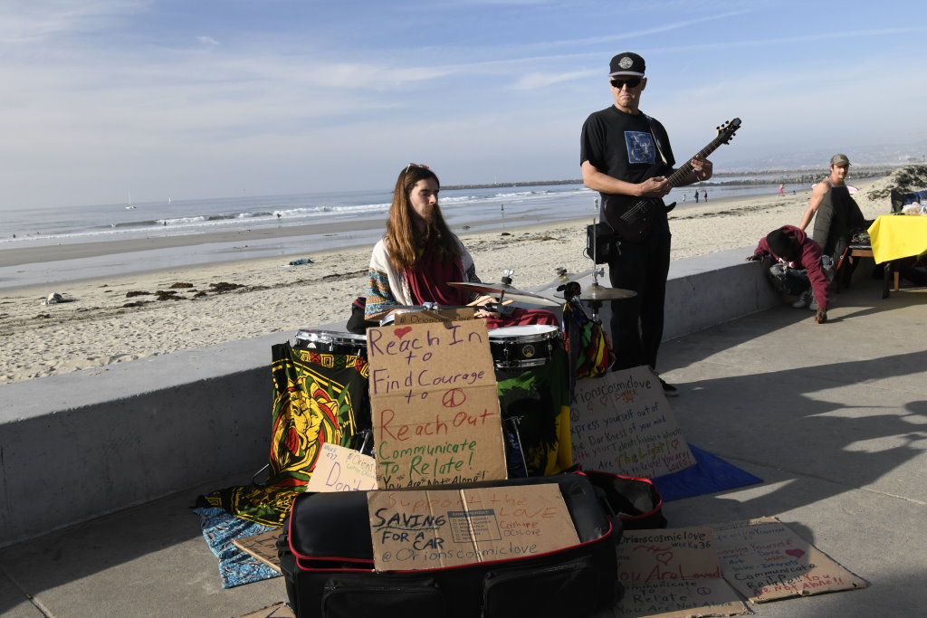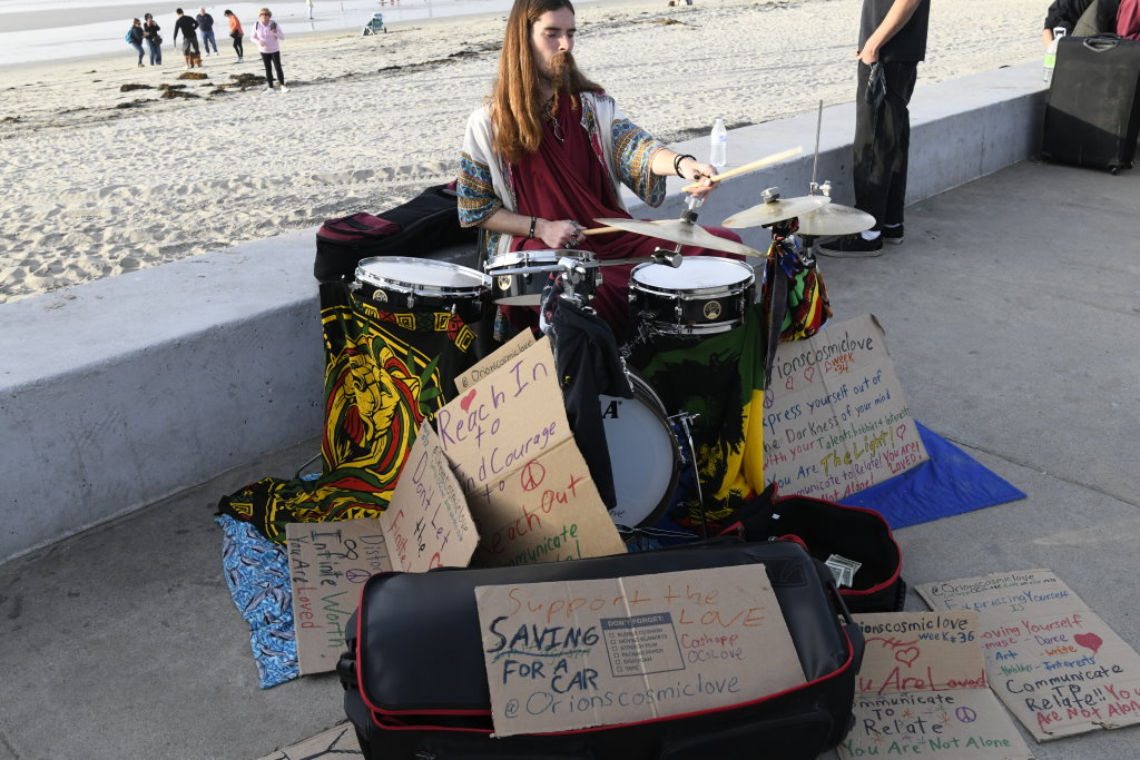 Am Strand begegne ich Orion McAllister, der sich hier regelrecht in Trance zu trommeln scheint. In einer kurzen Verschnaufpause komme ich mit ihm ins Gespräch. Der 27jährige New Yorker lebt seit 15 Jahren in San Diego. Er habe keine leichte Kindheit gehabt… Während der Woche füllt er nachts in einem Supermarkt Regale auf – ein Knochenjob.