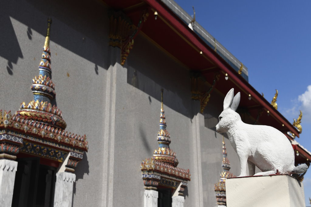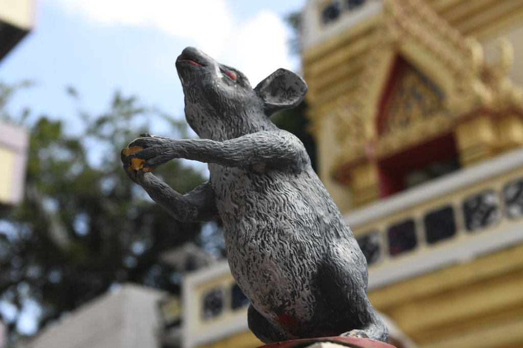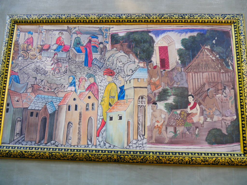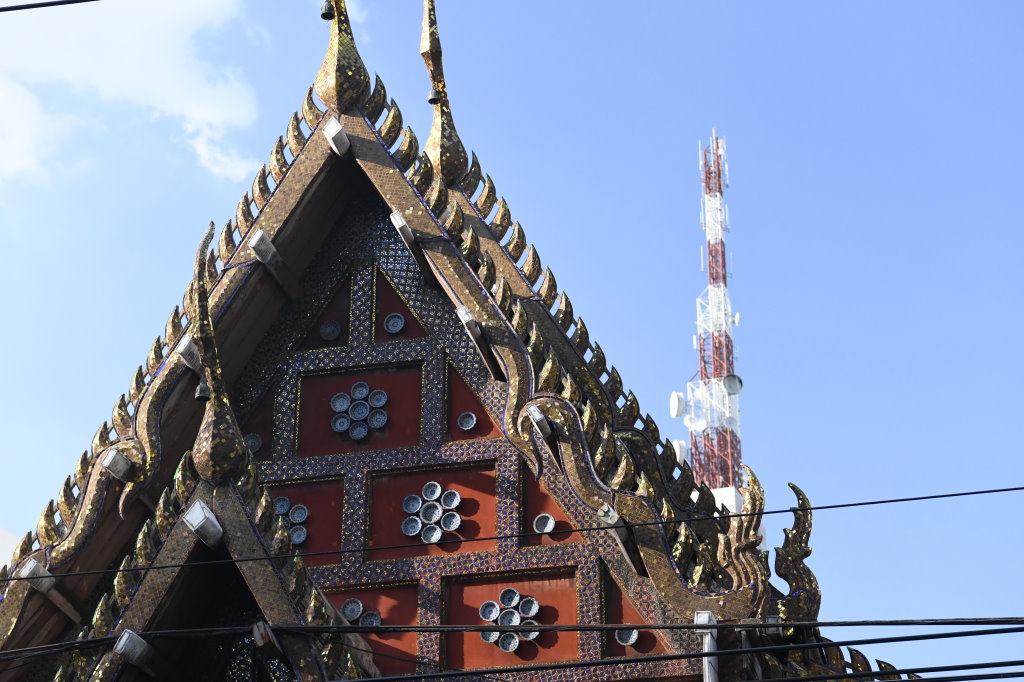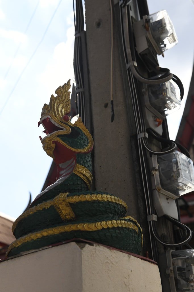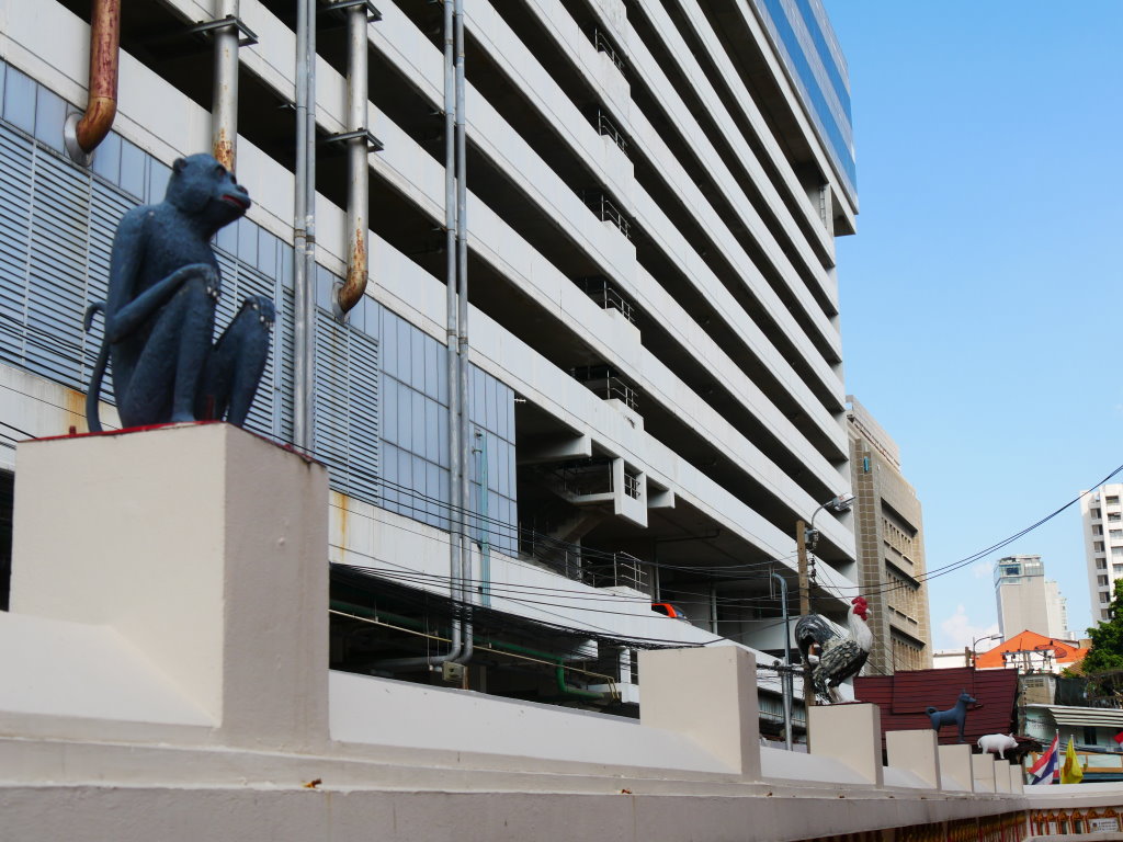 Nach einem späten Frühstück erkunden wir erst einmal die Umgebung. Im Block hinter unserem Hotel befindet sich ein kleines buddhistisches Kloster. Die Mauer rund um den Wat wird von den zwölf Tierkreiszeichen des chinesischen Horoskops bevölkert: Ratte, Büffel, Tiger, Hase, Drache, Schlange, Pferd, Ziege, Affe, Hahn, Hund und Schwein.