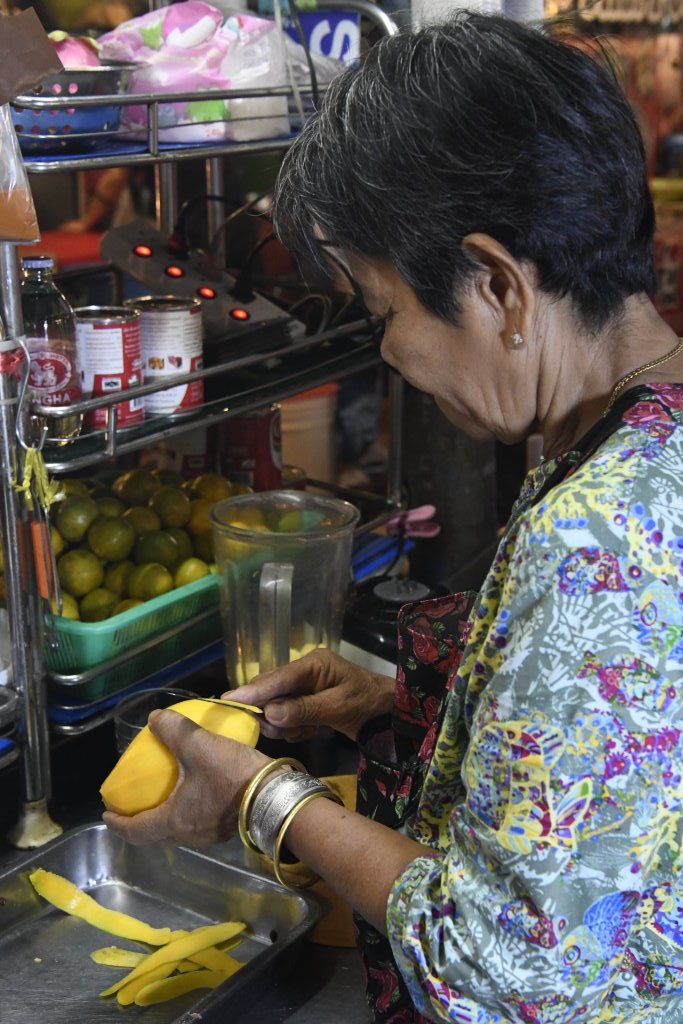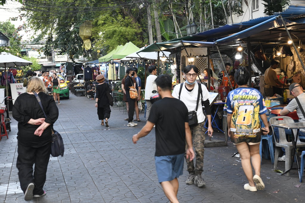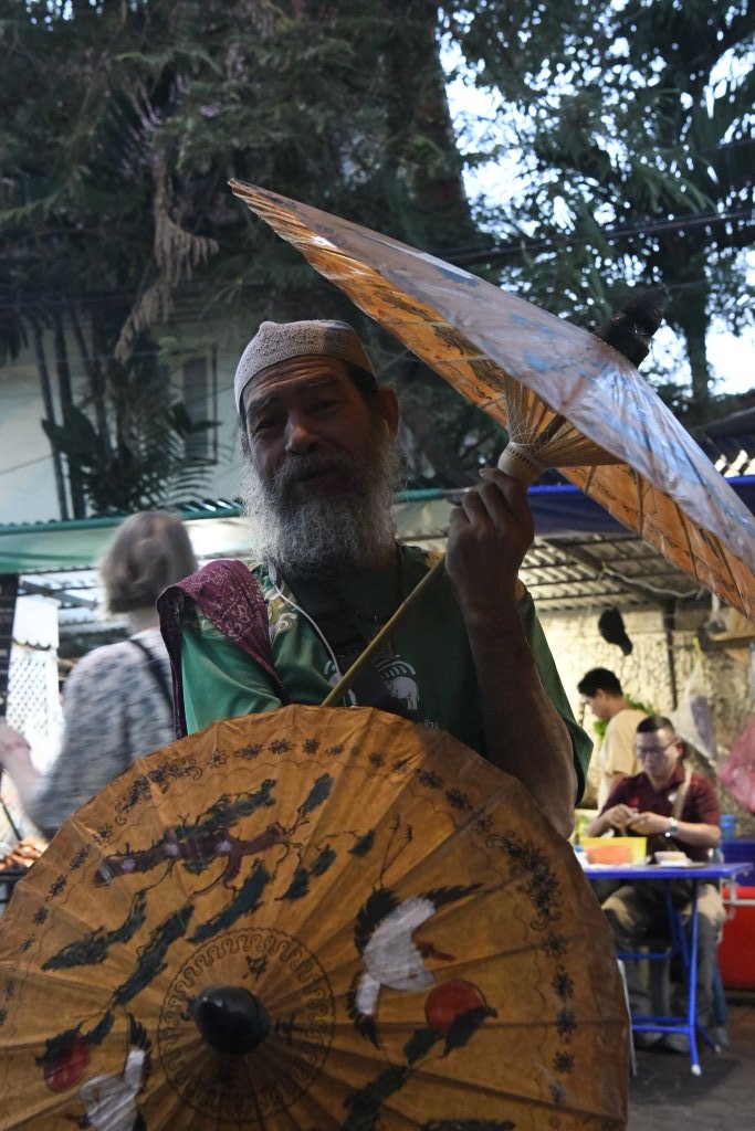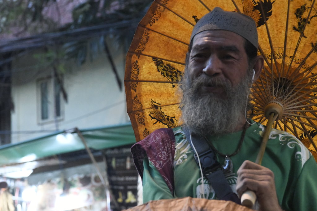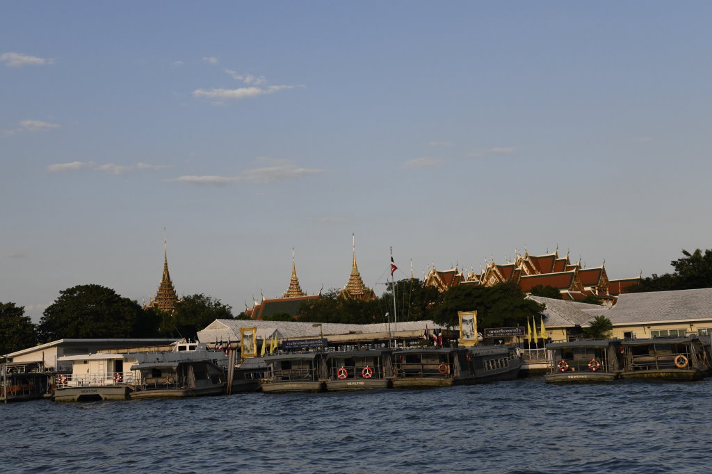 Wir nehmen das Express Boot und fahren auf dem Chao Phraya am Königspalast vorbei bis zur Haltestelle Phra Arthit. Von dort sind es wenige Minuten bis zur bei den Backpackern beliebten Khao San Road. Auch wir haben dort in den vergangenen Jahren ein paar Mal übernachtet. Viel verändert hat sich hier eigentlich nicht: Sie sind alle noch oder wieder da. Ob Schneider, die ihre Dienste anbieten, aufdringliche Schirmhändler, oder die Andenkenverkäuferinnen mit ihrer hölzernen Frosch-Ratsche und die obligatorischen Händlerinnen mit dem kleinen Skorpion-snack für zwischendurch. Es hat sich wenig verändert seit unserem letzten Besuch im Januar 2017 auf dem Rückweg von Kambodscha. Der Andrang ist noch immer oder wieder ungebrochen. Er scheint eher größer als damals.