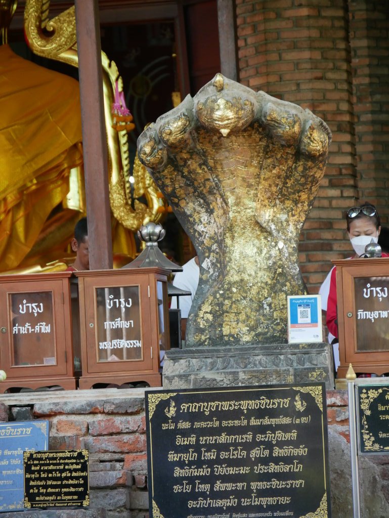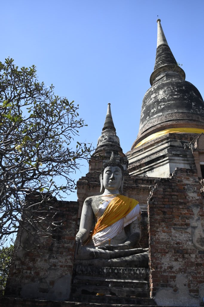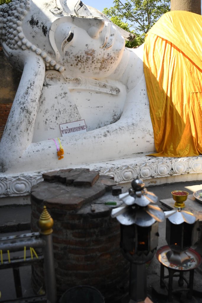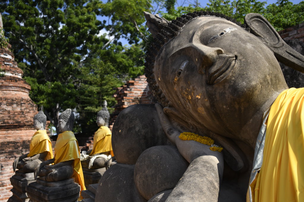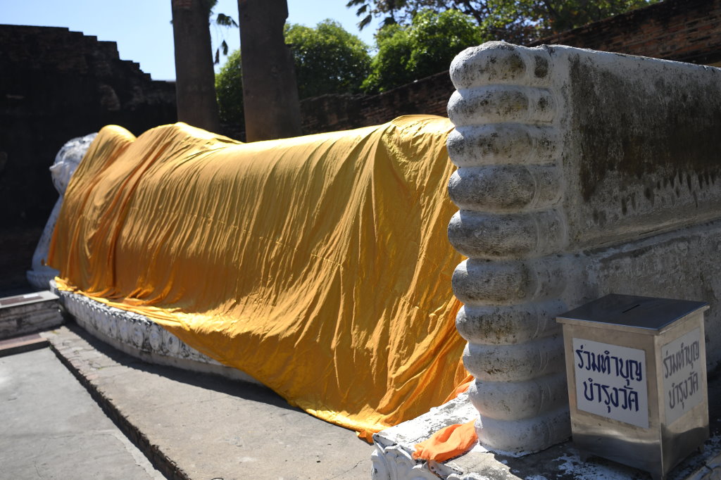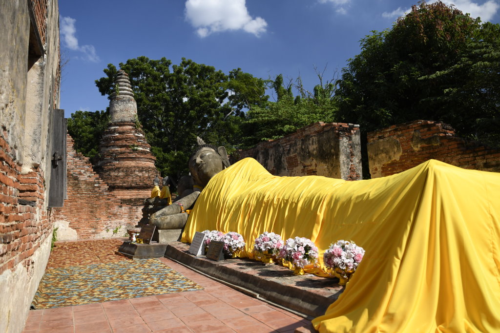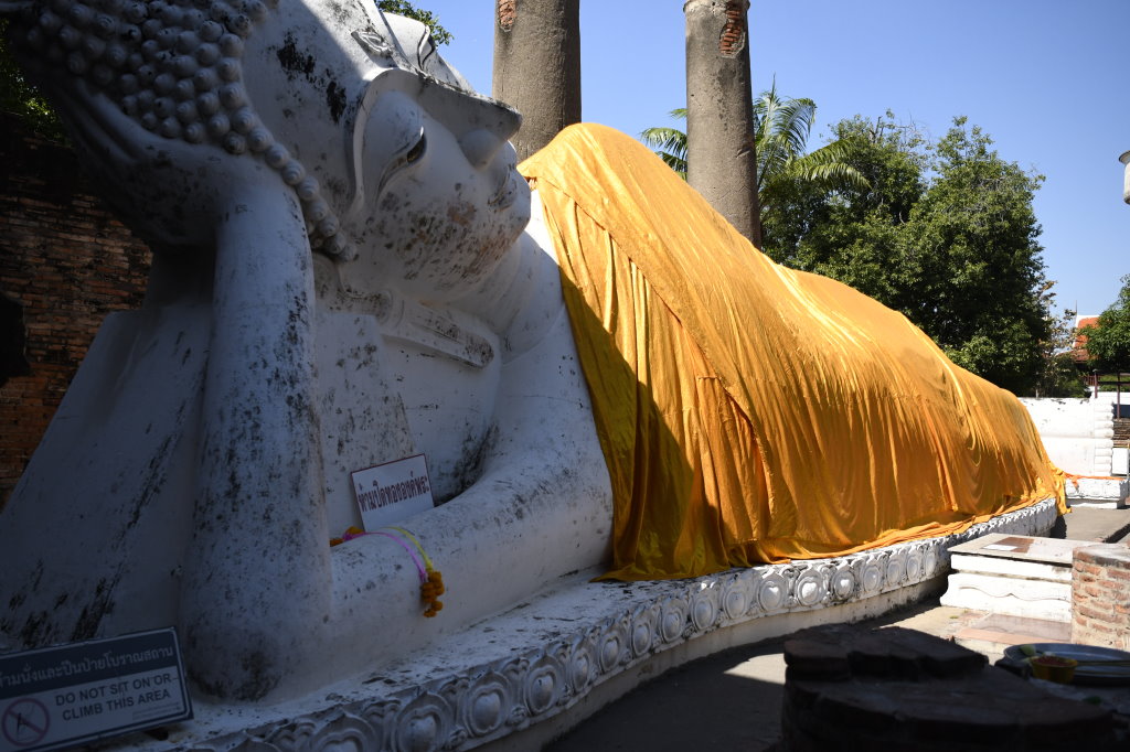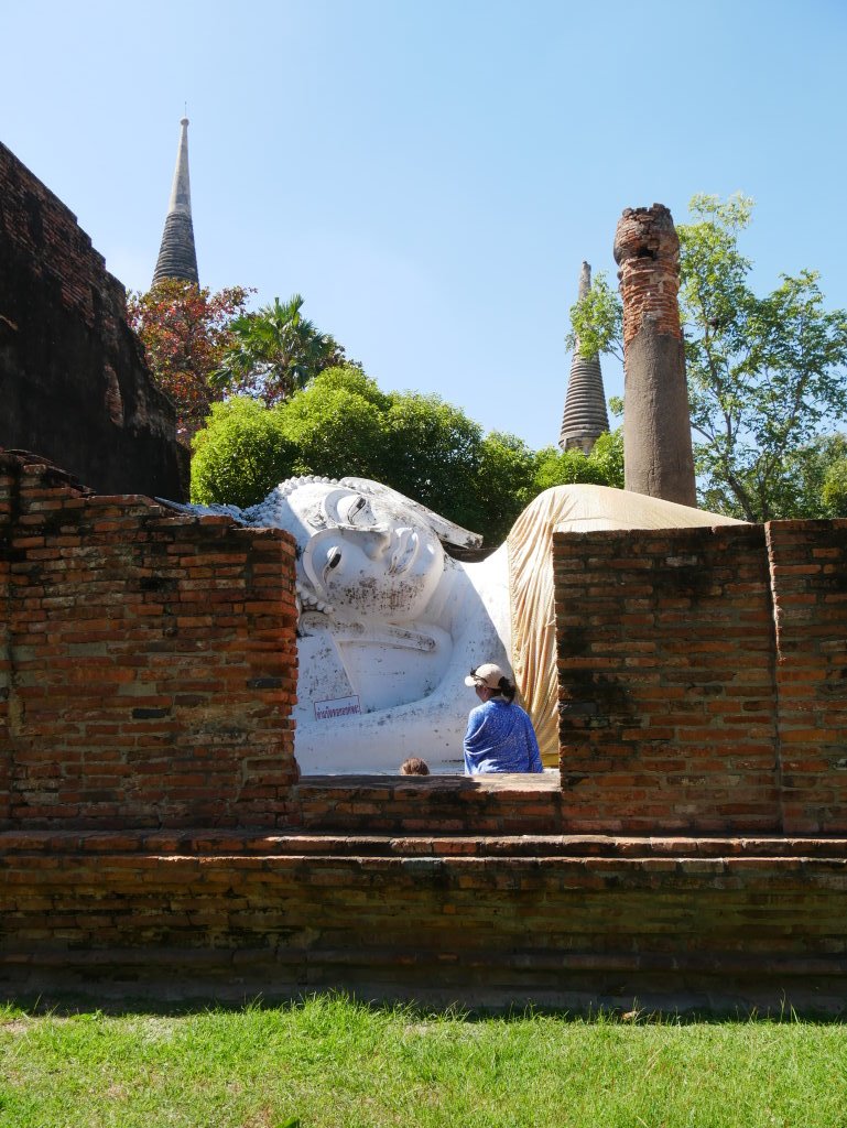 Die Ruinen des Wat Ratchaburana besichtigen wir nach dem Frühstück noch zu Fuß, dann heuern wir einen Tuk-Tuk-Fahrer an. Wisit Suparanon berechnet pro Stunde 300 Baht (ca. 7,50 Euro) und bringt uns bequem zum fünfzehn Fahrminuten südöstlich der Stadtmauern gelegenen Wat Yai Chai Mongkorn. Der liegende Buddha unweit des achzig Meter hohen Chedis hatte uns bei der Reisevorbereitung neugierig gemacht.