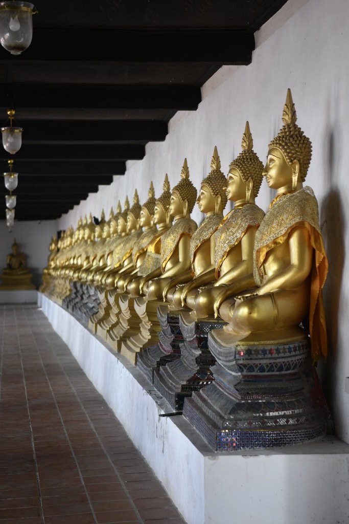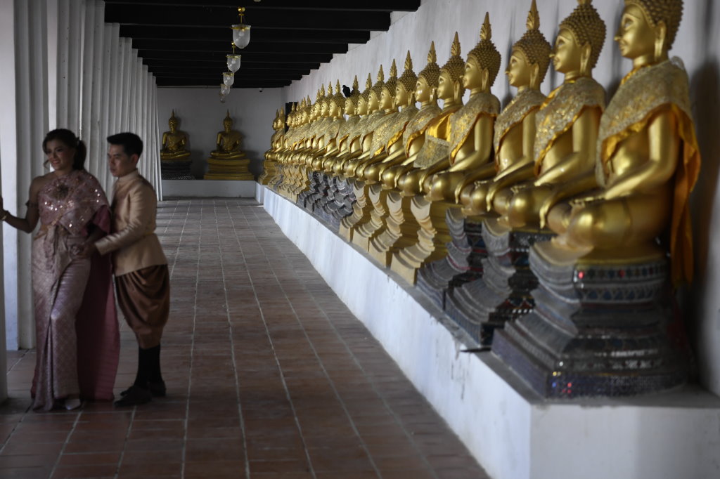 An den Wänden eines nach innen offenen Kreuzgangs befinden sich zahlreiche vergoldete Buddha-Statuen; ein Ambiente, das gerade von einem thailändischen Paar als Kulisse für ihre Hochzeitsfotos genutzt wird.