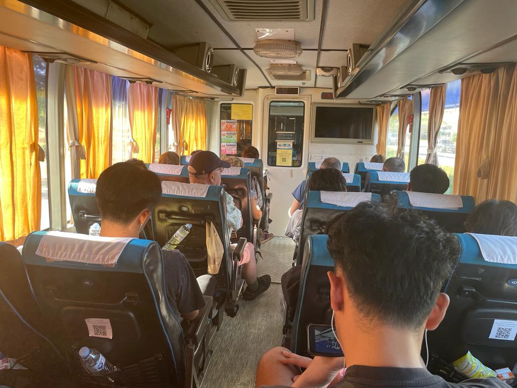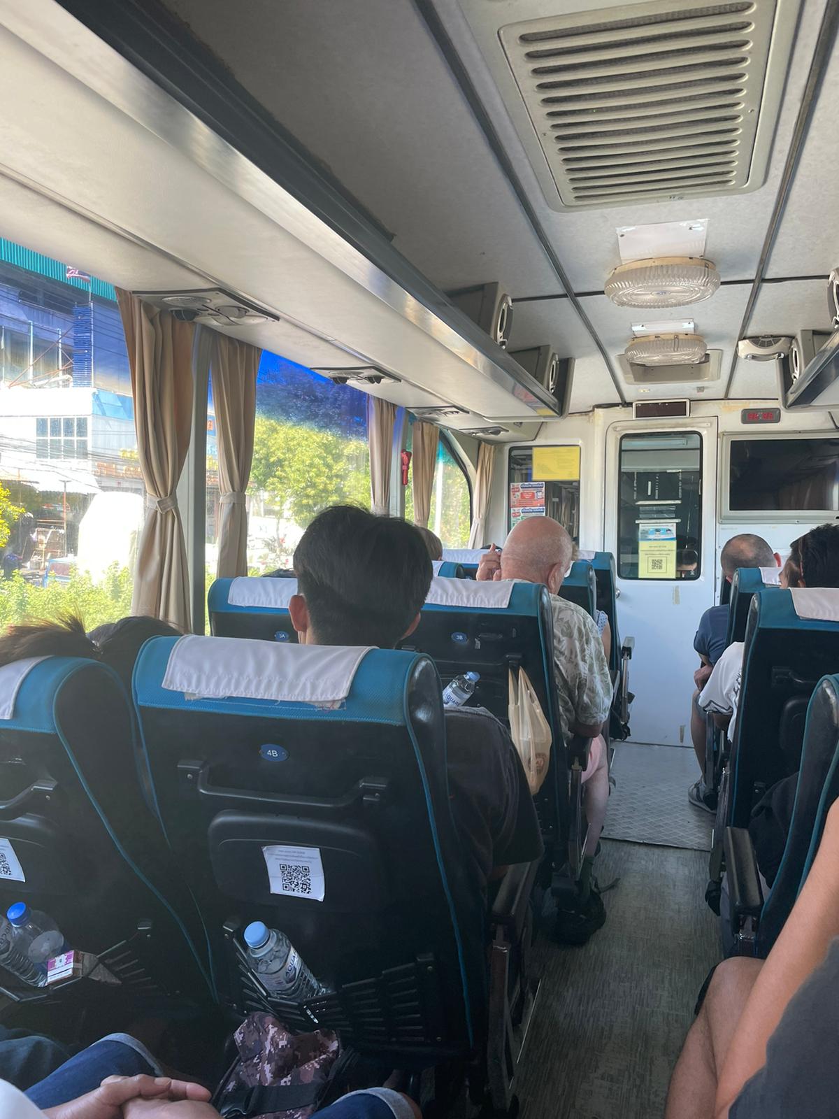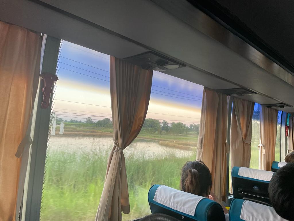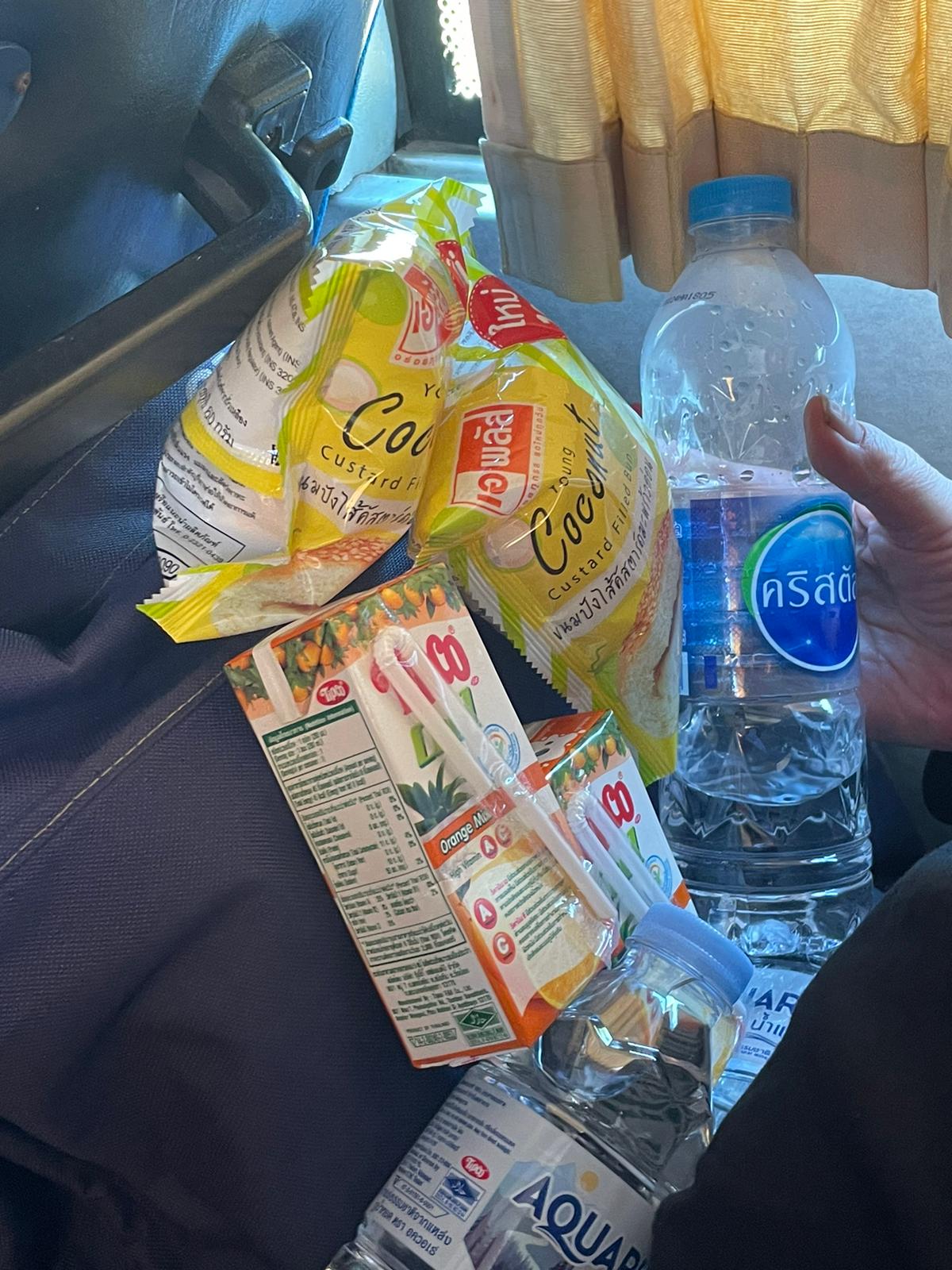 Vom Bus ist erstmal nichts zu sehen. Mit zwanzig Minuten Verspätung geht es schließlich los. Aber warum sollte man hier pünktlicher sein, als die Öffis bei uns daheim. Die Sitze im Bus sind sicherlich nicht die bequemsten, aber wir haben schon Schlimmeres erlebt. Dafür sind eine Flasche Wasser, ein kleiner Orangensaft und eine Semmel mit Kokoscremefüllung im Fahrpreis eingeschlossen