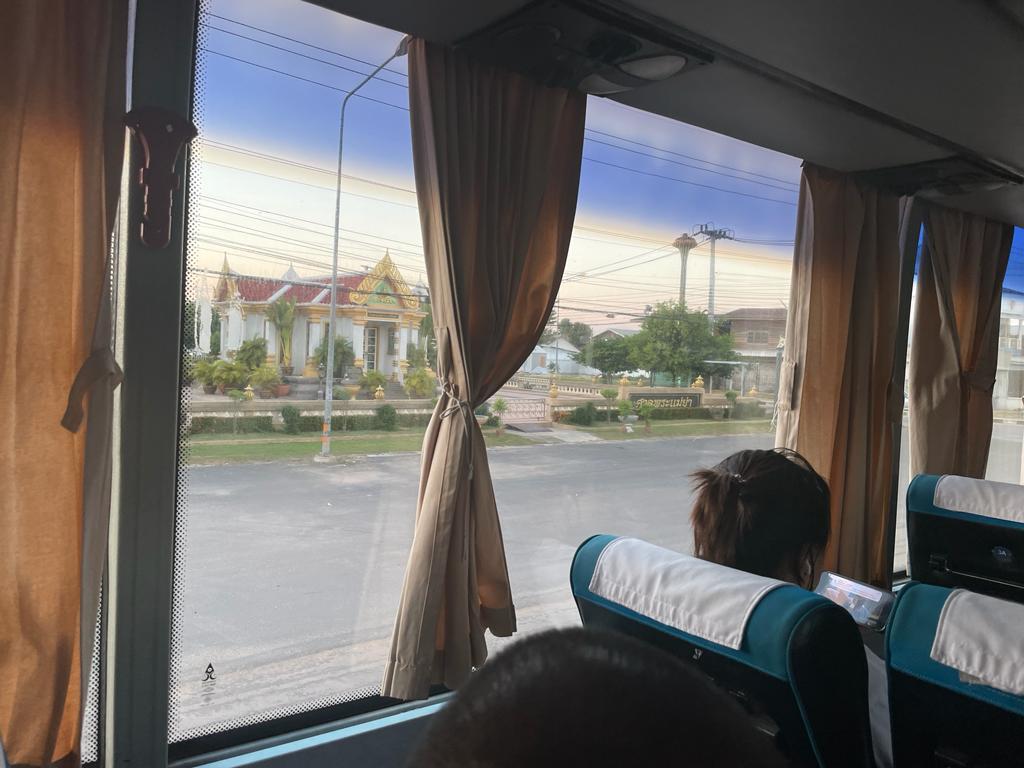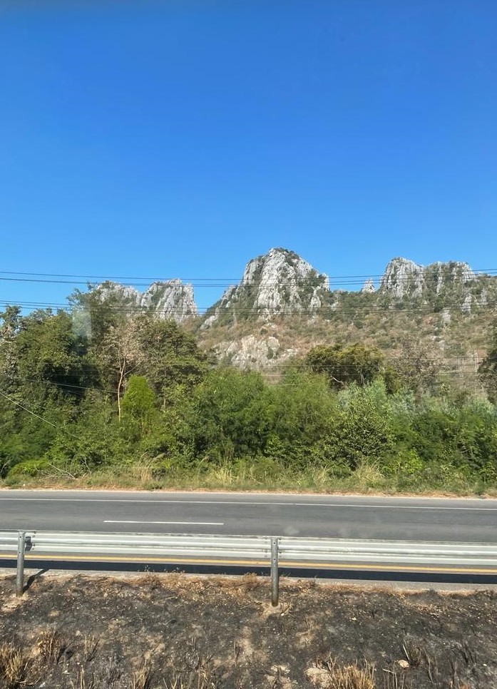 Es dauert nicht lange und wir dösen ein, die Bilder der Wats und Buddha-Statuen vom Vortag noch Augen. Viel zu sehen gibt es eh nicht. Erst in der zweiten Hälfte überraschen ein paar Felsen am Wegesrand und die vergoldete Stupa eines Wats auf einem nahegelegenen Hügel.