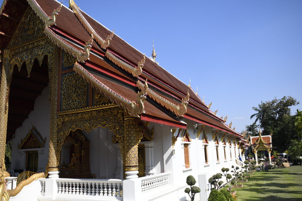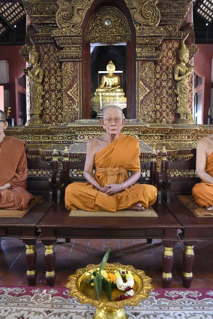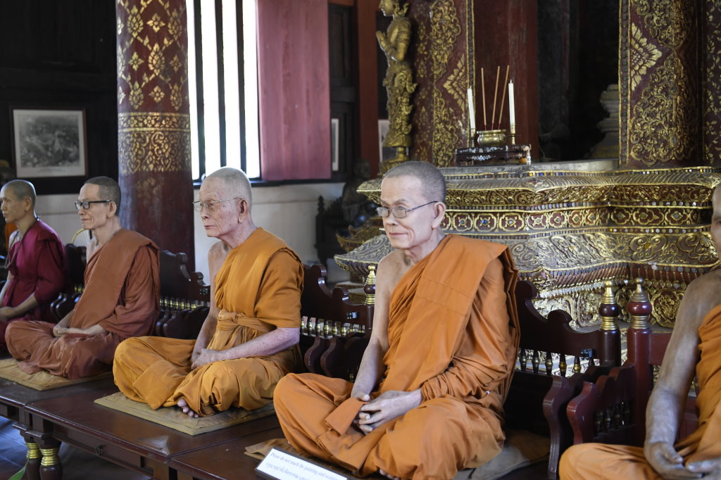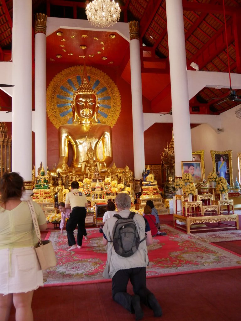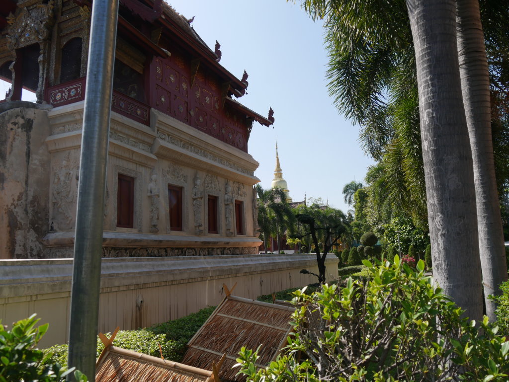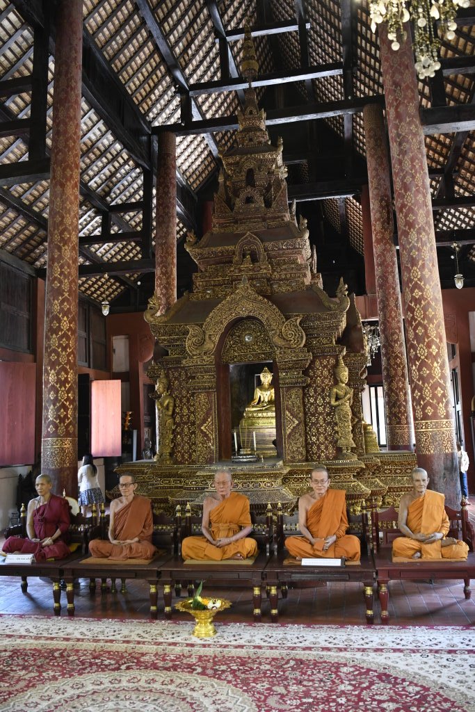 Unweit unseres Hotels befindet sich der Wat Pha Bong (Mangkhalaram), eine Ecke weiter wartet die weitläufigere Anlage des Wat Phra Singh. Beim Betreten des ersten Wihans zögern wir kurz. Vor und hinter dem Schrein mit den Buddhastatuen sitzen mehrere ältere Mönche in Meditation versunken. Wie verhält man sich da jetzt? Keine Wimper zuckt. Des Rätsels Lösung: aus der Nähe betrachtet entpuppen sich die frommen Männer als lebensechte Nachbildungen angesehener Mönche und Lehrer.