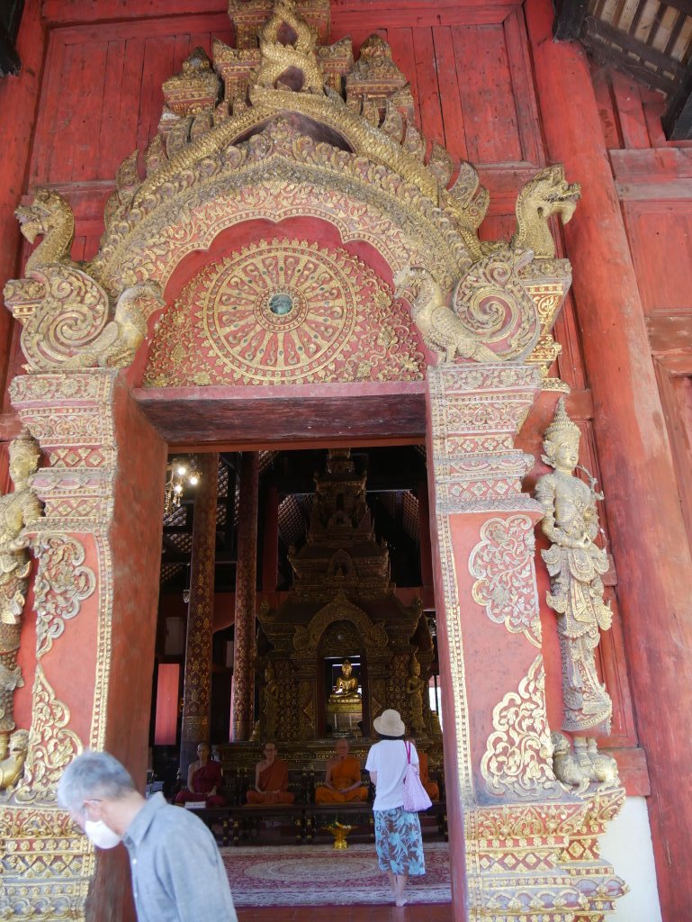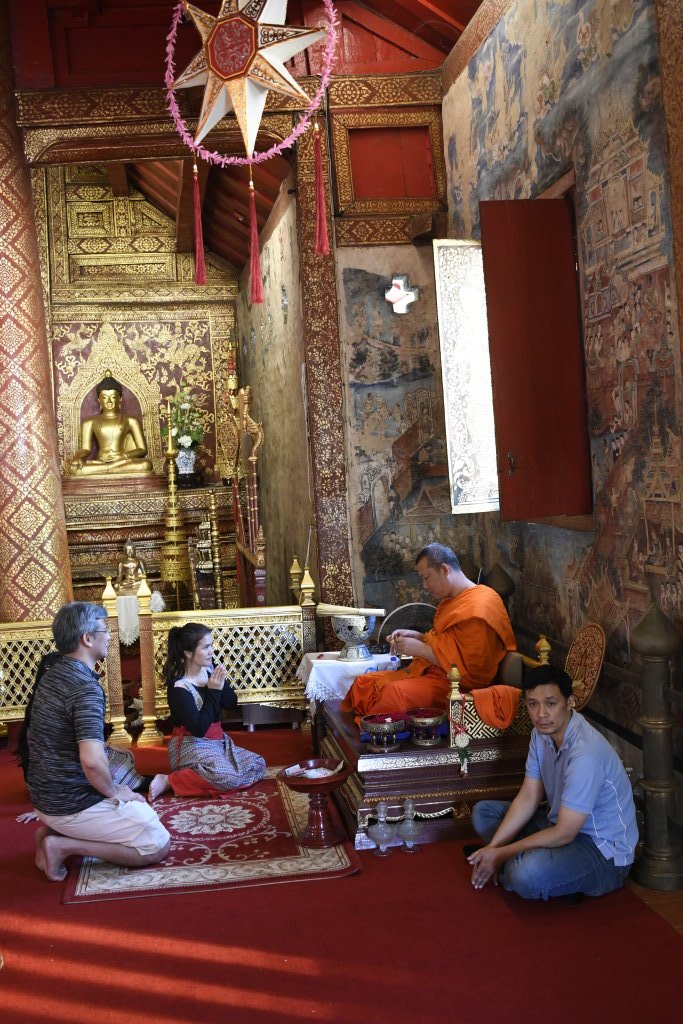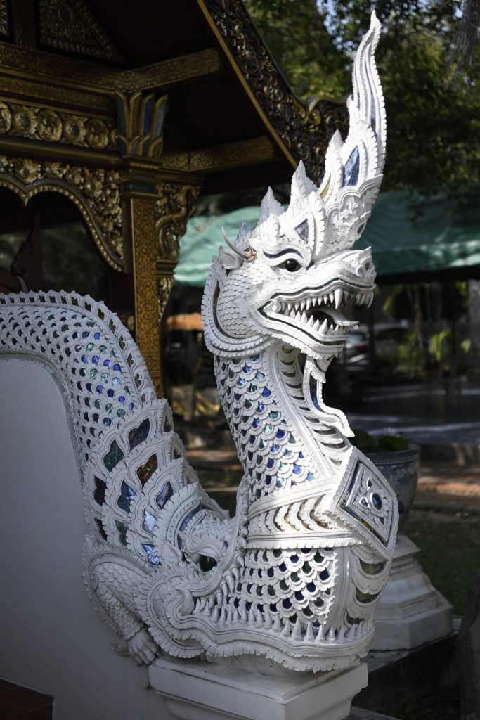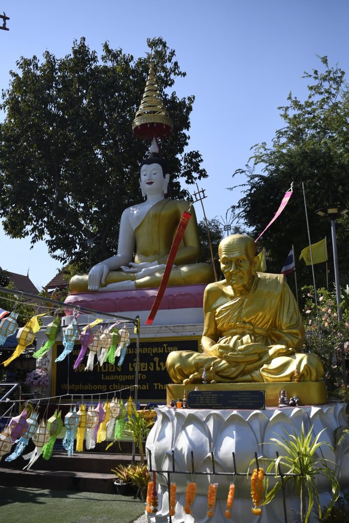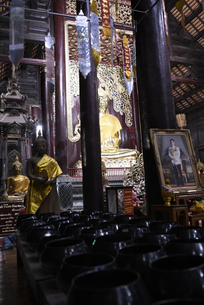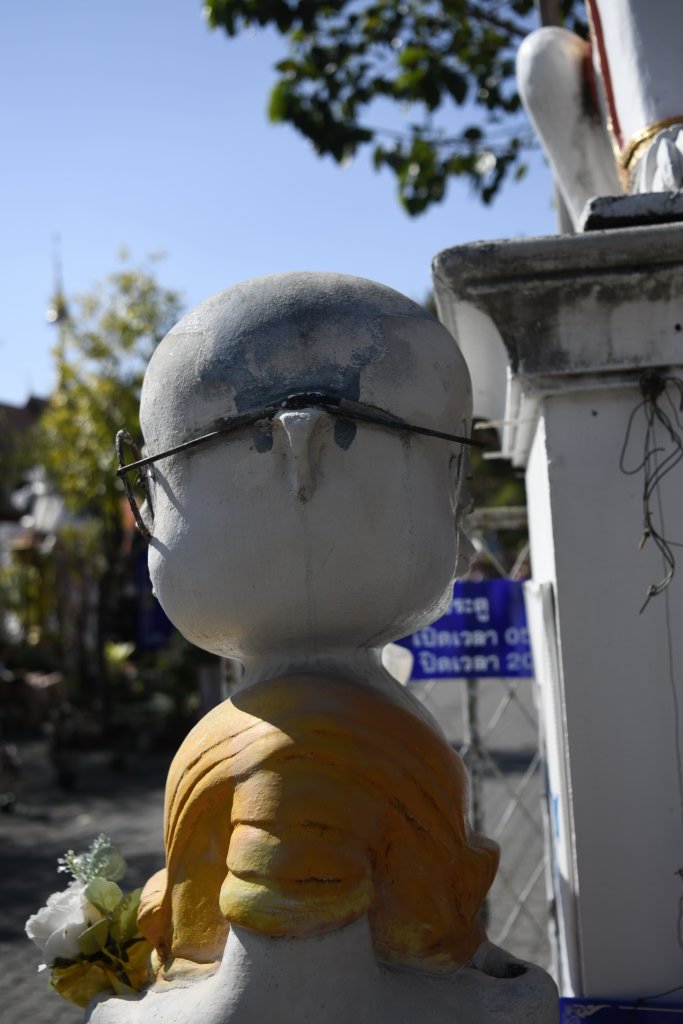 Unweit unseres Hotels befindet sich der Wat Pha Bong (Mangkhalaram), eine Ecke weiter wartet die weitläufigere Anlage des Wat Phra Singh. Beim Betreten des ersten Wihans zögern wir kurz. Vor und hinter dem Schrein mit den Buddhastatuen sitzen mehrere ältere Mönche in Meditation versunken. Wie verhält man sich da jetzt? Keine Wimper zuckt. Des Rätsels Lösung: aus der Nähe betrachtet entpuppen sich die frommen Männer als lebensechte Nachbildungen angesehener Mönche und Lehrer.