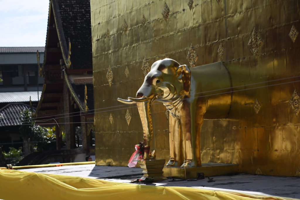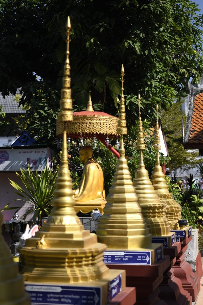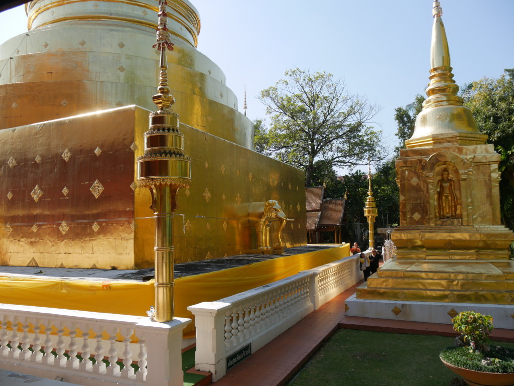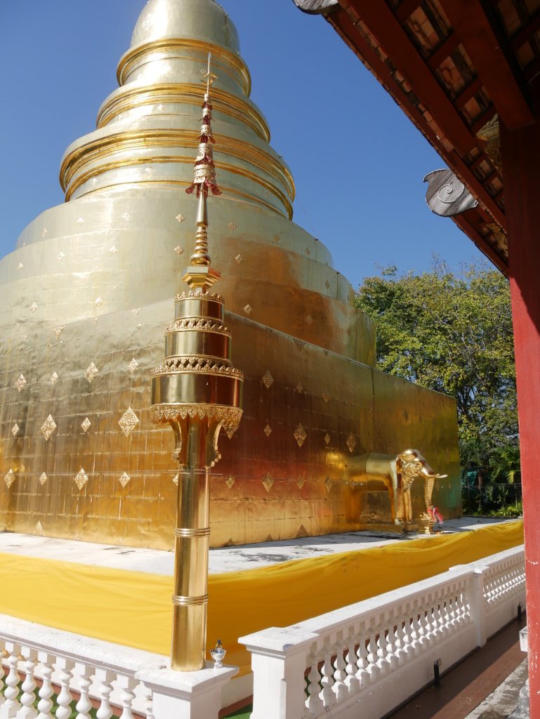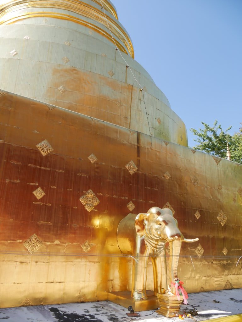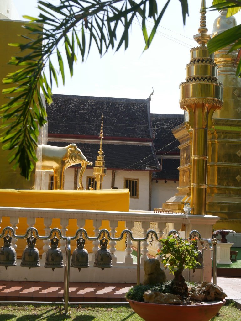 Perfekt ist auch die üppige Vergoldung des von Elefanten gestützten Chedi gleich dahinter, zu dessen Spitze ein Seil gespannt ist, mit dem von einer Winde ein kleines Schiffchen hinaufgezogen werden kann. Das haben wir schon einmal im burmesischen Yangon (Rangun) in der Sule-Pagode gesehen, wo die Gebete und Wünsche der gläubigen Pilger auf diese Weise in Richtung Himmel gelangen sollen. Hier wird am Nachmittag Wasser nach oben befördert, um den Chedi zu benetzen. Ganz so, wie es die Gläubigen ebenerdig mit kleinen Schälchen tun, um die dort aufgestellten Buddha-Figuren mit Wasser zu begießen und „zu baden“.