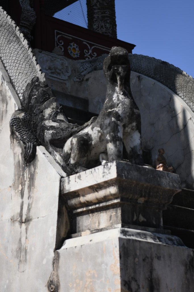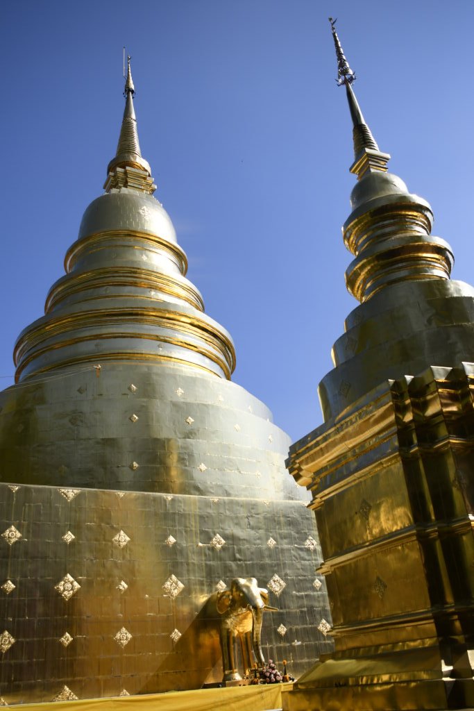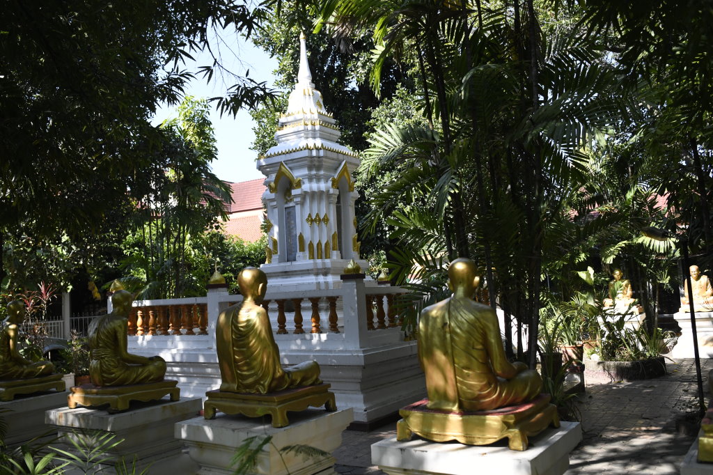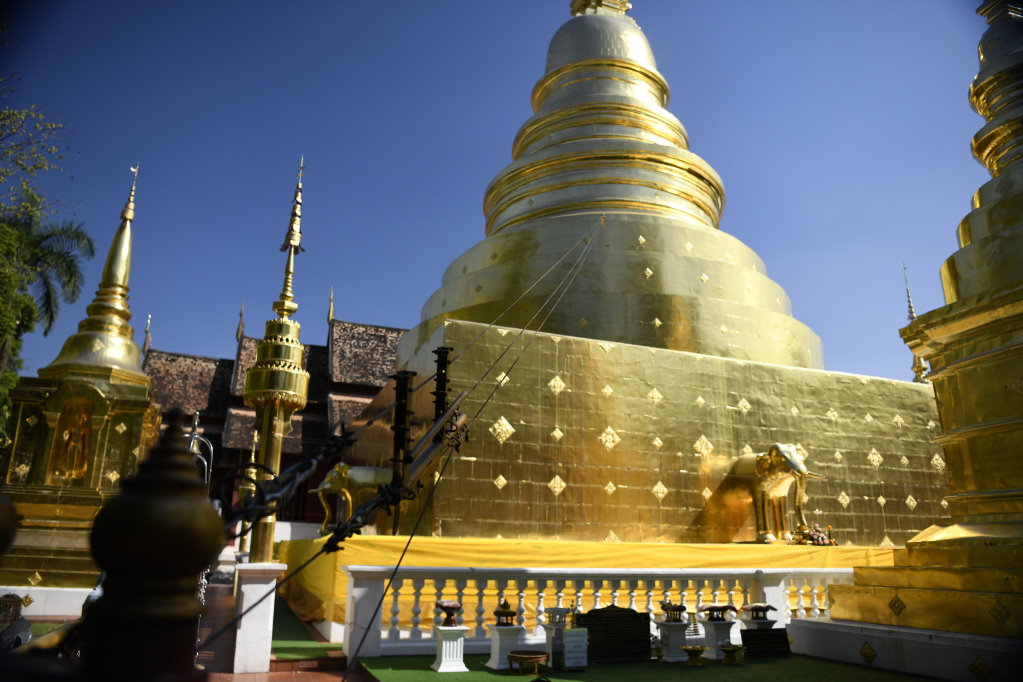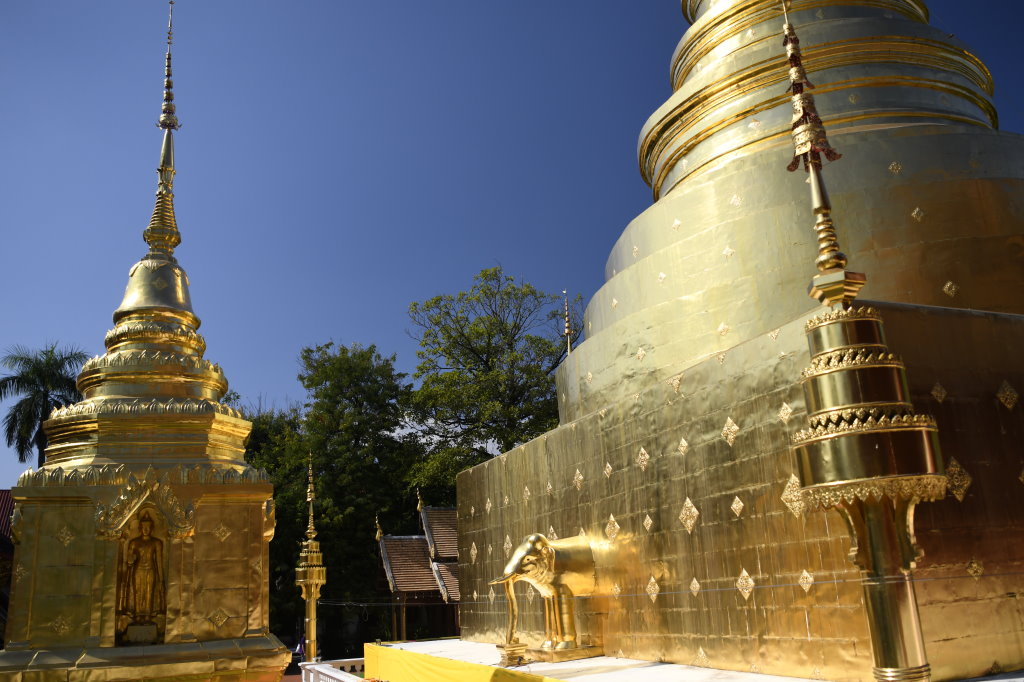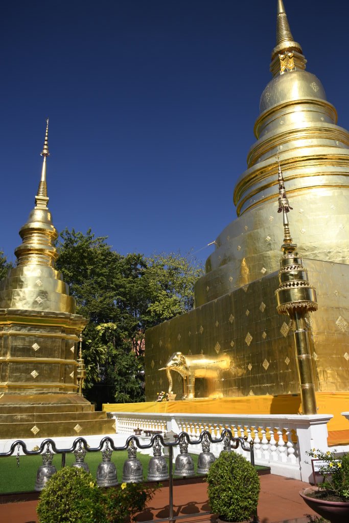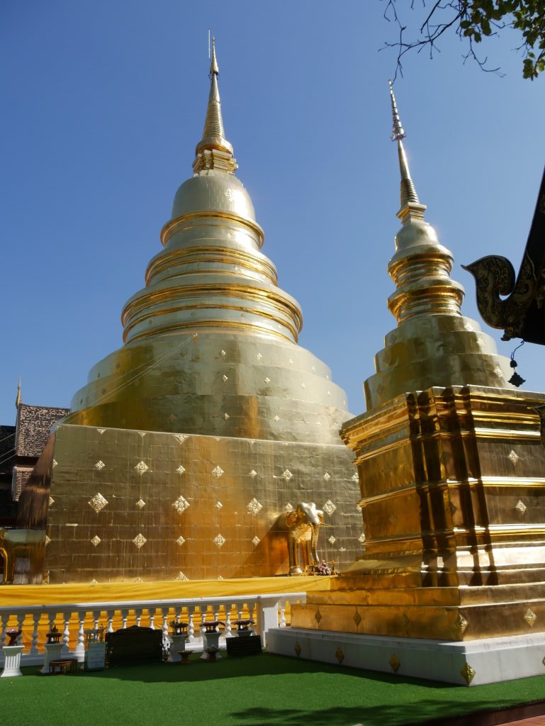 Perfekt ist auch die üppige Vergoldung des von Elefanten gestützten Chedi gleich dahinter, zu dessen Spitze ein Seil gespannt ist, mit dem von einer Winde ein kleines Schiffchen hinaufgezogen werden kann. Das haben wir schon einmal im burmesischen Yangon (Rangun) in der Sule-Pagode gesehen, wo die Gebete und Wünsche der gläubigen Pilger auf diese Weise in Richtung Himmel gelangen sollen. Hier wird am Nachmittag Wasser nach oben befördert, um den Chedi zu benetzen. Ganz so, wie es die Gläubigen ebenerdig mit kleinen Schälchen tun, um die dort aufgestellten Buddha-Figuren mit Wasser zu begießen und „zu baden“.
