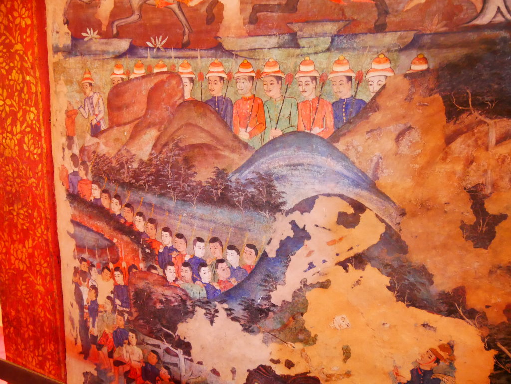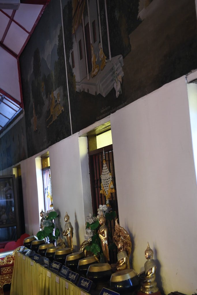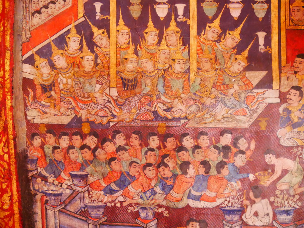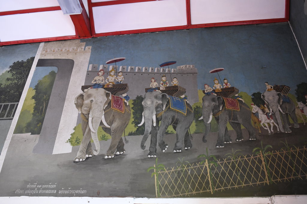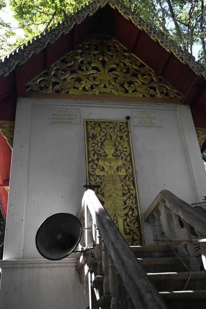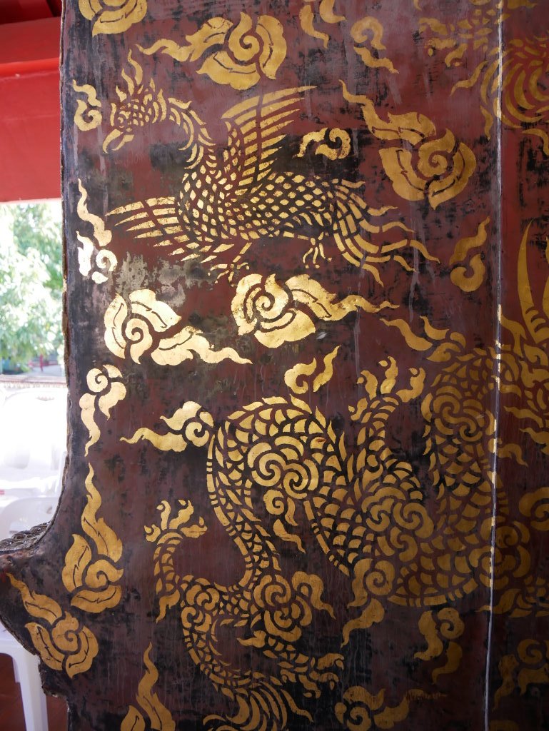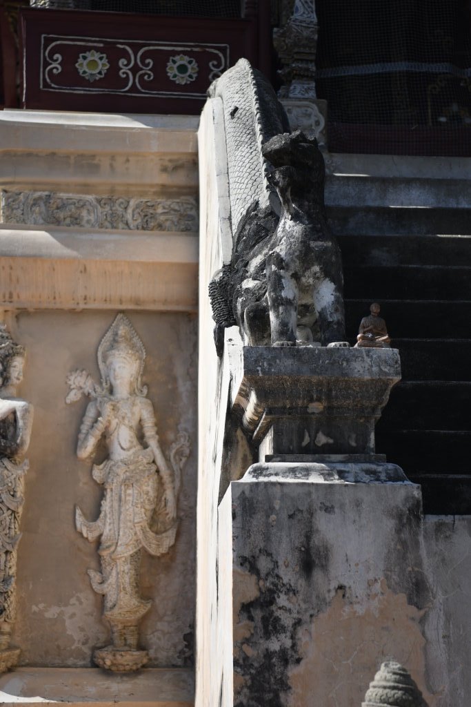 Perfekt ist auch die üppige Vergoldung des von Elefanten gestützten Chedi gleich dahinter, zu dessen Spitze ein Seil gespannt ist, mit dem von einer Winde ein kleines Schiffchen hinaufgezogen werden kann. Das haben wir schon einmal im burmesischen Yangon (Rangun) in der Sule-Pagode gesehen, wo die Gebete und Wünsche der gläubigen Pilger auf diese Weise in Richtung Himmel gelangen sollen. Hier wird am Nachmittag Wasser nach oben befördert, um den Chedi zu benetzen. Ganz so, wie es die Gläubigen ebenerdig mit kleinen Schälchen tun, um die dort aufgestellten Buddha-Figuren mit Wasser zu begießen und „zu baden“.