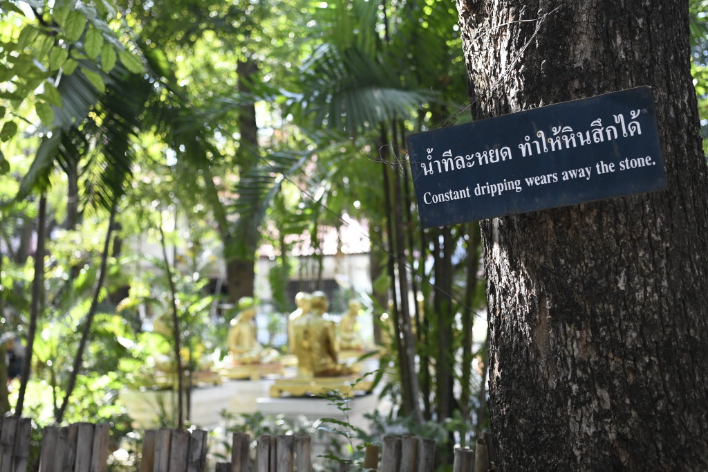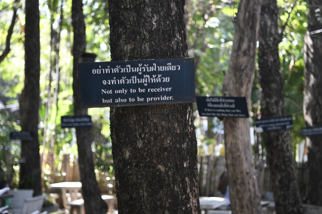 Ein paar Meter weiter lädt ein kleiner Hain zum Verweilen ein. An 14 Baumstämmchen hängen Sinnsprüche, über die meditiert werden kann: „Steter Tropfen schleift den Stein“, „Besser ist es, unangenehme Wahrheiten auszusprechen, als Lügen zu erzählen“, „Wenn es nichts gibt, was dir gefällt, musst du die Dinge mögen, die du hast“, etc.