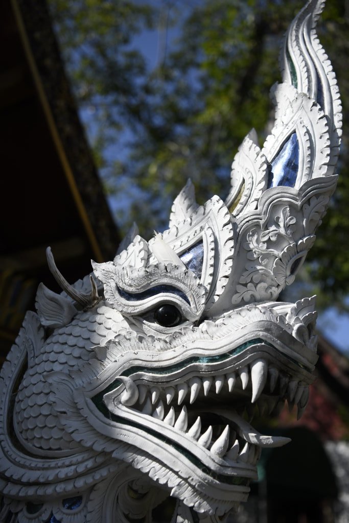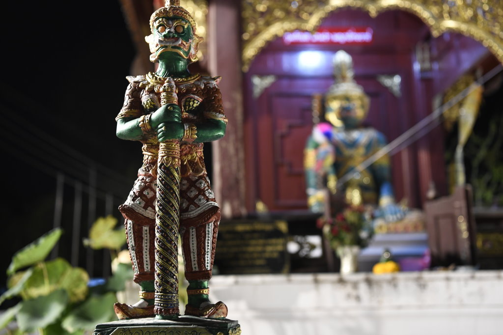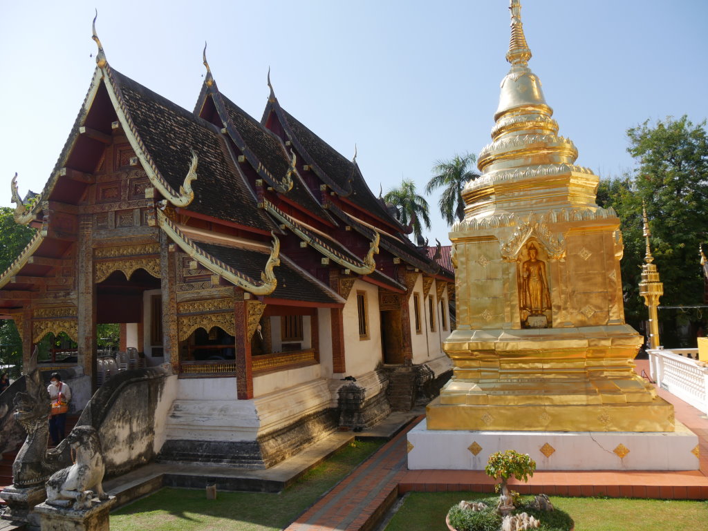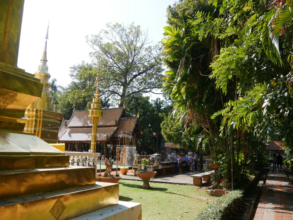 Heute bleiben wir klimaneutral und bewegen uns zu Fuß durch Chiang Mai. Hier ist es mit rund 26 Grad am späten Vormittag deutlich kühler als bei den über 40 Grad zu Reisebeginn in Bangkok. Wir nehmen jede Gelegenheit wahr, immer wieder in einen der Tempel zu gehen, die sich uns beim Sightseeing in der Altstadt in den Weg stellen. Richtig schattig wird es erst am Abend, wenn nach Einbruch der Dunkelheit die Temperaturen auf 14 Grad fallen.