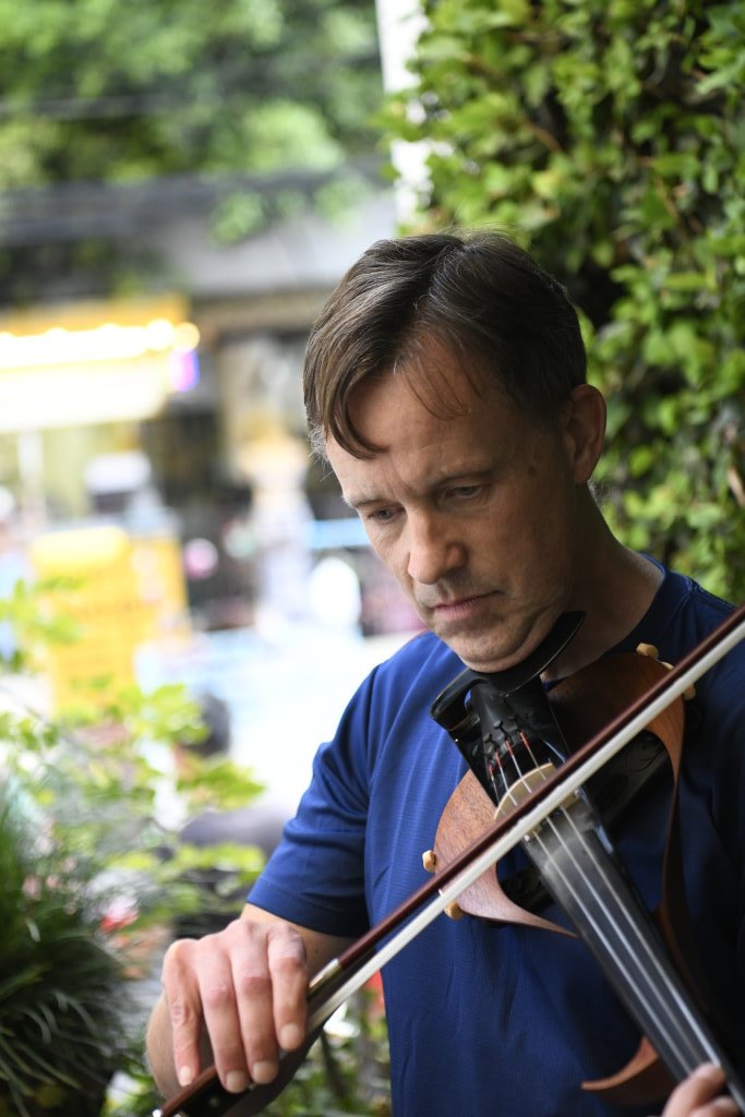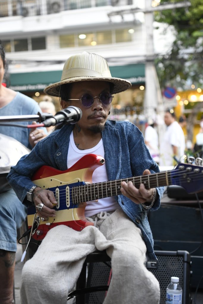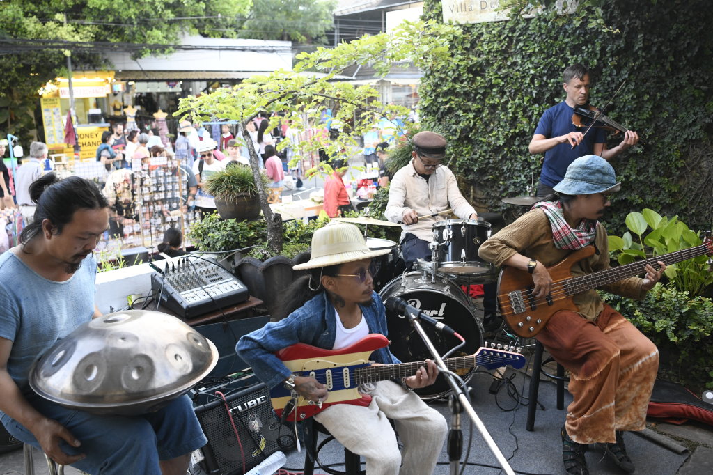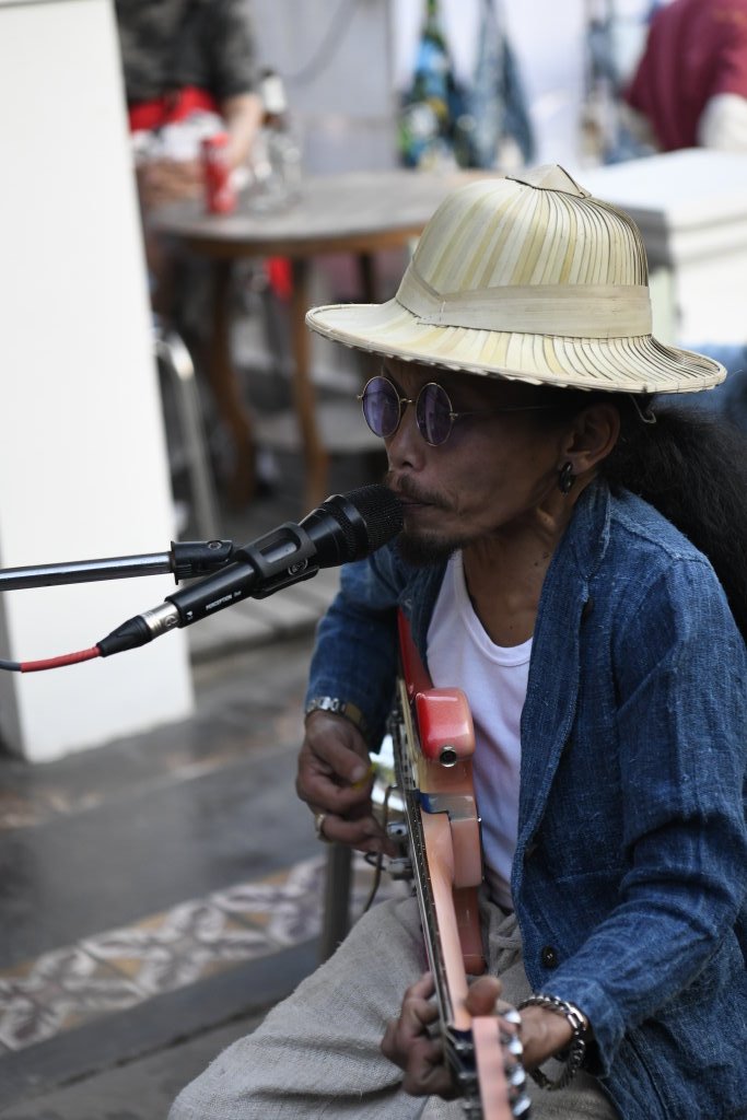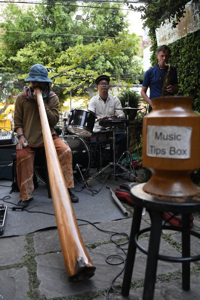 Am Nachmittag genießen wir an der Bar des Villa Duang Champa Hotels etwas Live-Musik. Die fünf Musiker von „Helicopter Secondhand“ spielen „Weltmusik“ (World music). Neben Gitarre, Bass und Schlagzeug sind auch eine Handpan, Saxophon, Didgeridoo und eine Elektro-Geige im Einsatz.