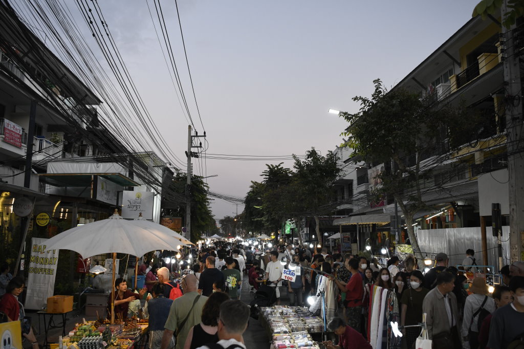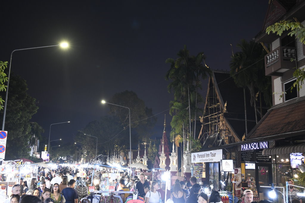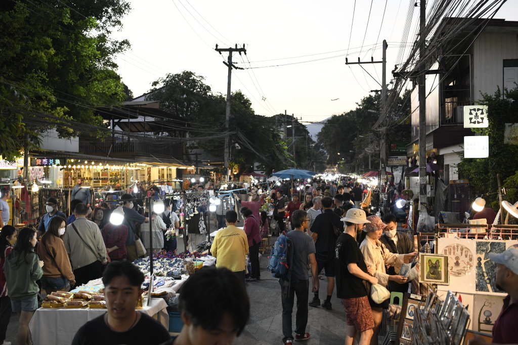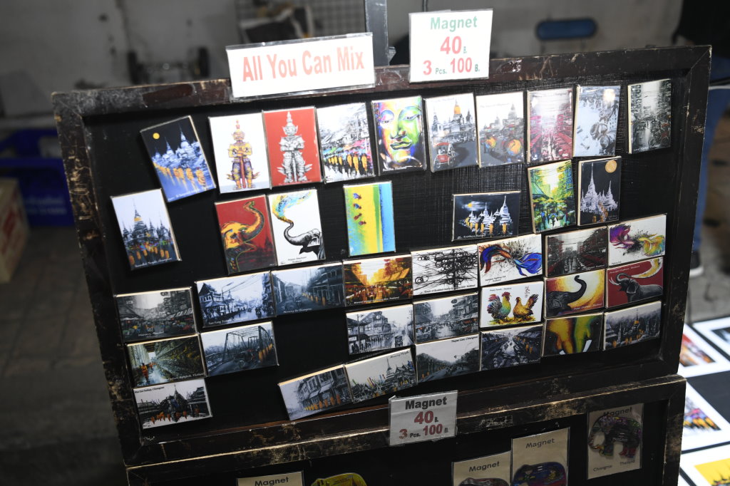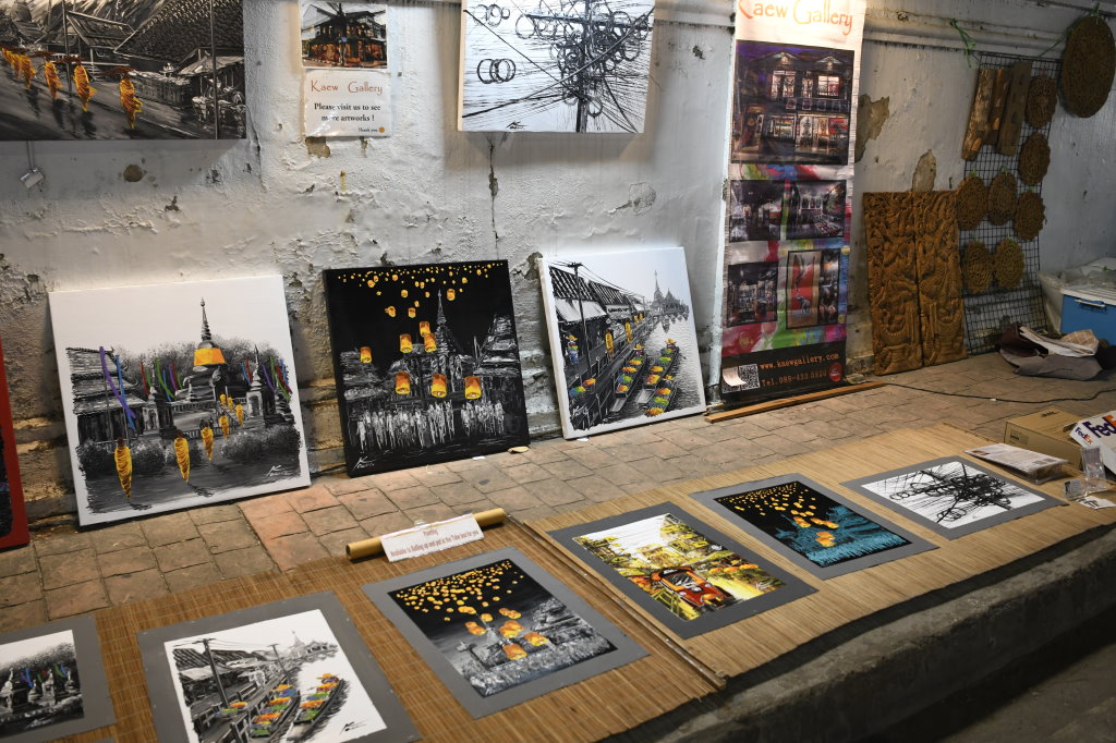 Es dämmert bereits, als wir in den Trubel des „Tha Phae Walking Street Market“ eintauchen, den sonntäglichen Straßenmarkt, auf dem von Nachmittag bis Mitternacht lokale Kunst und Kunsthandwerk angeboten werden. Die Gelegenheit ist günstig, einem Freund einen Wunsch zu erfüllen und ein paar weitere ungewöhnlichere Kühlschrank-Magnete zu kaufen, die von einer Kunstgalerie an ihrem Straßenstand angeboten werden.