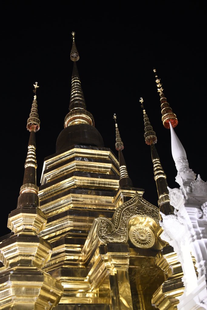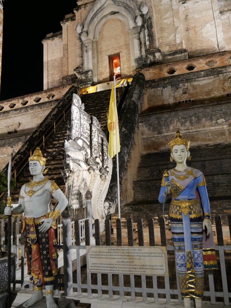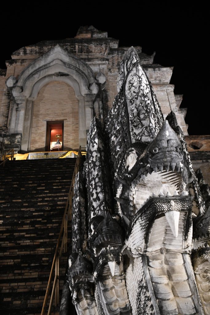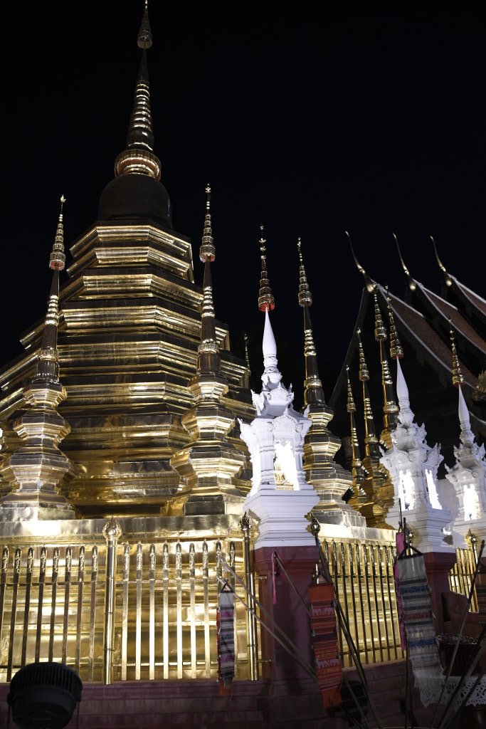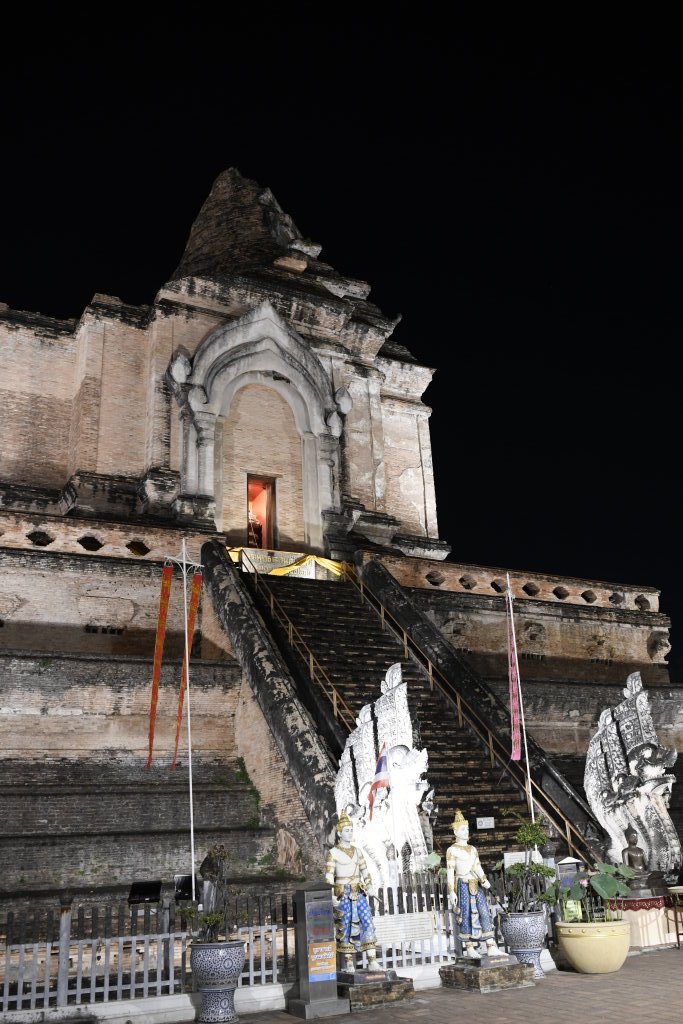 Wir besuchen noch zwei weitere Tempel, die am Wegesrand liegen: Der beleuchtete goldene Chedi hinter dem Teakholztempel des Wat Phantao hat uns auf das Gelände der Anlage aus dem 14. Jahrhundert gelockt. Auch dem benachbarten Wat Chedi Luang statten wir einen Besuch ab und freuen uns über die neuen An- und Einsichten, die durch die nächtliche Beleuchtung möglich wird.
