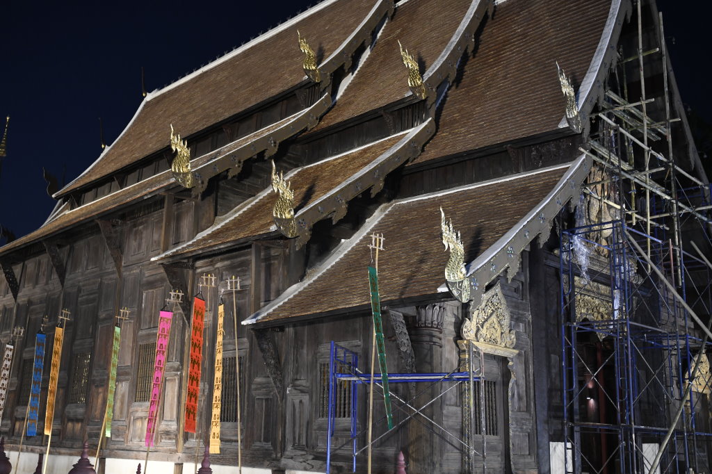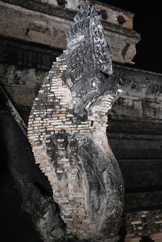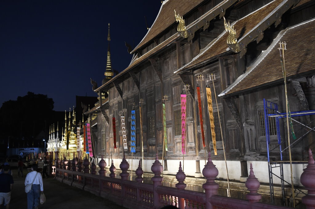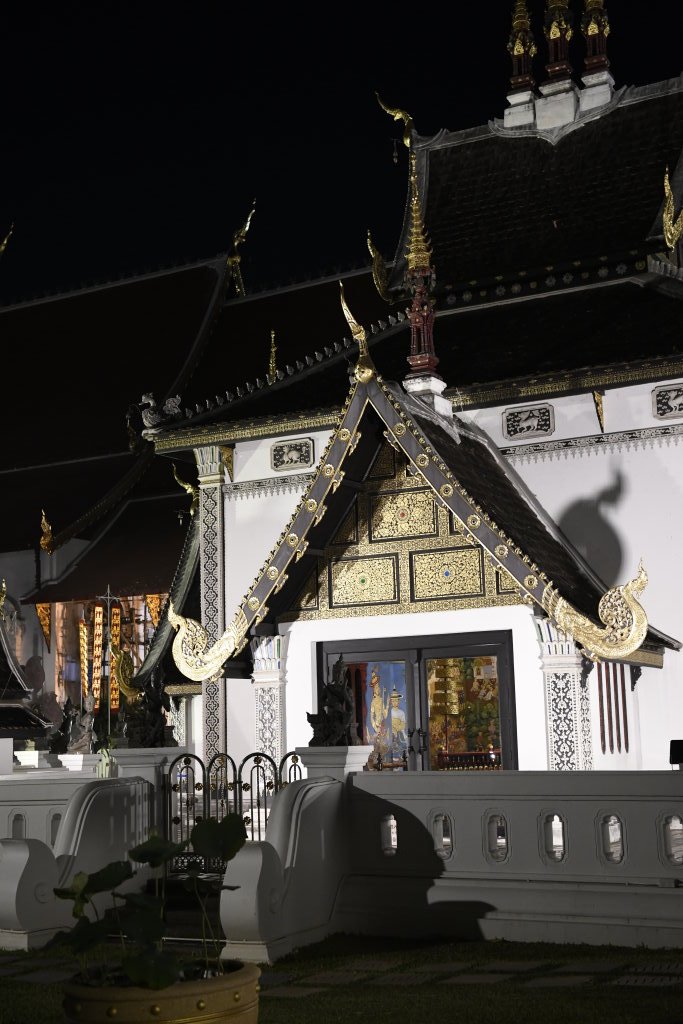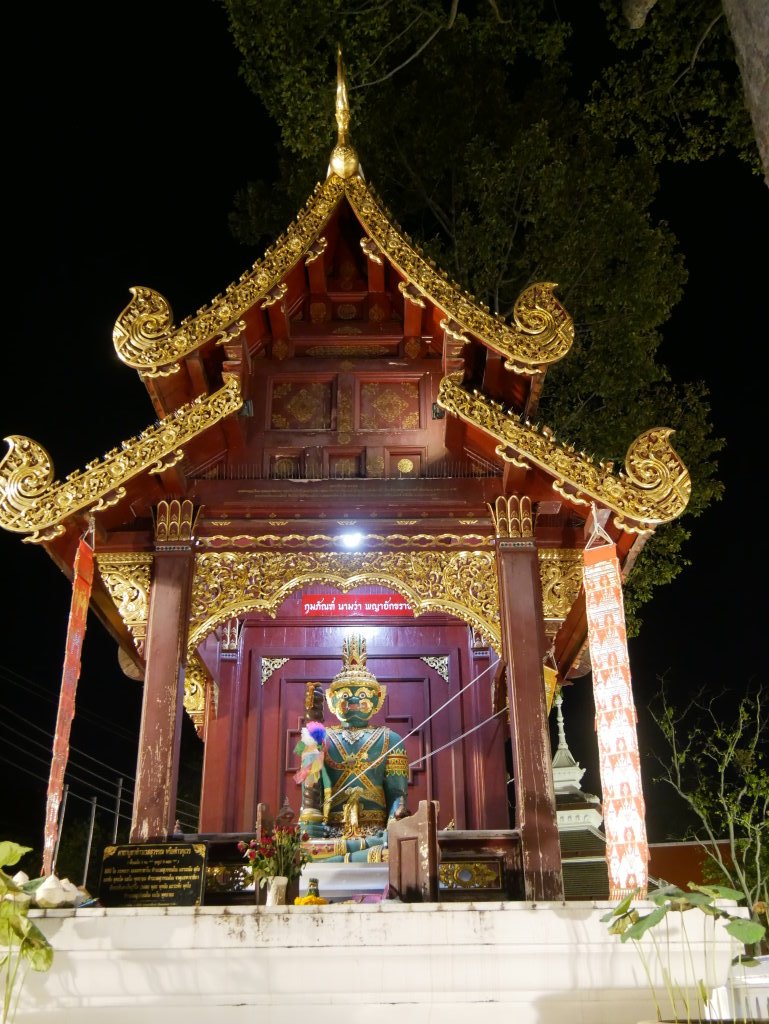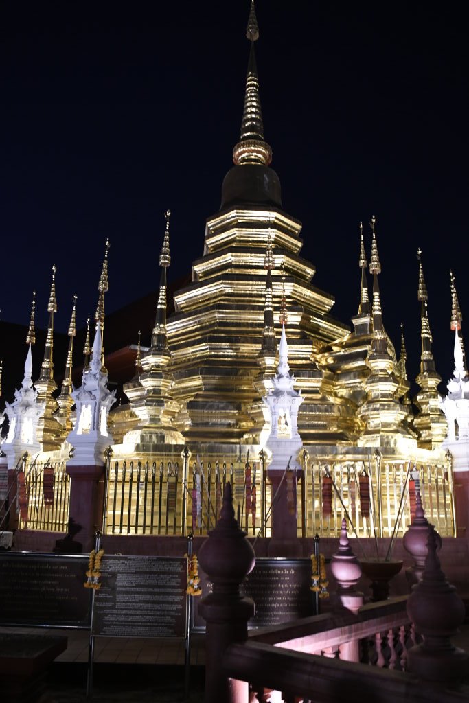 Wir besuchen noch zwei weitere Tempel, die am Wegesrand liegen: Der beleuchtete goldene Chedi hinter dem Teakholztempel des Wat Phantao hat uns auf das Gelände der Anlage aus dem 14. Jahrhundert gelockt. Auch dem benachbarten Wat Chedi Luang statten wir einen Besuch ab und freuen uns über die neuen An- und Einsichten, die durch die nächtliche Beleuchtung möglich wird.