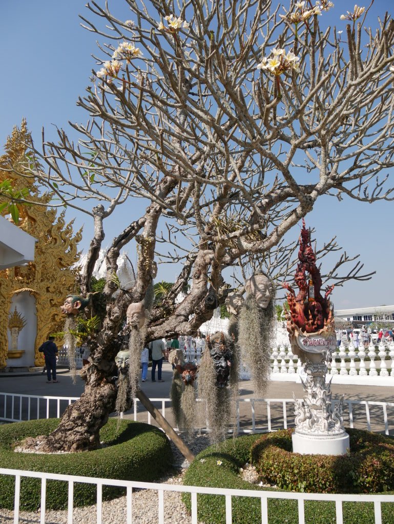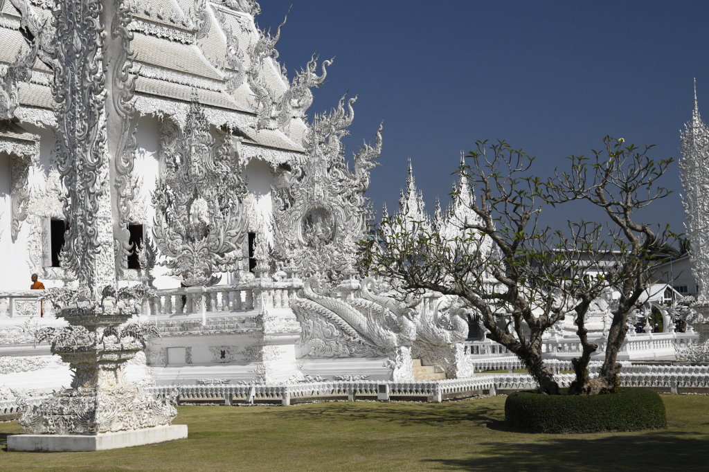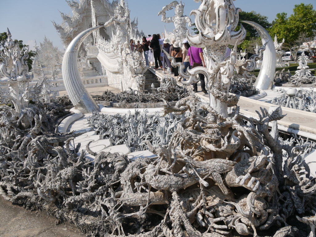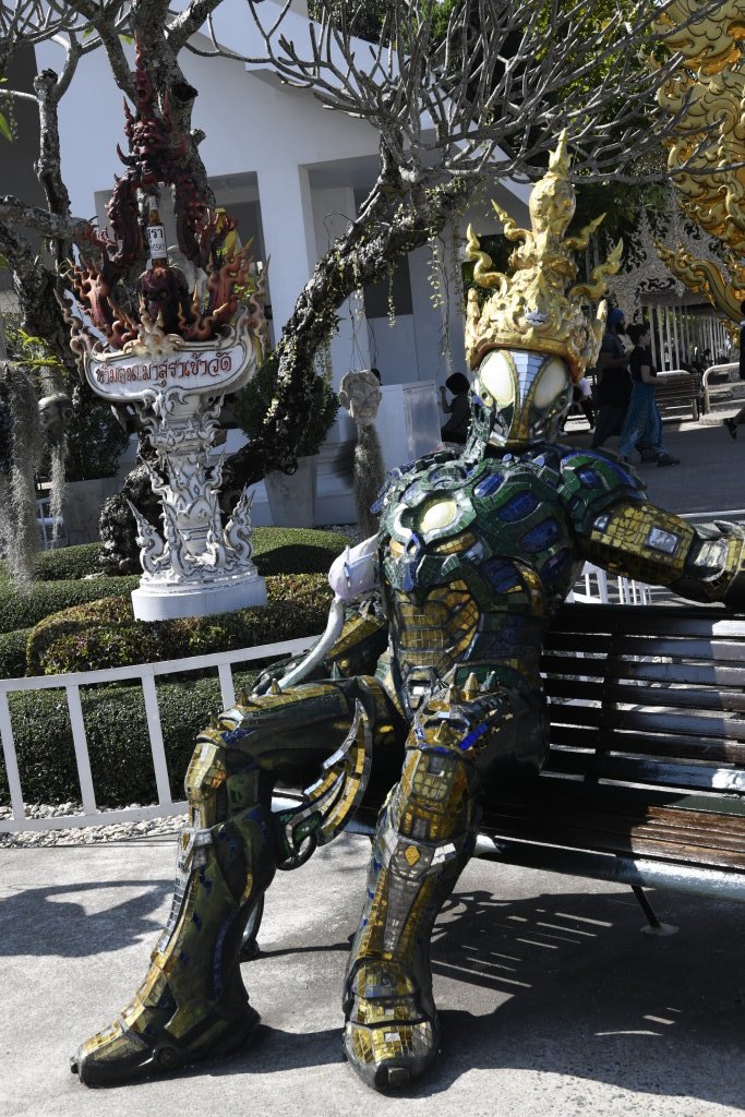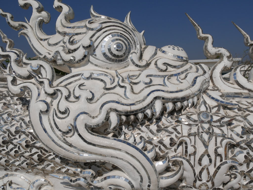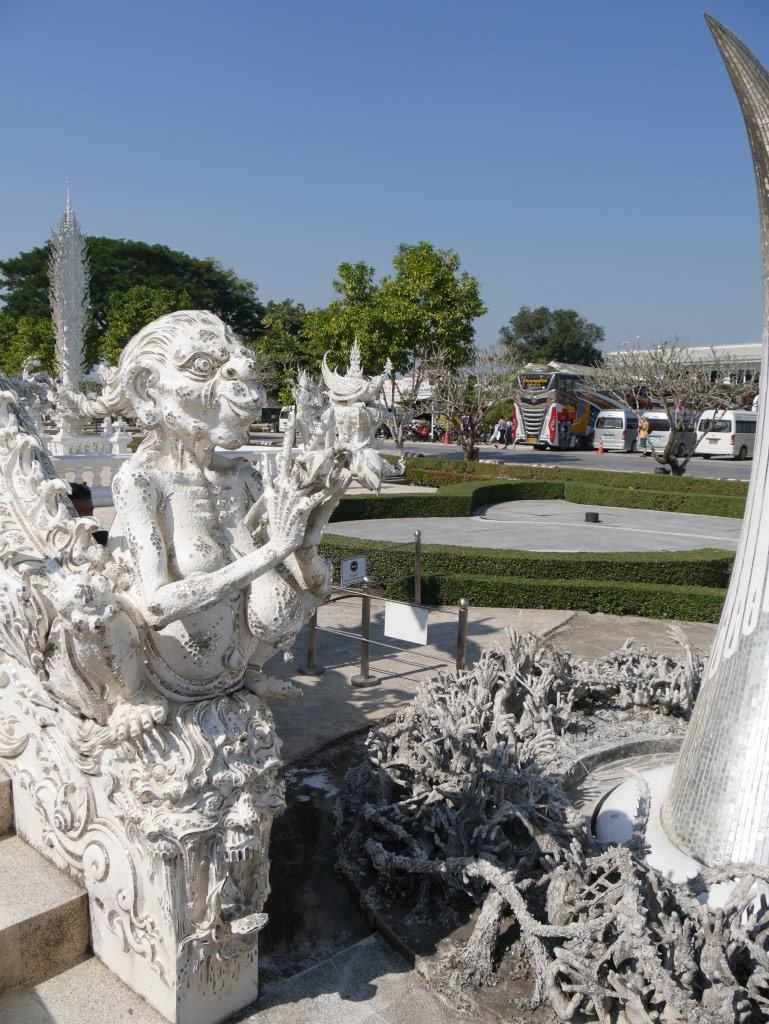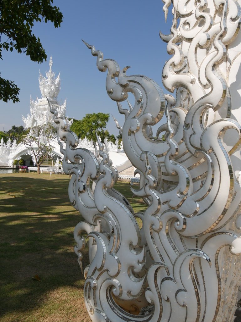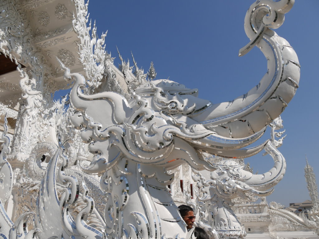 Wir waren am Vormittag von Chiang Mai in Richtung laotischer Grenze gestartet und hatten unterwegs noch einen Zwischenstopp am Wat Rong Khun in der Nähe von Chiang Rai eingelegt. Der strahlendweiße Gebäudekomplex ist allerdings keine buddhistische Tempelanlage im üblichen Sinn, sondern ein von dieser inspiriertes Gesamtkunstwerk, das von dem thailändischen Künstler Chalermchai Kositpipat auf den Ruinen des gleichnamigen Tempels konzipiert wurde. Es ist deshalb auch kein Widerspruch, wenn neben dem Eingang ein Tempelwächter eher einem Außerirdischen gleicht und auf einer Parkbank selfie-verliebte Besucher anlockt. Aus dem wirren Wurzelwerk vor einer Brücke vor dem Wihan strecken sich flehende Hände dem Besucher entgegen wie in einer Szene aus Pans Labyrinth von Guillermo del Toro.