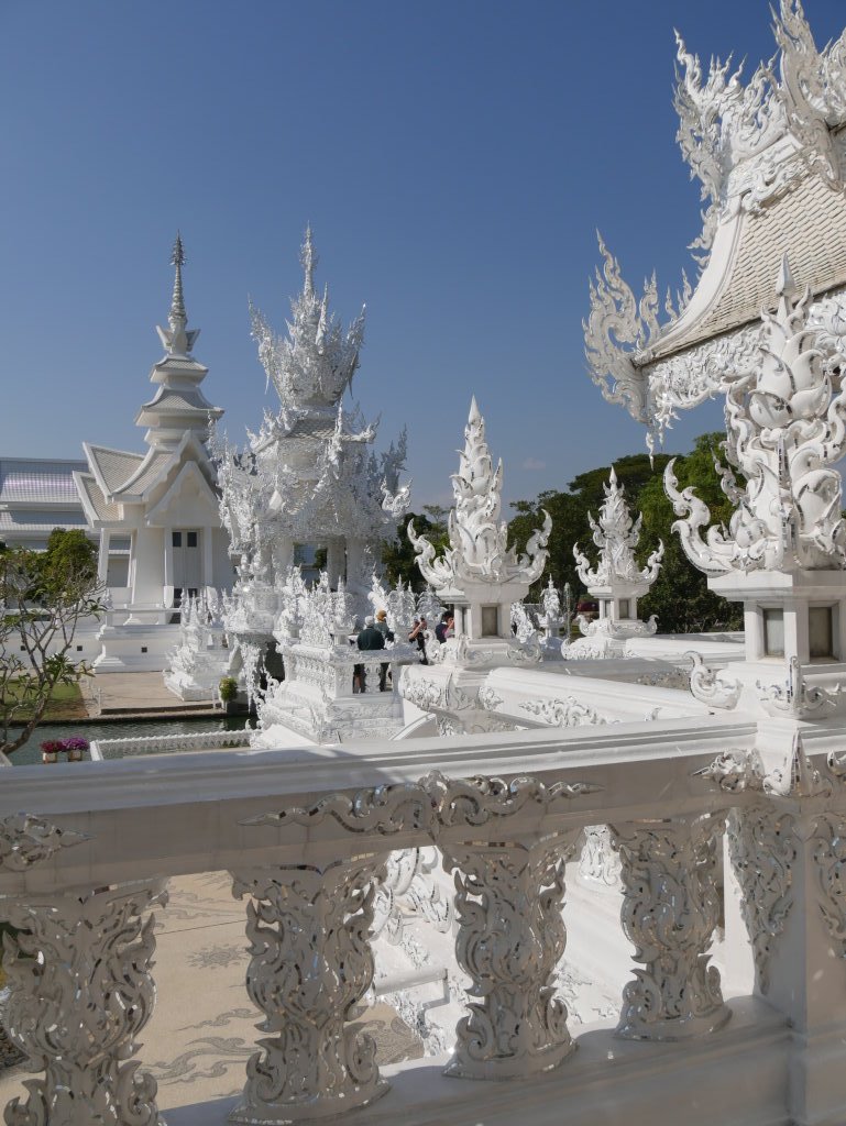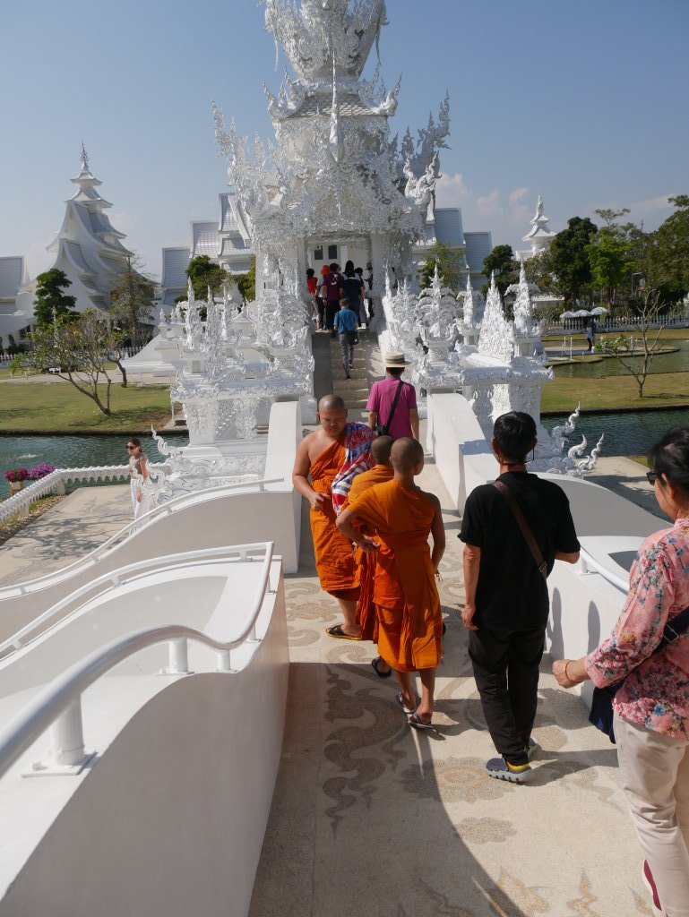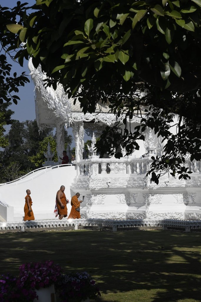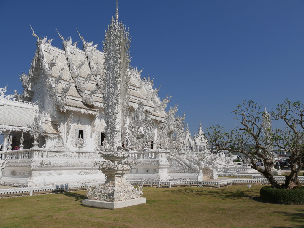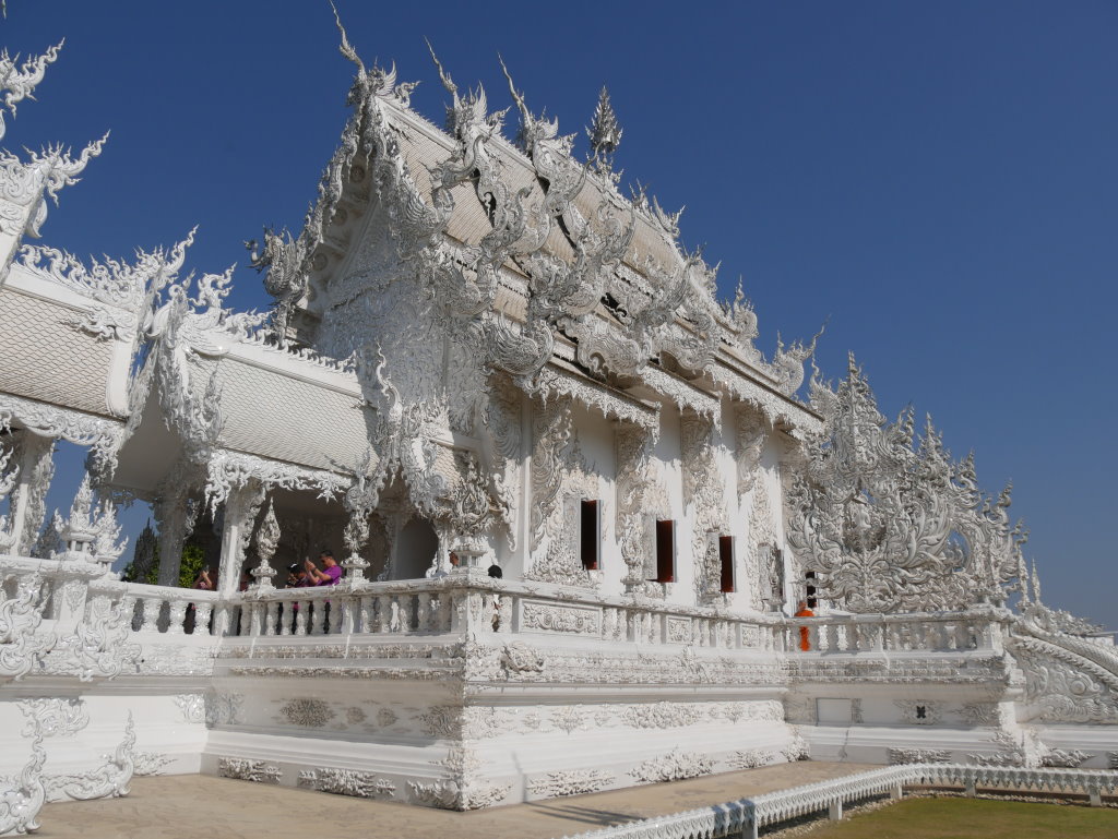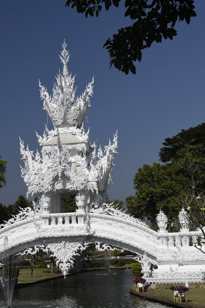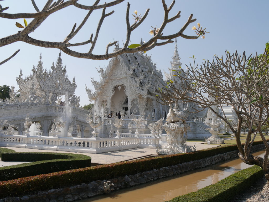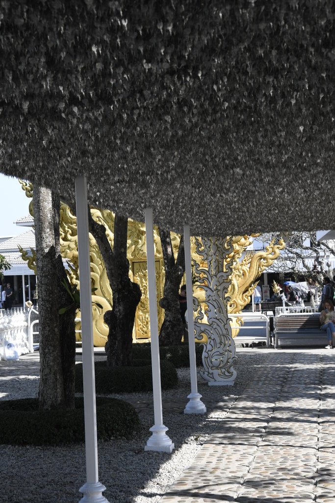 Wir waren am Vormittag von Chiang Mai in Richtung laotischer Grenze gestartet und hatten unterwegs noch einen Zwischenstopp am Wat Rong Khun in der Nähe von Chiang Rai eingelegt. Der strahlendweiße Gebäudekomplex ist allerdings keine buddhistische Tempelanlage im üblichen Sinn, sondern ein von dieser inspiriertes Gesamtkunstwerk, das von dem thailändischen Künstler Chalermchai Kositpipat auf den Ruinen des gleichnamigen Tempels konzipiert wurde. Es ist deshalb auch kein Widerspruch, wenn neben dem Eingang ein Tempelwächter eher einem Außerirdischen gleicht und auf einer Parkbank selfie-verliebte Besucher anlockt. Aus dem wirren Wurzelwerk vor einer Brücke vor dem Wihan strecken sich flehende Hände dem Besucher entgegen wie in einer Szene aus Pans Labyrinth von Guillermo del Toro.