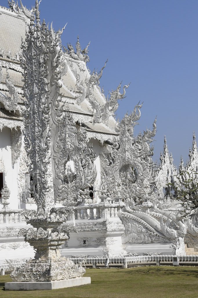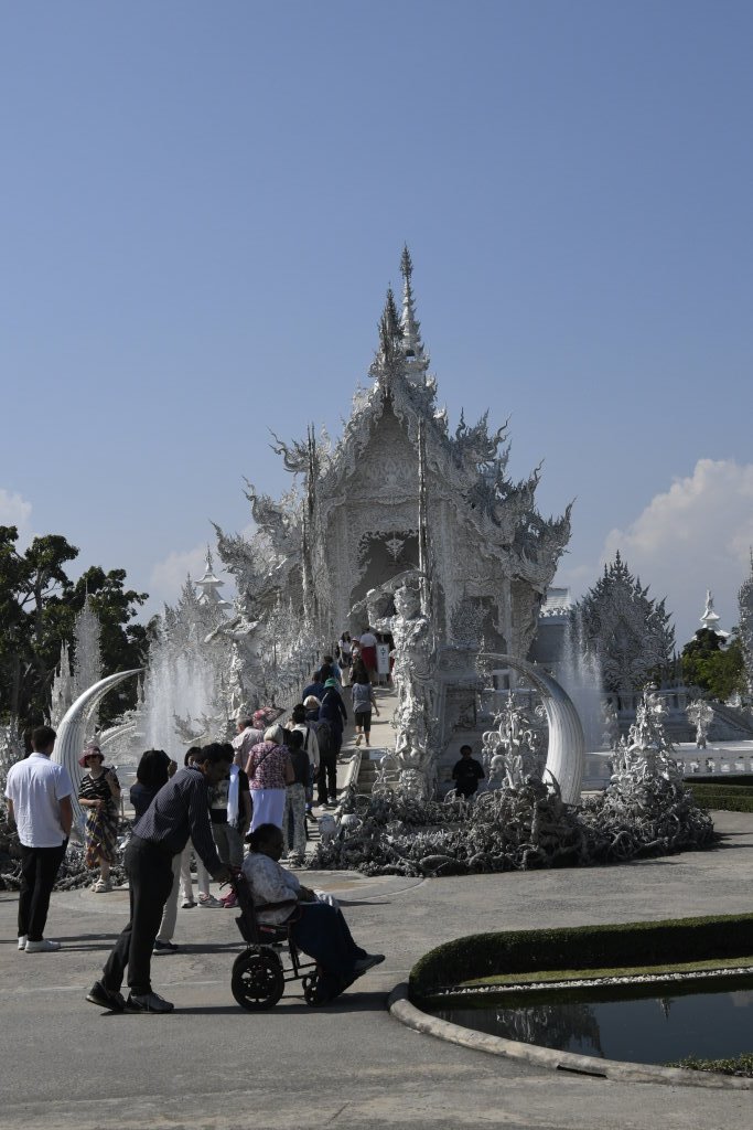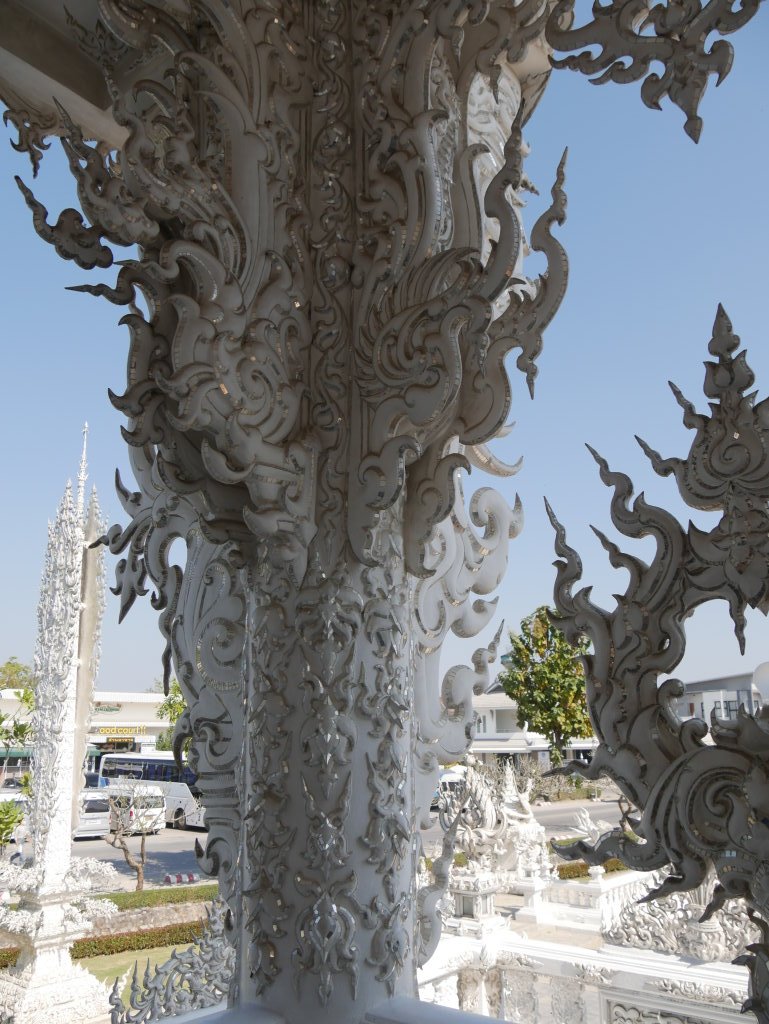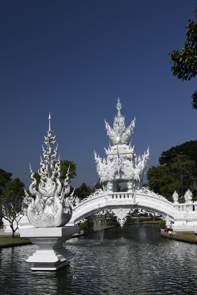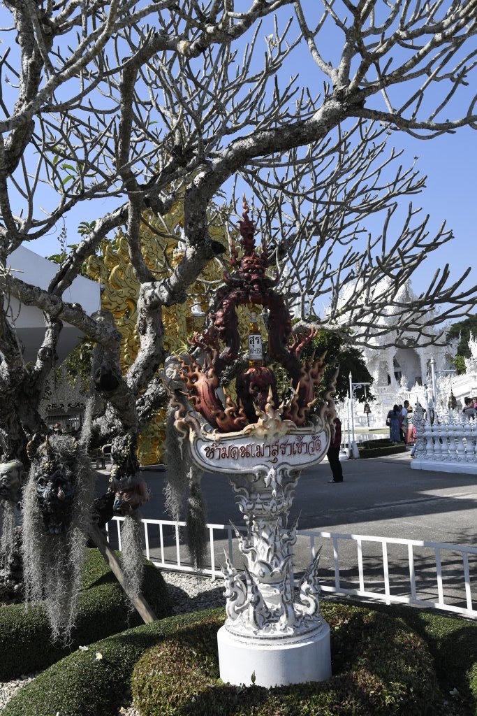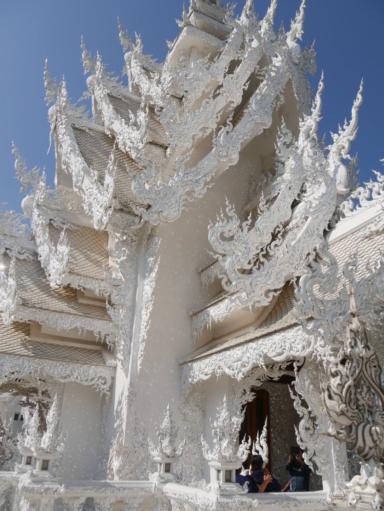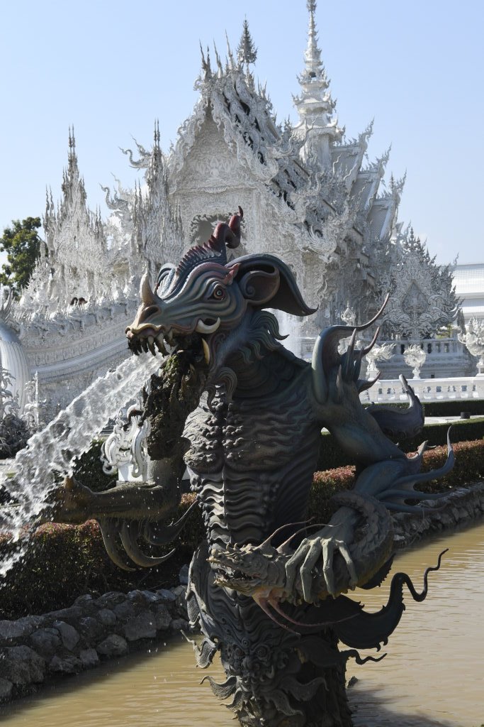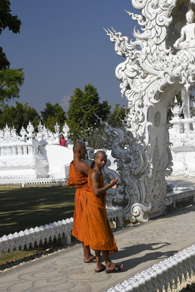 Wir waren am Vormittag von Chiang Mai in Richtung laotischer Grenze gestartet und hatten unterwegs noch einen Zwischenstopp am Wat Rong Khun in der Nähe von Chiang Rai eingelegt. Der strahlendweiße Gebäudekomplex ist allerdings keine buddhistische Tempelanlage im üblichen Sinn, sondern ein von dieser inspiriertes Gesamtkunstwerk, das von dem thailändischen Künstler Chalermchai Kositpipat auf den Ruinen des gleichnamigen Tempels konzipiert wurde. Es ist deshalb auch kein Widerspruch, wenn neben dem Eingang ein Tempelwächter eher einem Außerirdischen gleicht und auf einer Parkbank selfie-verliebte Besucher anlockt. Aus dem wirren Wurzelwerk vor einer Brücke vor dem Wihan strecken sich flehende Hände dem Besucher entgegen wie in einer Szene aus Pans Labyrinth von Guillermo del Toro.