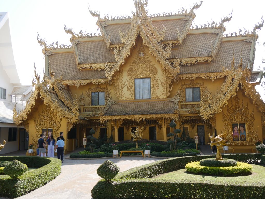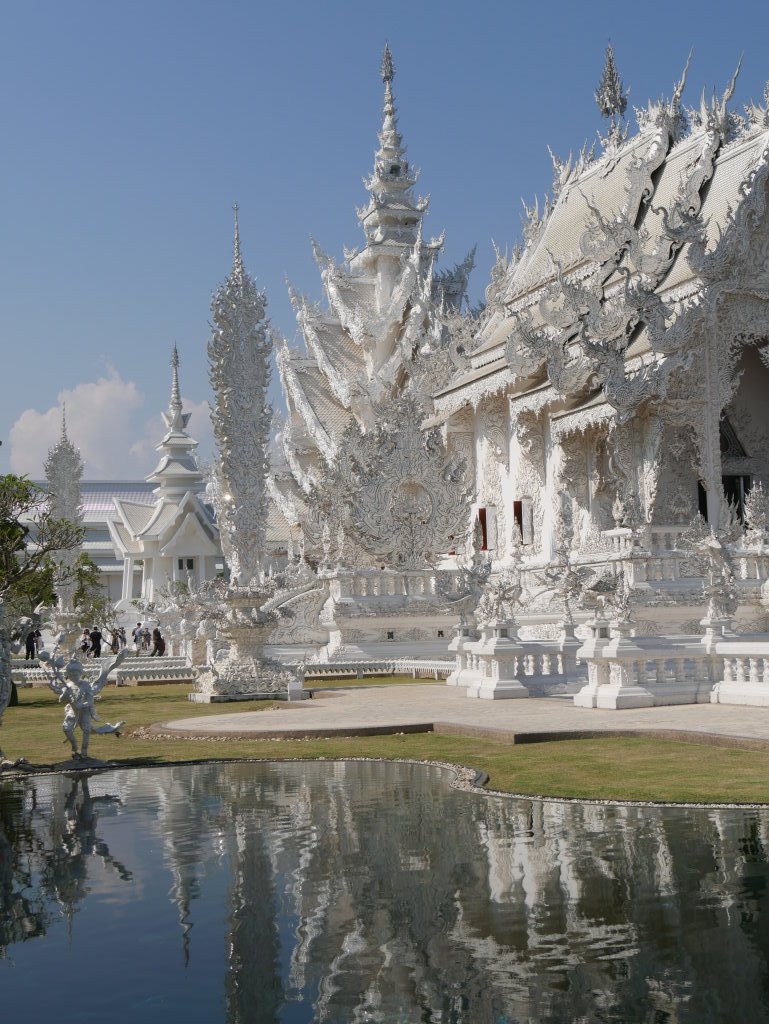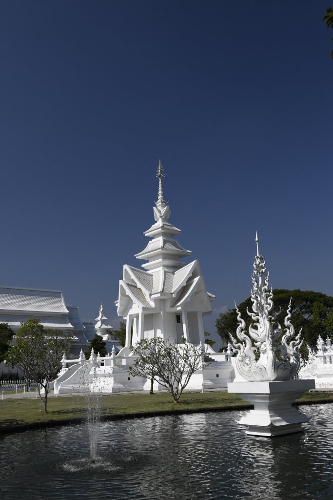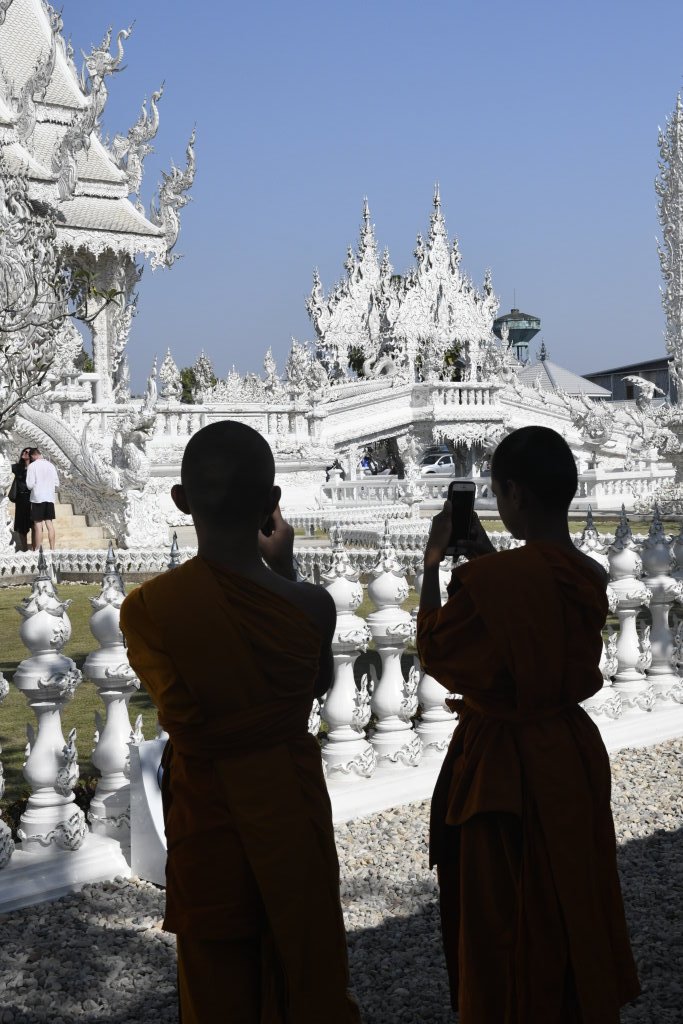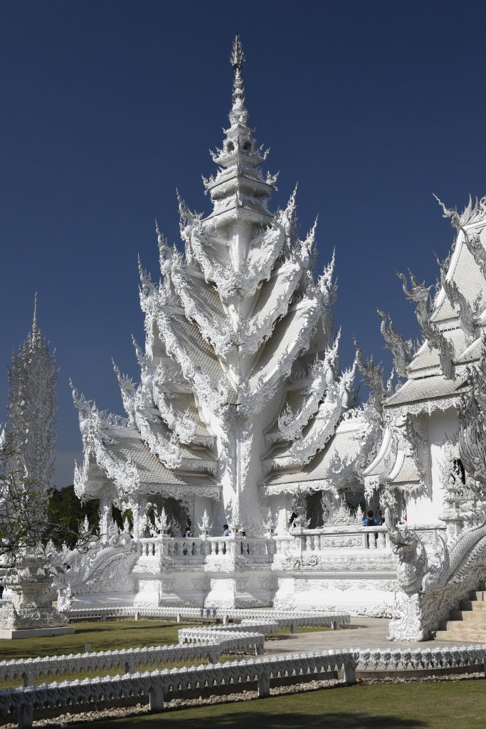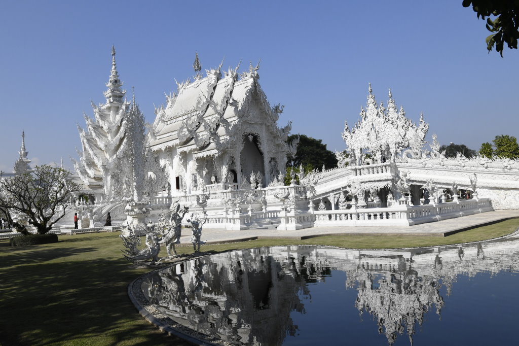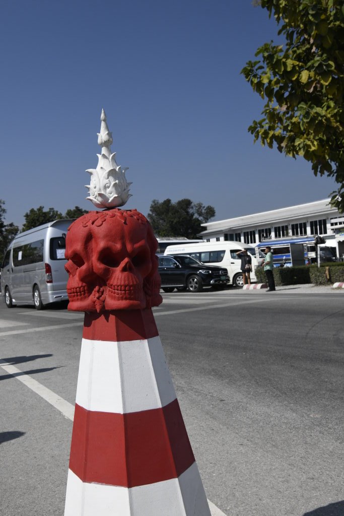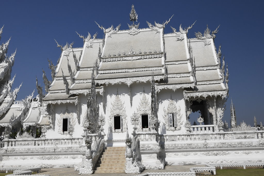 Wir waren am Vormittag von Chiang Mai in Richtung laotischer Grenze gestartet und hatten unterwegs noch einen Zwischenstopp am Wat Rong Khun in der Nähe von Chiang Rai eingelegt. Der strahlendweiße Gebäudekomplex ist allerdings keine buddhistische Tempelanlage im üblichen Sinn, sondern ein von dieser inspiriertes Gesamtkunstwerk, das von dem thailändischen Künstler Chalermchai Kositpipat auf den Ruinen des gleichnamigen Tempels konzipiert wurde. Es ist deshalb auch kein Widerspruch, wenn neben dem Eingang ein Tempelwächter eher einem Außerirdischen gleicht und auf einer Parkbank selfie-verliebte Besucher anlockt. Aus dem wirren Wurzelwerk vor einer Brücke vor dem Wihan strecken sich flehende Hände dem Besucher entgegen wie in einer Szene aus Pans Labyrinth von Guillermo del Toro.