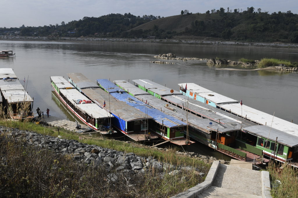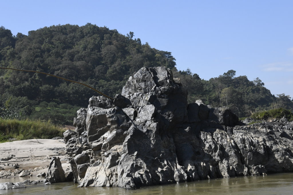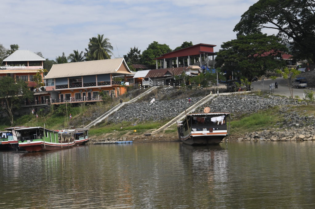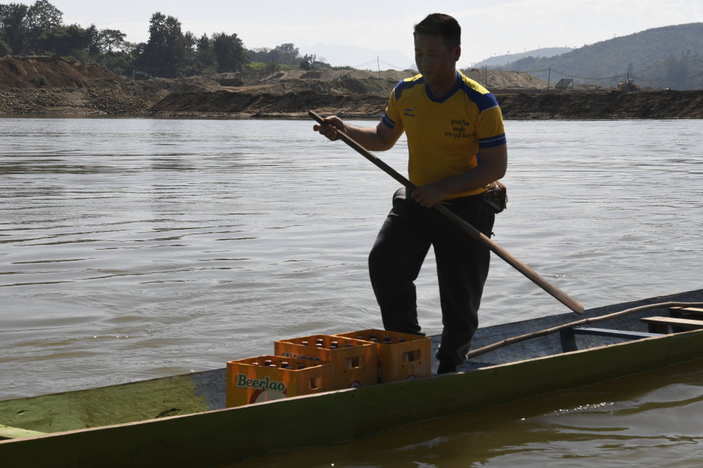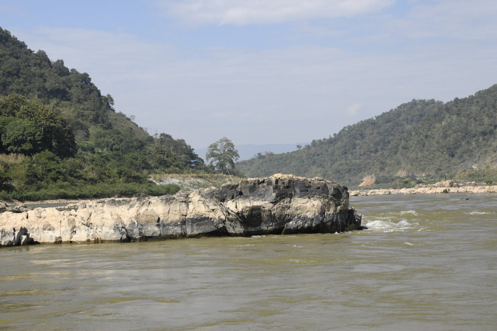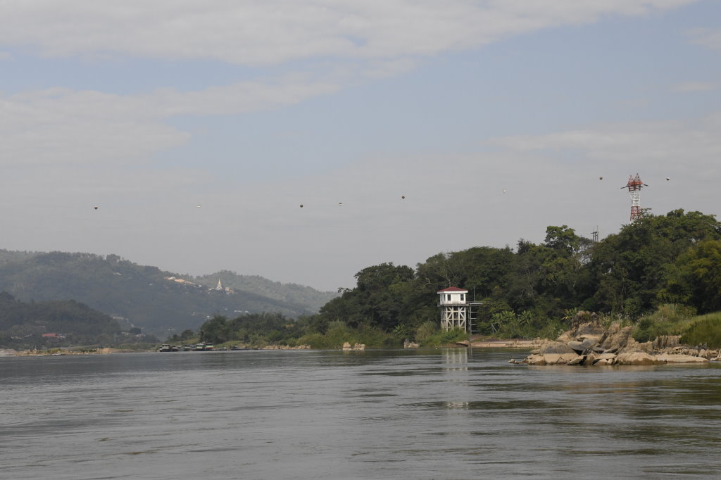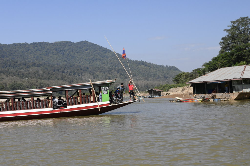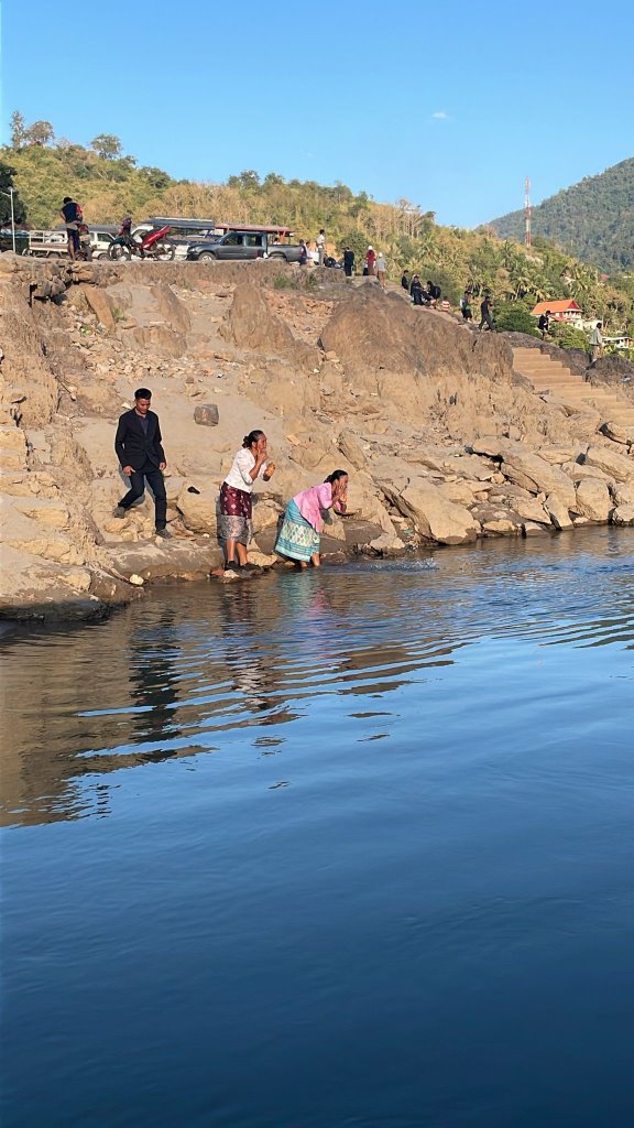 Um halb elf legen wir endlich ab und queren schon bald die Freundschaftsbrücke Nummer 4, über die wir gestern nach Laos eingereist sind. Besser noch als am Ufer lässt sich an den Felsen der Stromschnellen ablesen, dass der Wasserstand gerade wieder fällt.