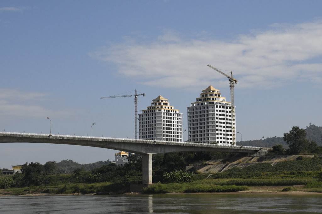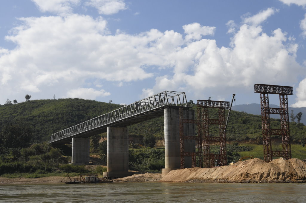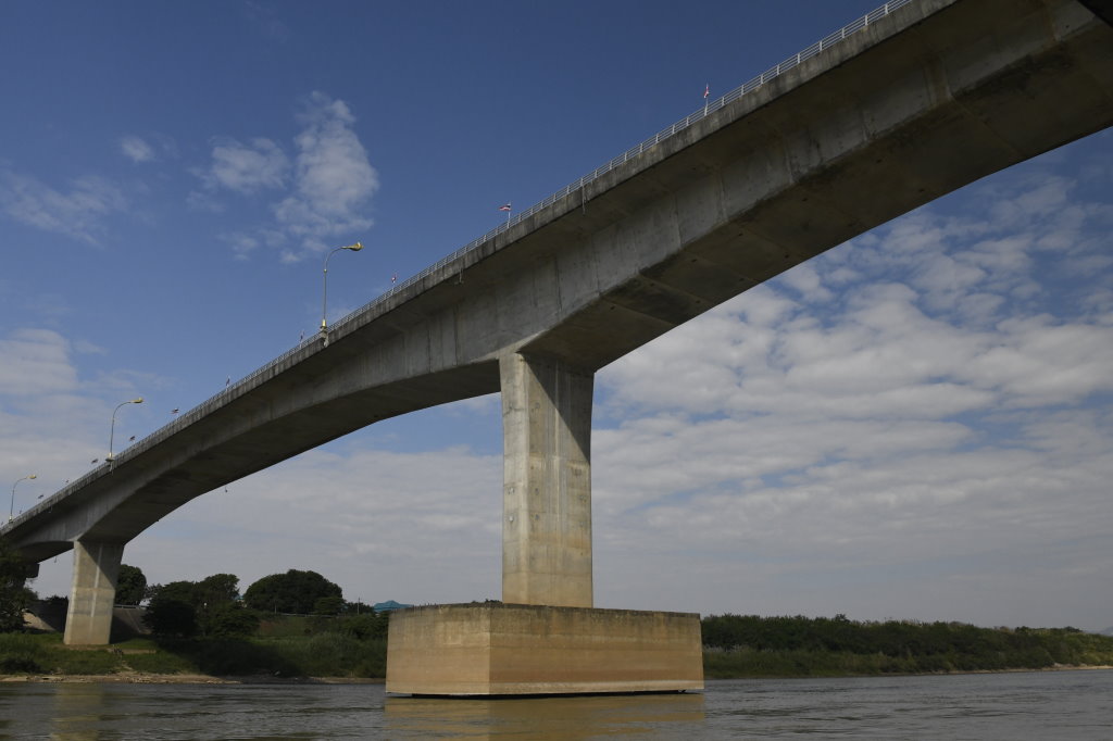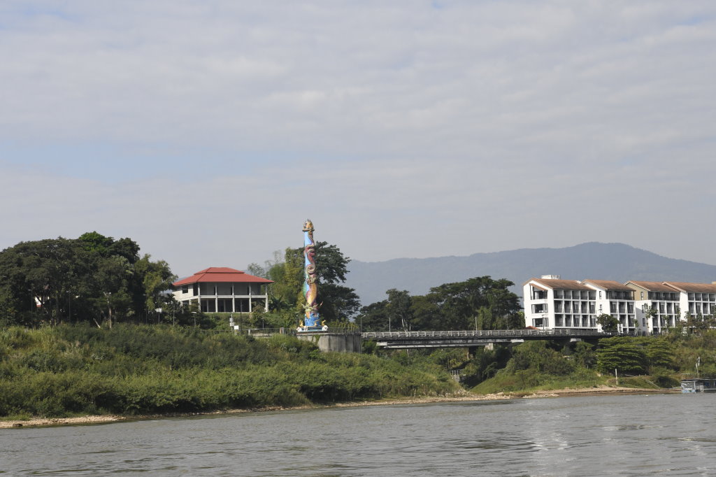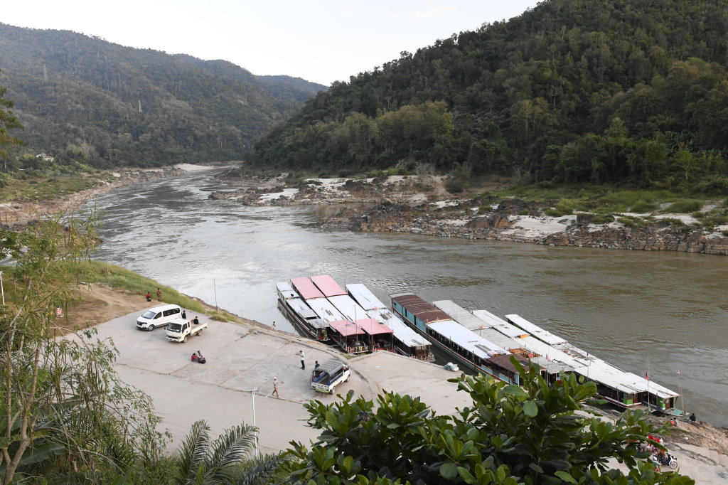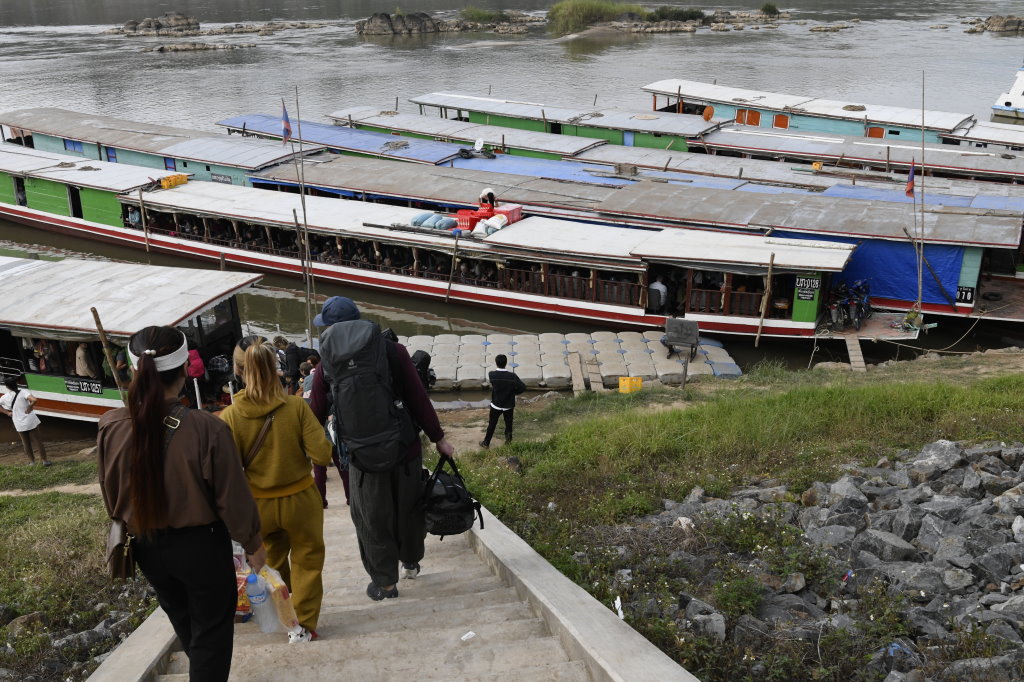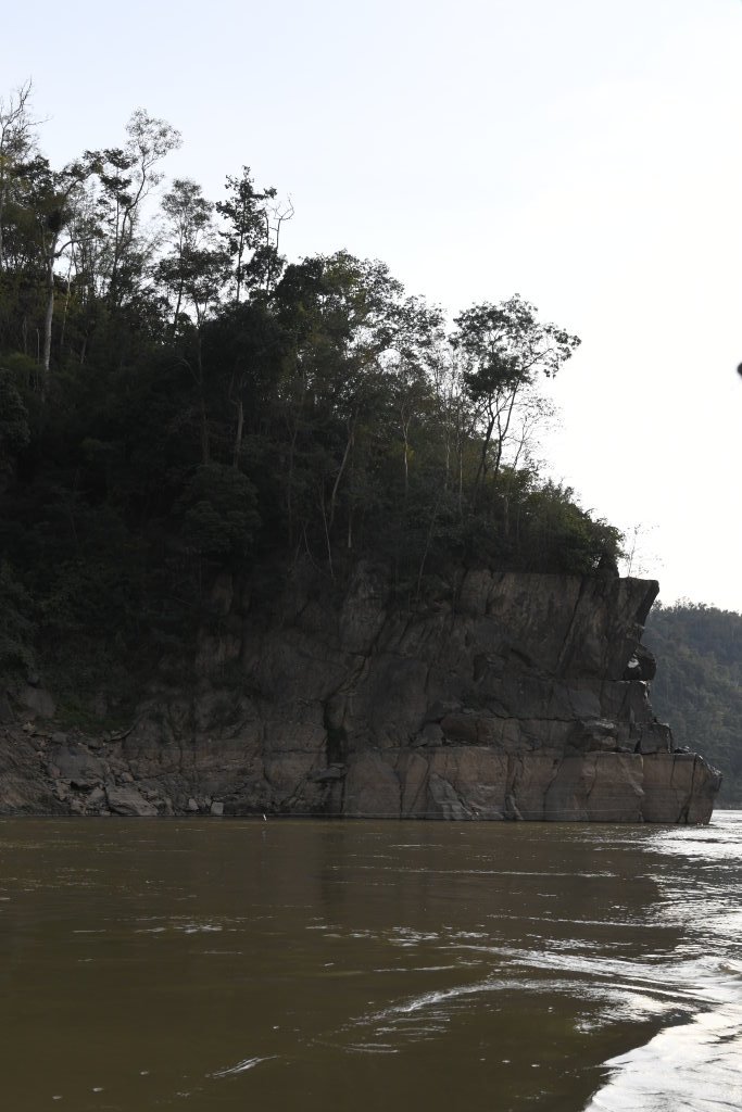 Um halb elf legen wir endlich ab und queren schon bald die Freundschaftsbrücke Nummer 4, über die wir gestern nach Laos eingereist sind. Besser noch als am Ufer lässt sich an den Felsen der Stromschnellen ablesen, dass der Wasserstand gerade wieder fällt.